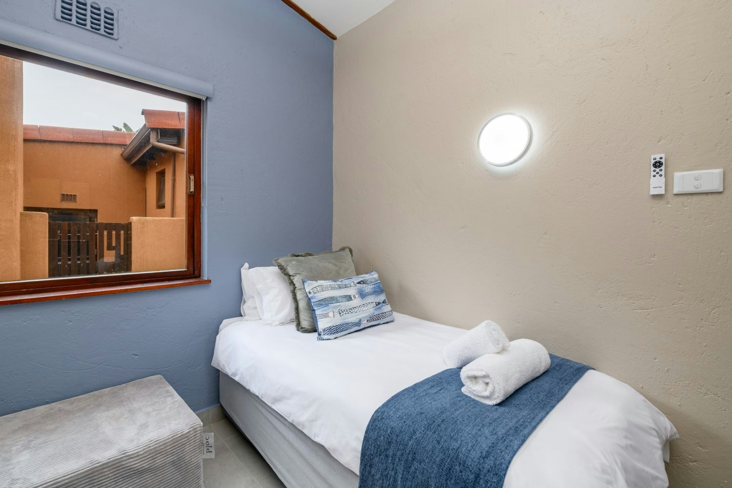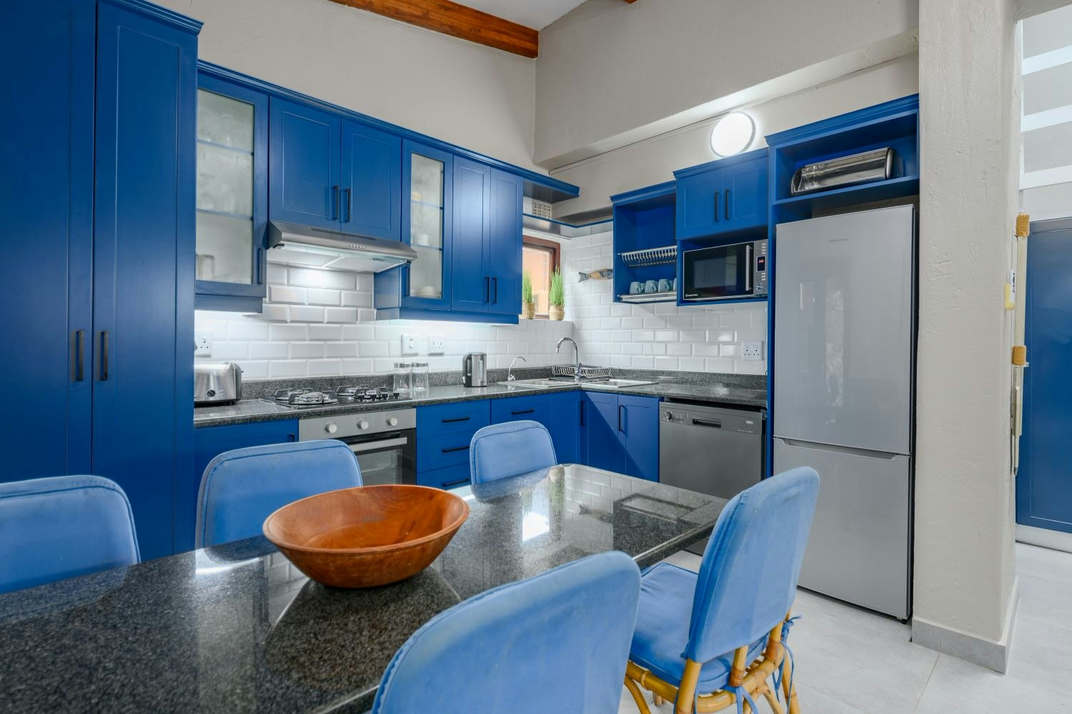This tastefully designed villa can accommodate 4 guests and comprises 2 bedrooms and 2 bathrooms. The main bedroom is furnished with a king-size bed and features an en-suite bathroom fitted with a shower-over-bath, toilet and washbasin. The second bedroom is furnished with 2 single beds and makes use of a bathroom fitted with a shower, toilet and washbasin. Quality linen and bath towels are provided, however, guests are required to bring their own swimming towels.
