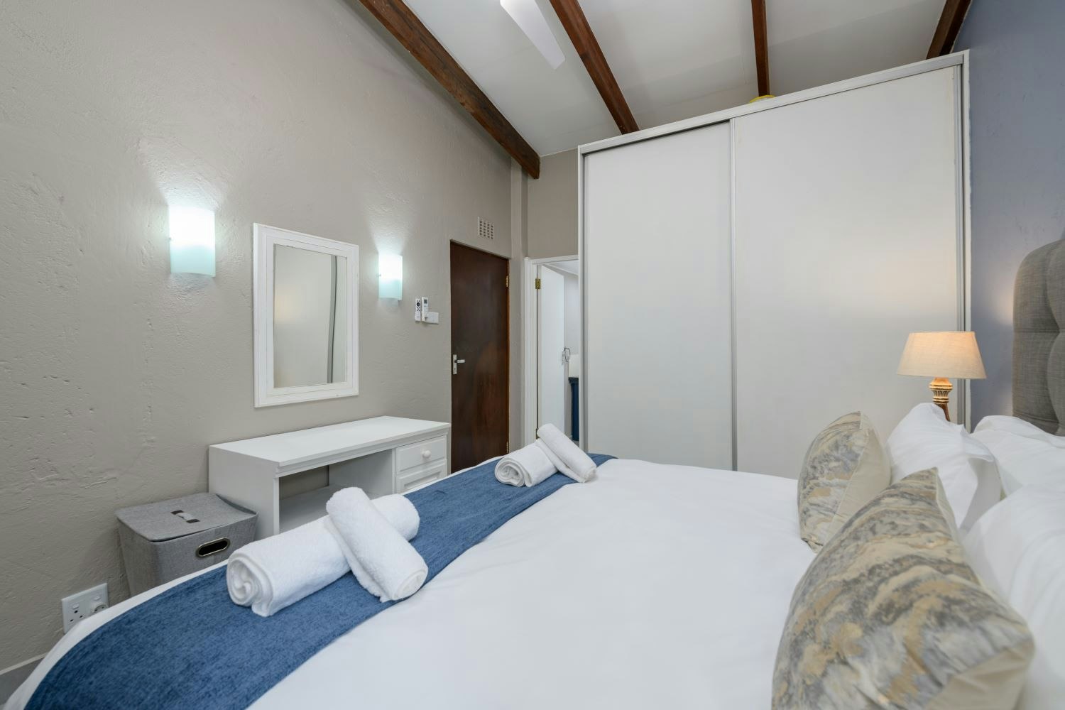 The living area features a lounge, a dining area and a kitchen. The kitchen is well-equipped with a gas stove, oven, microwave, fridge-freezer, dishwasher, washing machine, tumble dryer, tea- and coffee-making facilities and cutlery and crockery. The dining area is furnished with a dining table suitable for 6 guests. The lounge area is furnished with a comfortable couch, a coffee table and a TV with DStv.