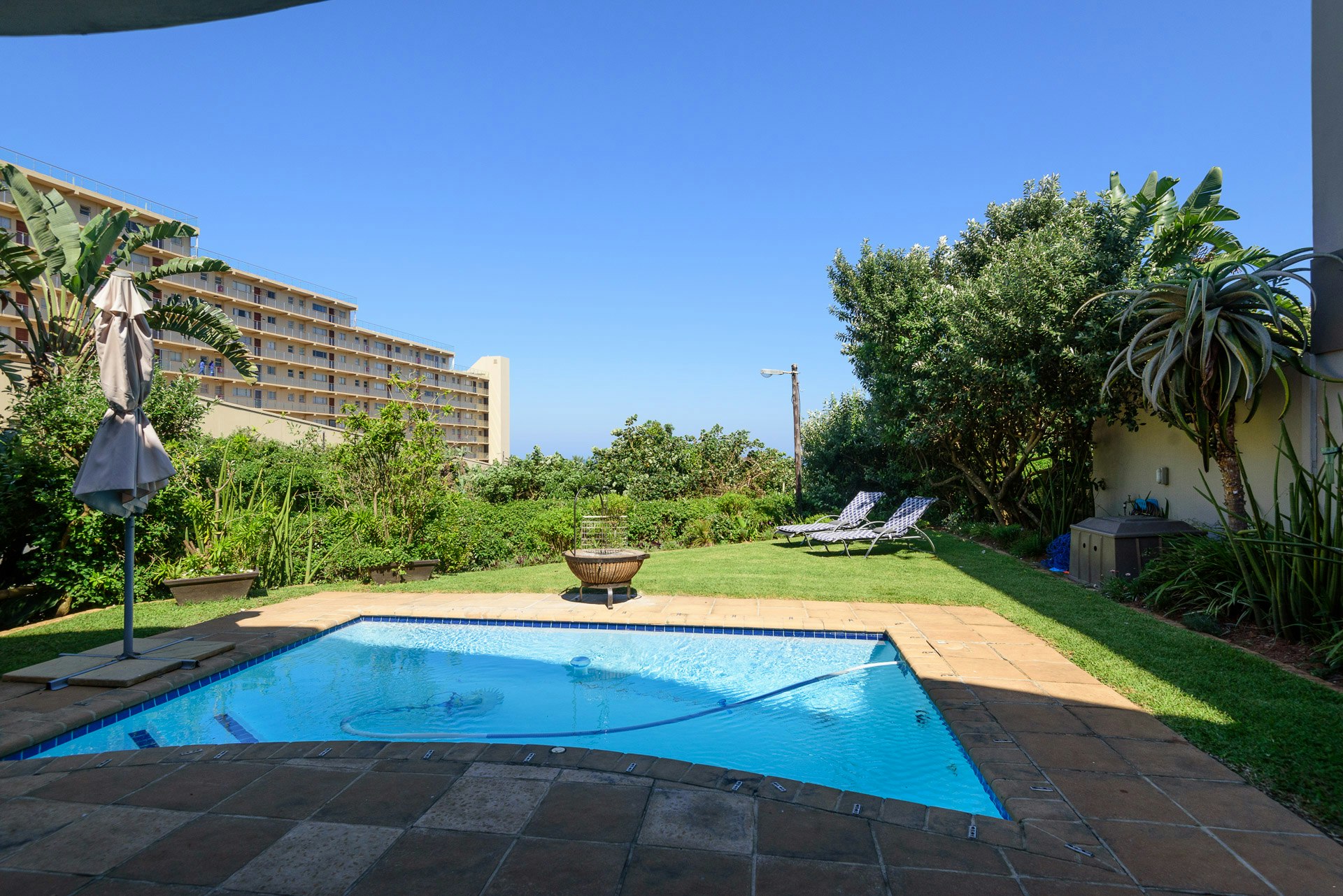 Outside, guests have access to a covered patio with outdoor seating, a gas braai, a private garden, and a private swimming pool. Guests also have access to a double lock-up garage and one allocated open parking bay.
