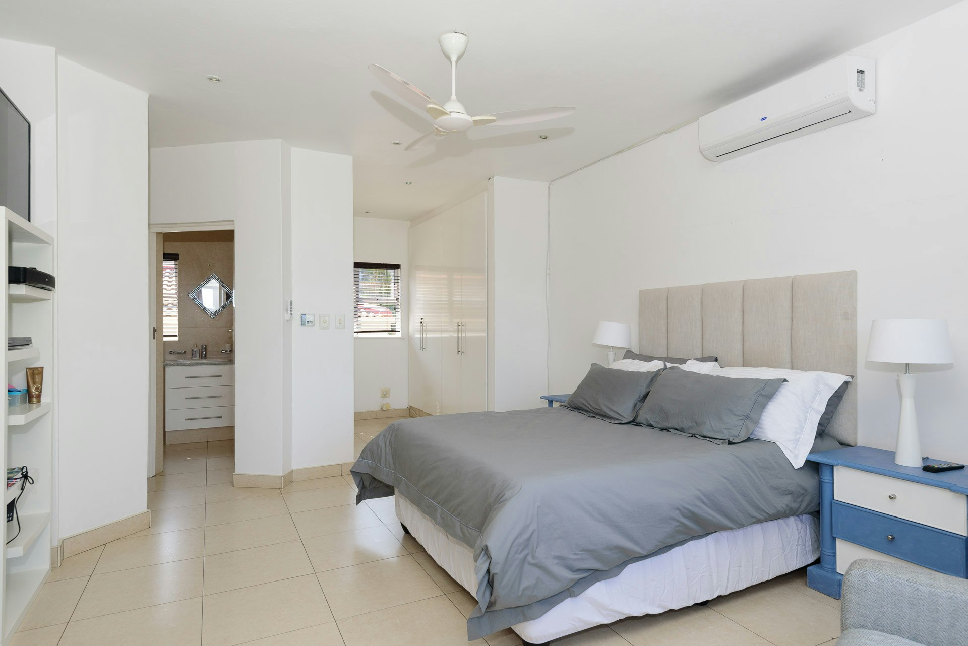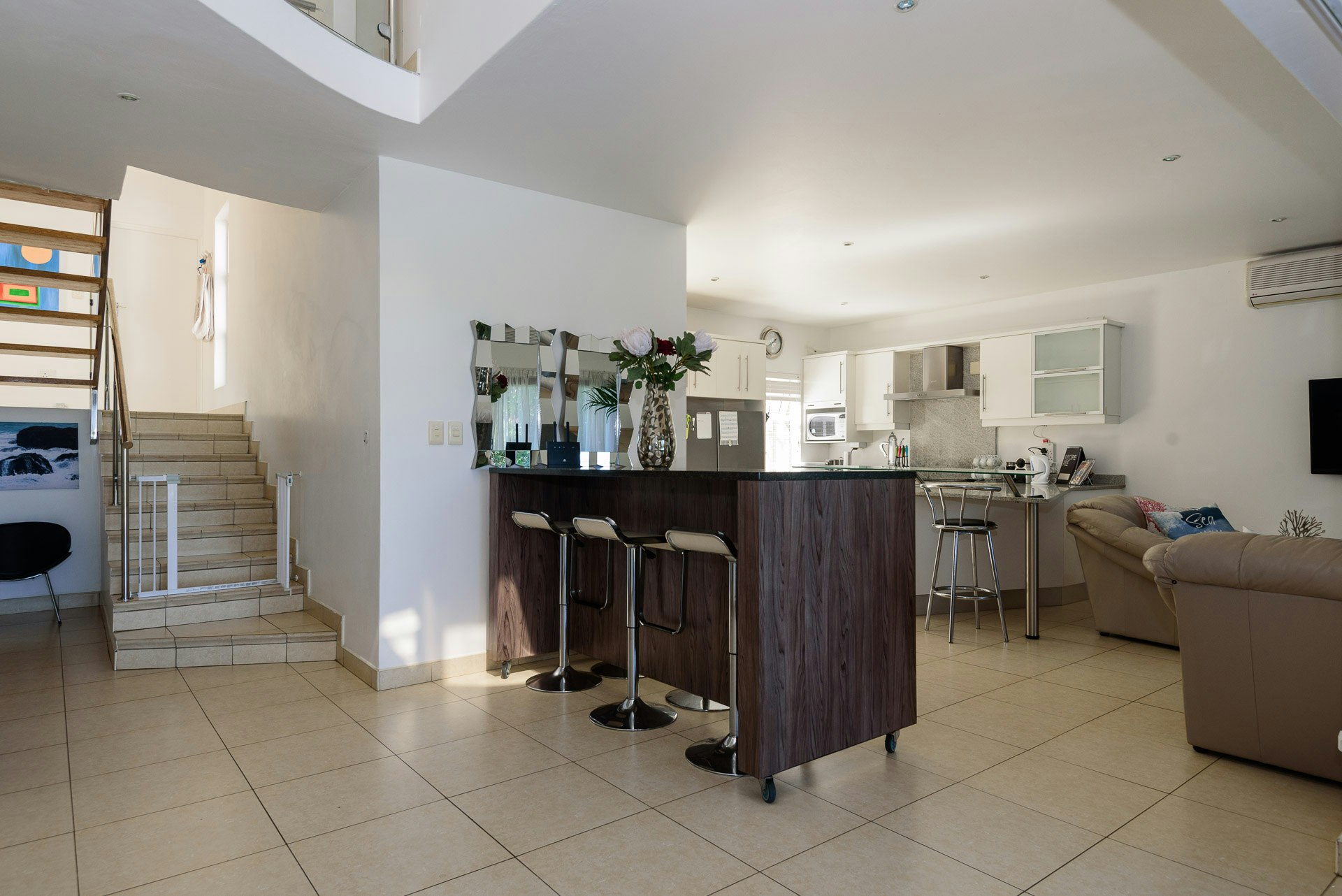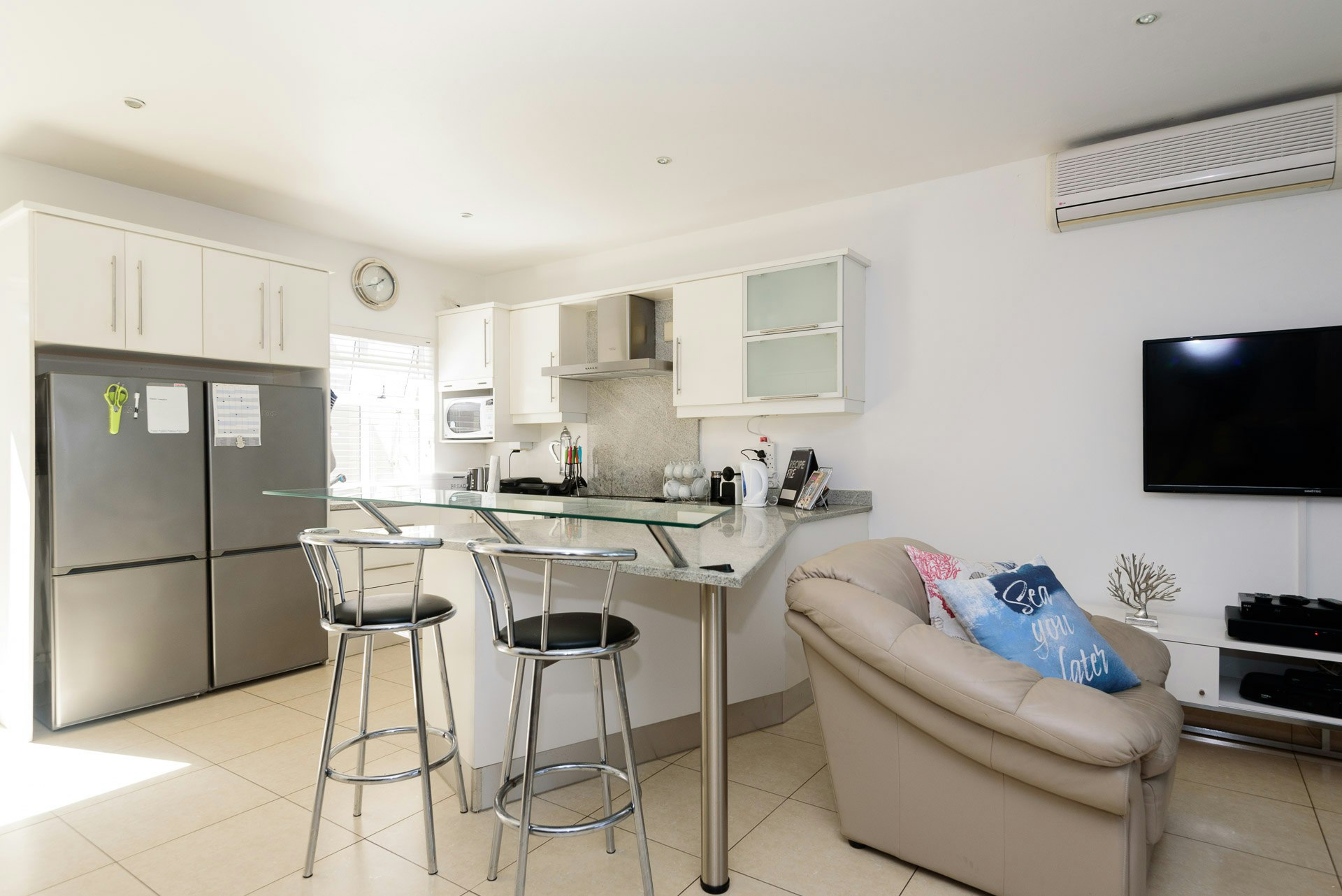 The open-plan, air-conditioned living area features a fully-equipped kitchen with a stove, oven, microwave, toaster, kettle, cutlery, and crockery, as well as a fridge-freezer, washing machine, and tumble dryer. A dishwasher is provided in the scullery. Guests can enjoy a meal at the central breakfast bar with stools. Leading from the kitchen is a lounge with comfortable couches and a TV offering full DStv channels. Access to free Wi-Fi is also available.