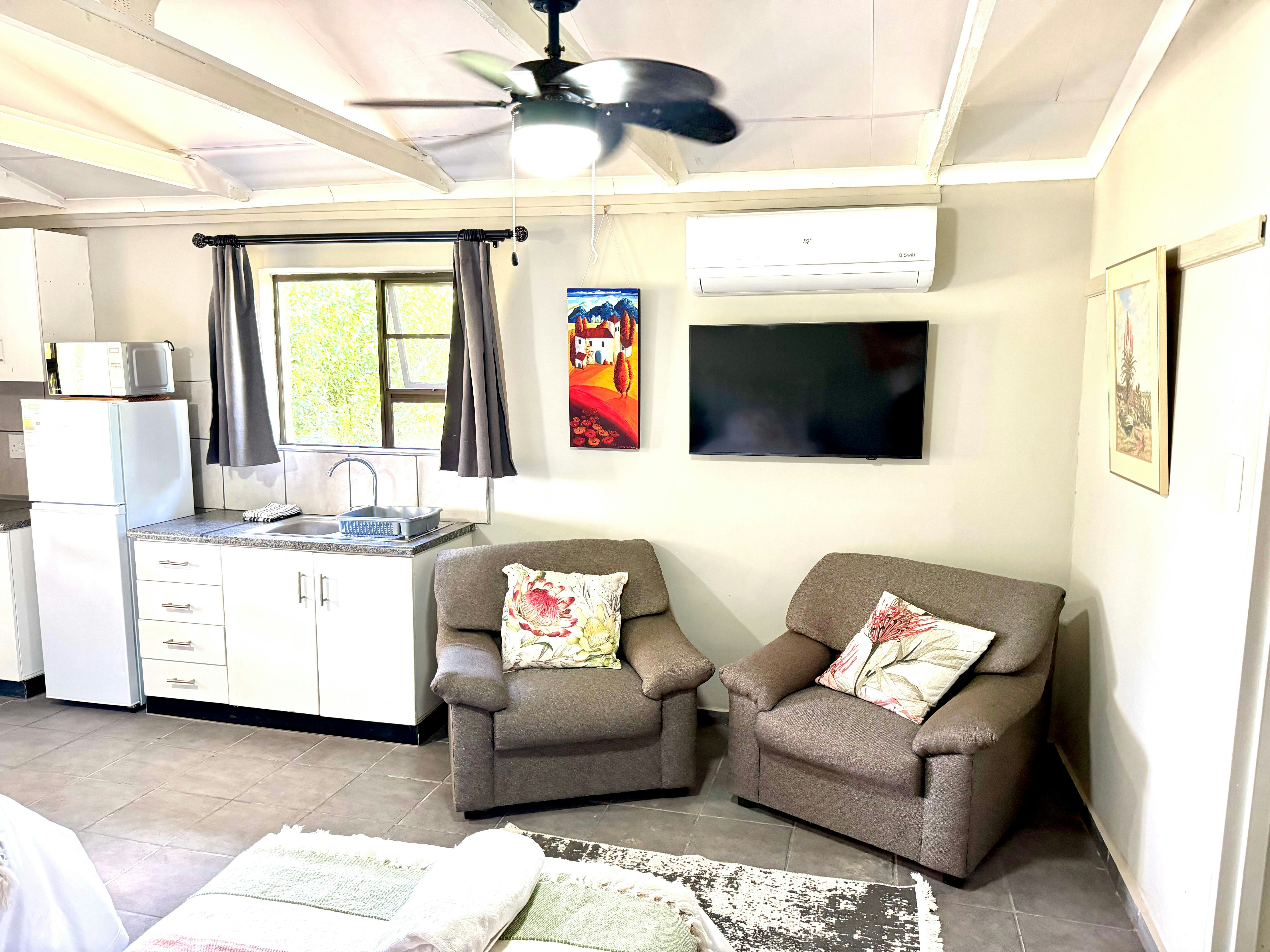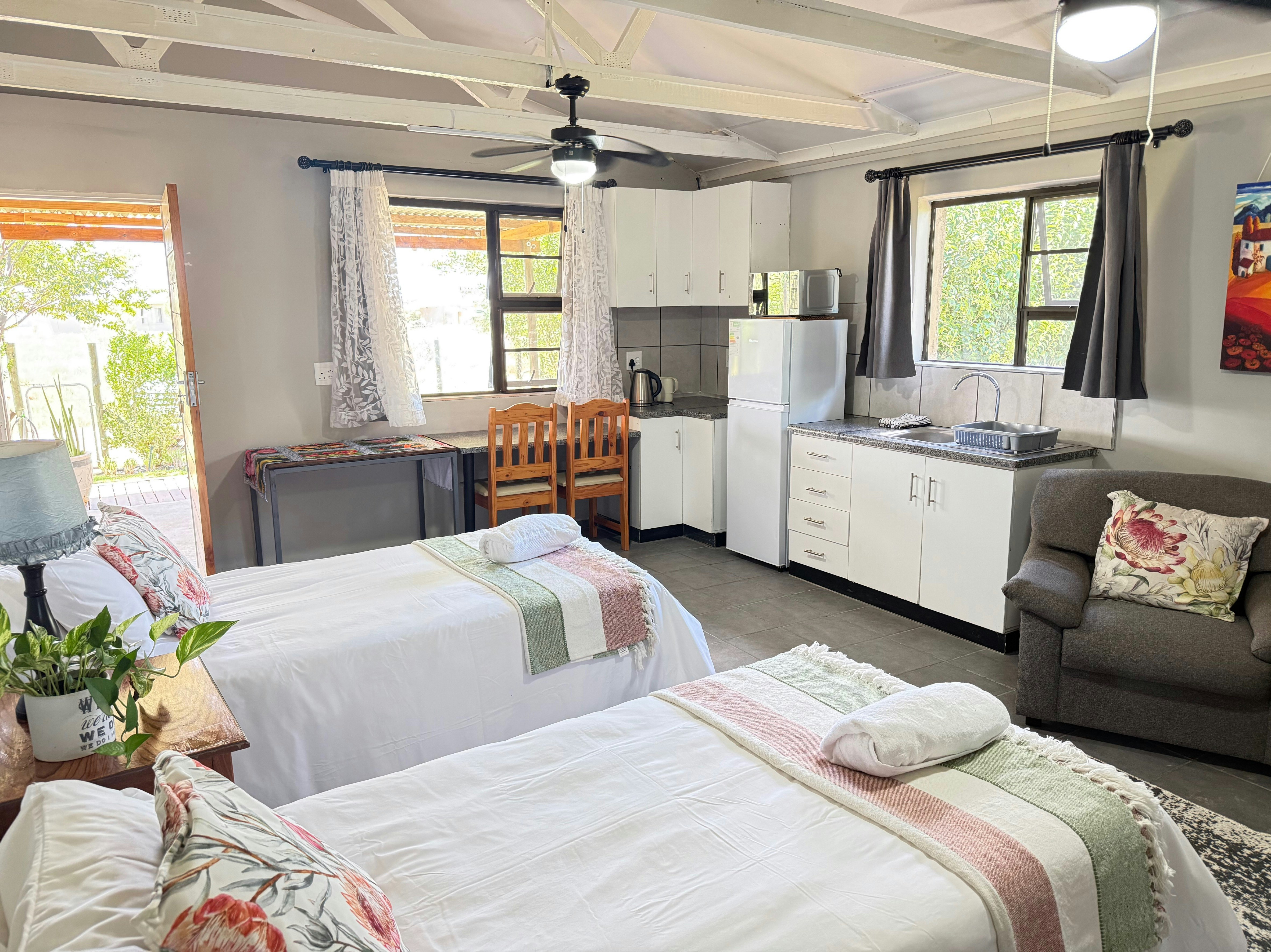 The open-plan living area includes comfortable seating, a dining table, and a well-equipped kitchen featuring a fridge-freezer, stove, oven, microwave, and coffee- and tea-making facilities. Outside, guests can unwind on the patio and make use of the braai facilities while enjoying scenic views of the surrounding farmland.