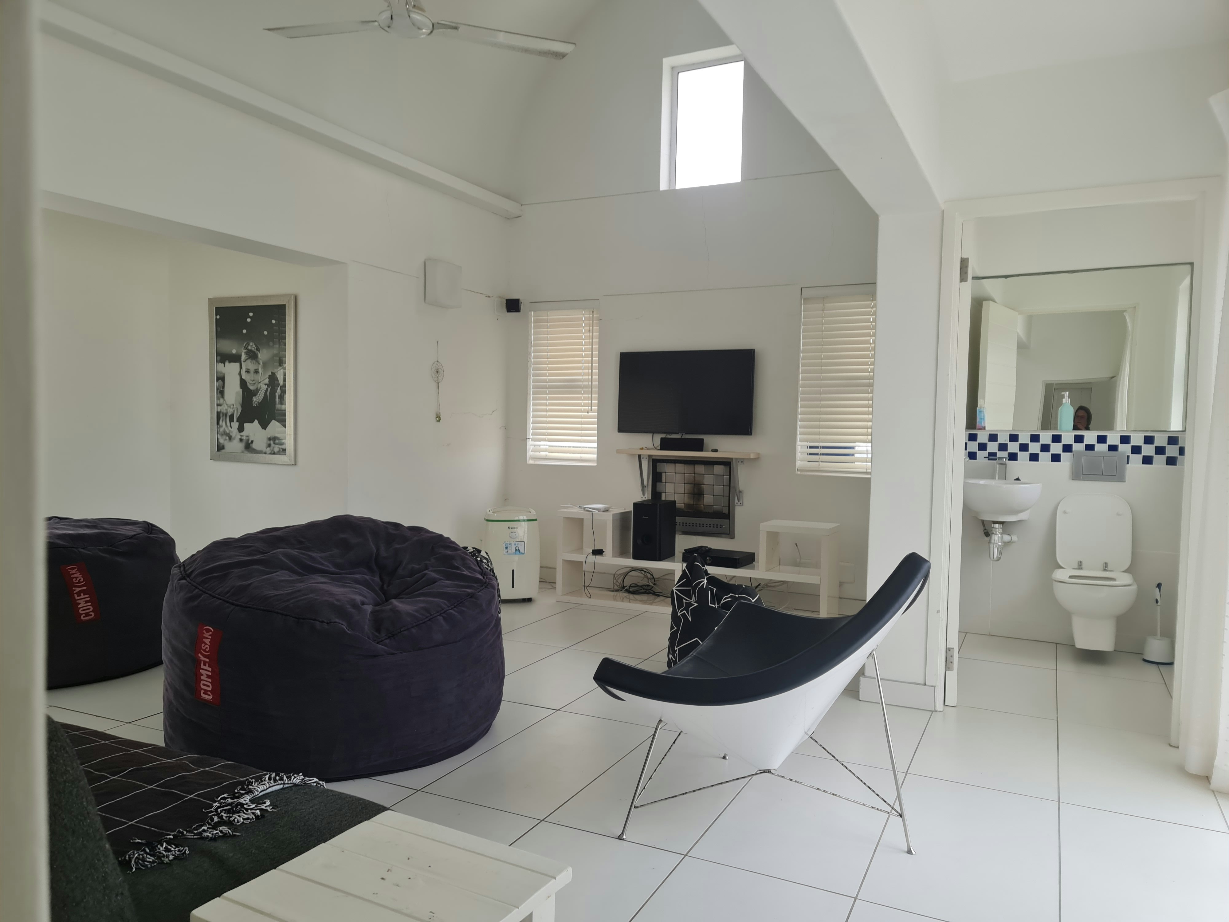 The living area is furnished with a wooden lounge suite. Stacking doors lead outside to the covered patio which has an outdoor dining table and braai facilities.