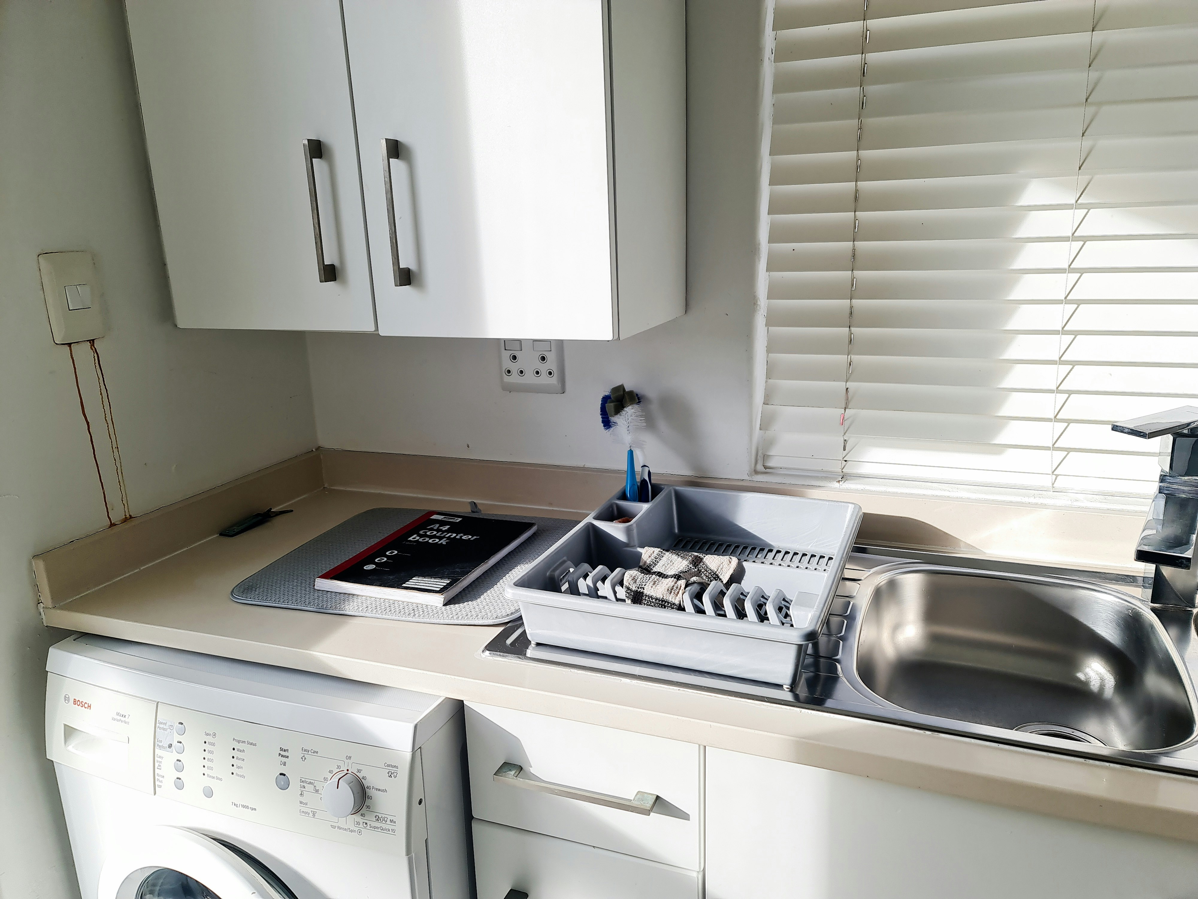 The kitchen is equipped with a fridge, gas oven, stove, microwave, kettle, basic cutlery and crockery. The kitchen counter also serves as a dining table.