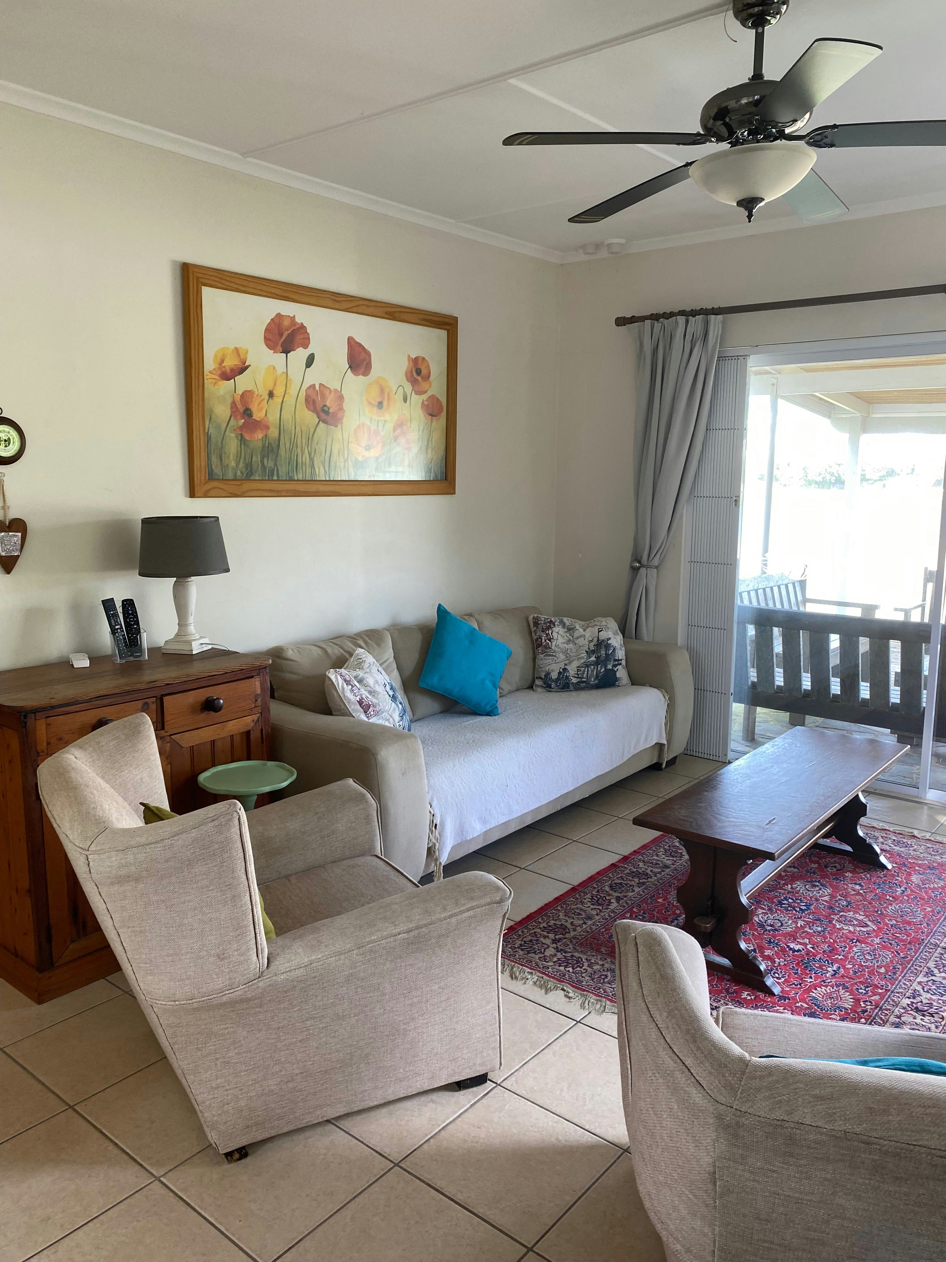 The open-plan living space features a dining table with chairs and a lounge furnished with comfortable couches and a TV with DStv. The kitchen is fully equipped with a fridge-freezer, stove, oven, microwave, and dishwasher. Guests can relax outside on the covered wooden deck and enjoy the river views. Secure parking, braai facilities, and free Wi-Fi are also available.