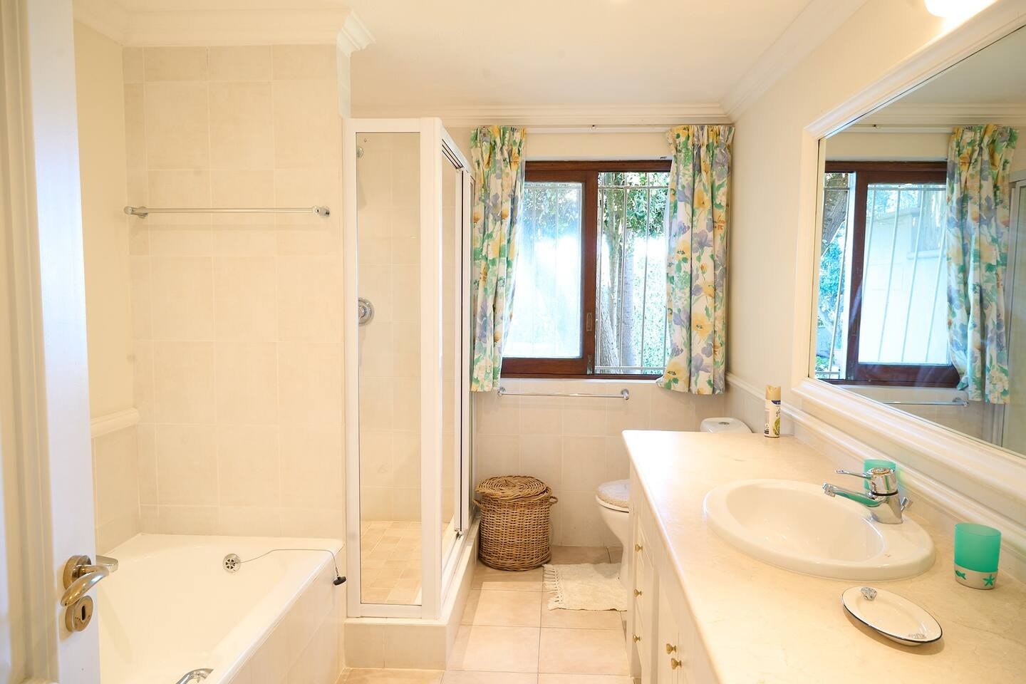 The spacious home accommodates up to 8 guests and comprises 4 bedrooms. The main bedroom is furnished with a king-sized bed and features an en-suite bathroom with a bath, shower, and toilet. The second bedroom has a queen-sized bed and also includes an en-suite bathroom with a bath and shower. The remaining 2 bedrooms, each with a queen-sized bed, share a bathroom fitted with a bath, shower, and toilet. Linen and bath towels are provided.