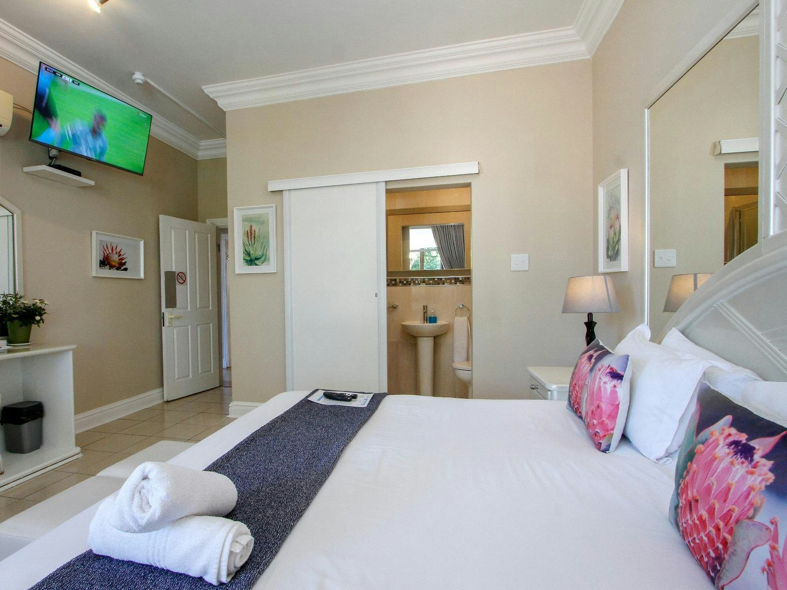 Each elegantly appointed bedroom features a private bathroom and air conditioning. Rooms are serviced daily and include a smart TV with DSTV, tea- and coffee-making facilities, a kettle, bar fridge, safe, hairdryer, and Wi-Fi access. Guests also have access to a communal kitchen, and a laundry service is available on request.