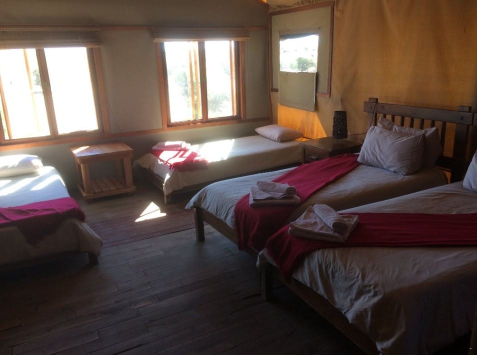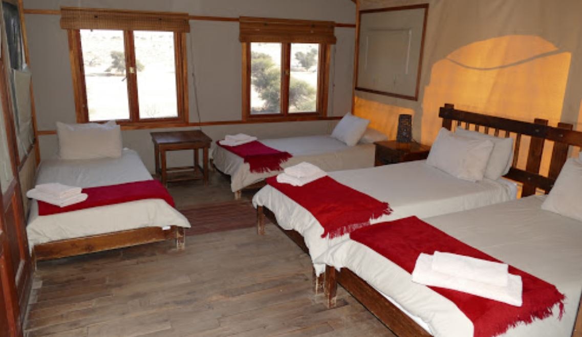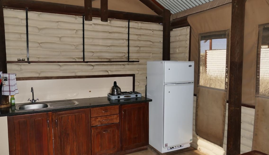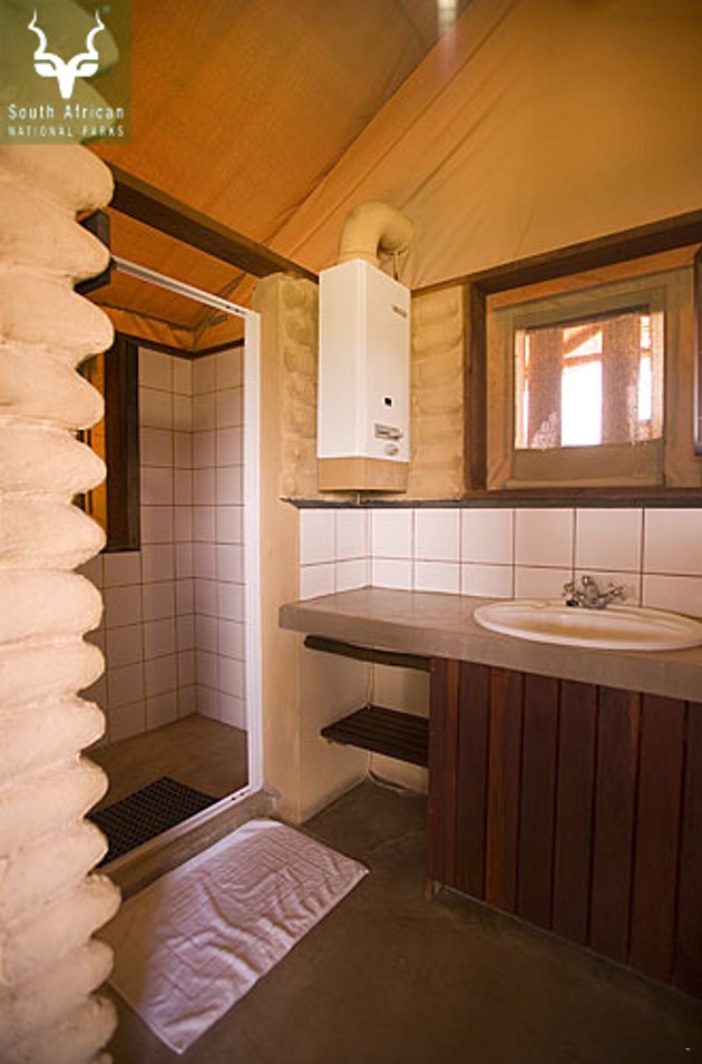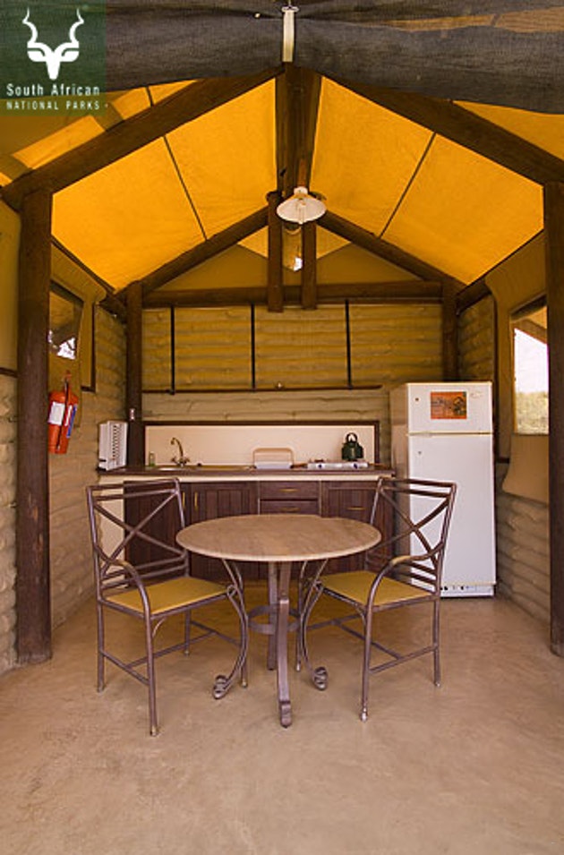 This exclusive getaway for the discerning visitor, boasts 15 Desert Tents each elegantly decorated with rustic finishes using wood, sand and canvas exteriors all in the resonate colours of the park. With 15 units it is by far the largest of the wilderness camps. The spacious stilted canvas tents look out on a waterhole in the ancient Auob River. Each unit has a large bedroom and bathroom with a separate tented kitchen. The kitchen is fully equipped with cooking utensils, cutlery, linen and fridge-freezer. Power in the camp is supplied by solar and gas, there are no conventional plugs.