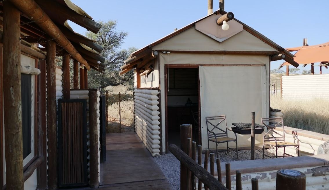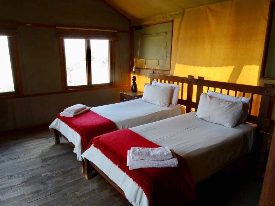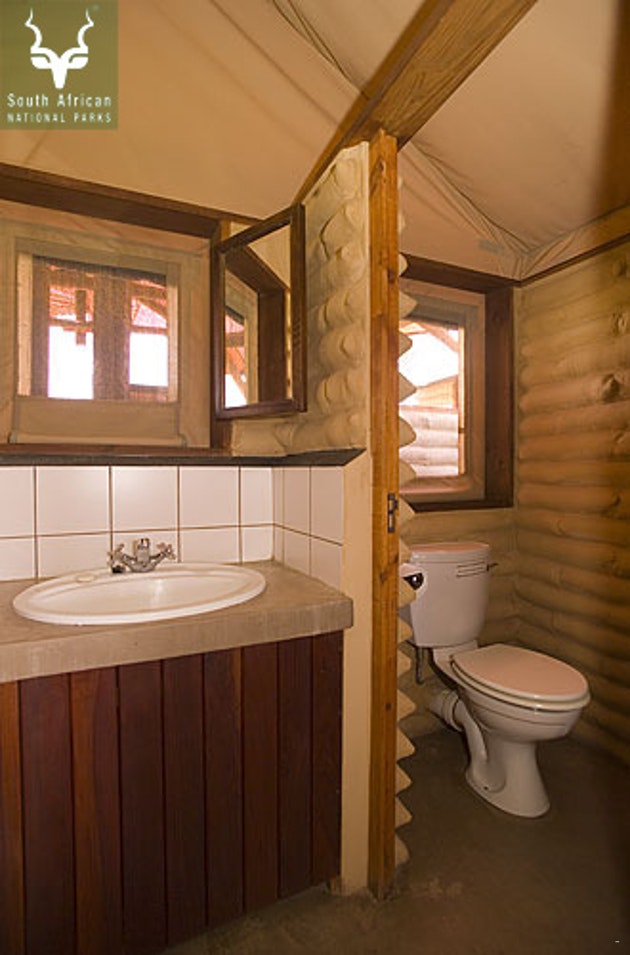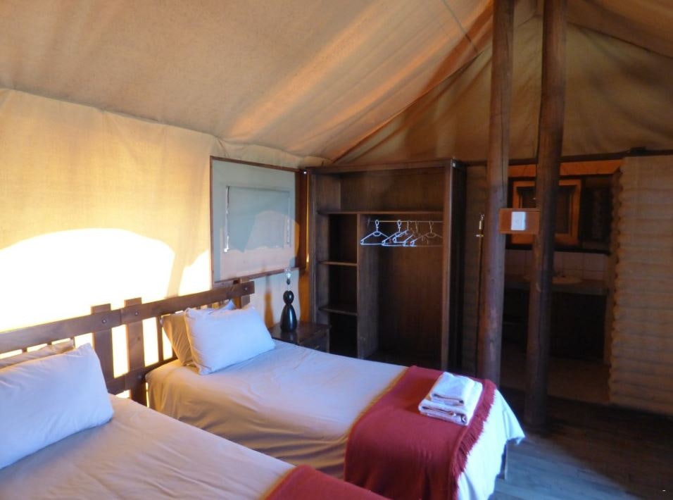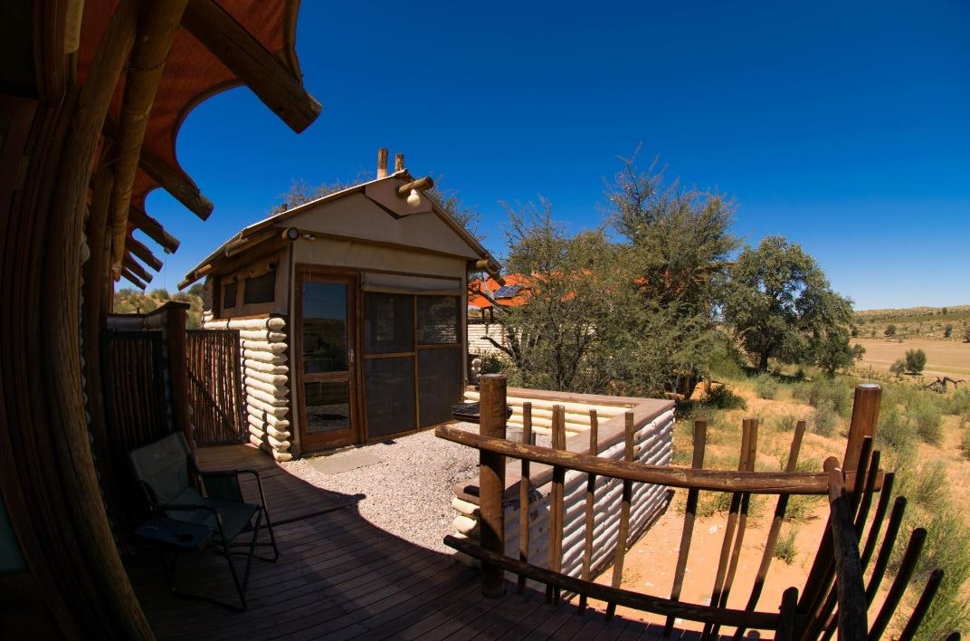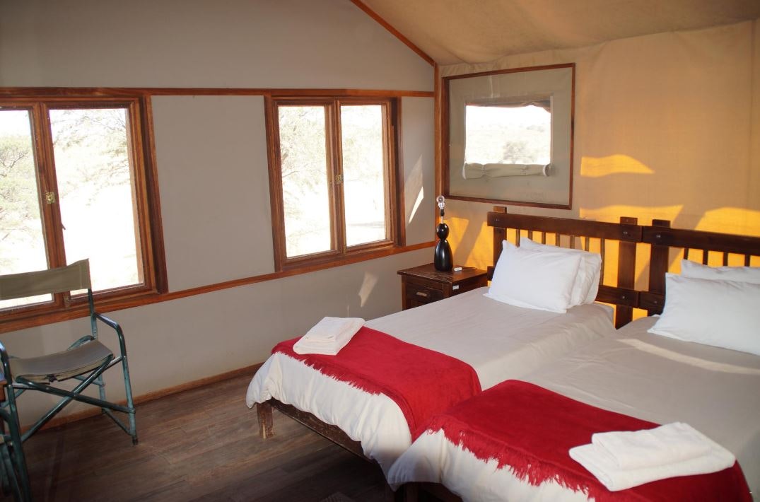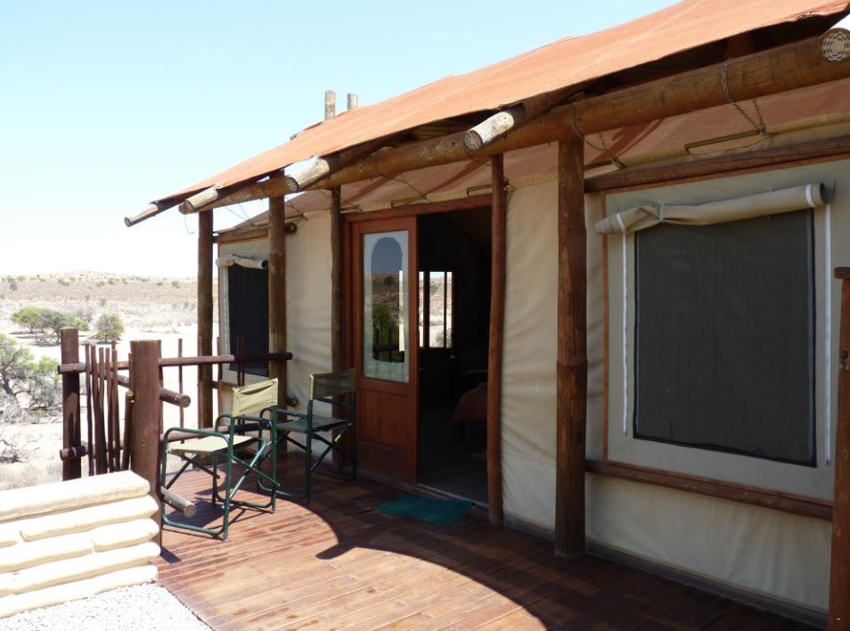 The camp is not fenced bringing the veld right to your door, and a Tourism Supervisor is on duty at all times. Sightings of plenty of giraffe are usually made in the vicinity. There is a swimming pool, surrounded by an elegant wooden tanning deck, to cool down in. The Kalahari Tented Camp also has a waterhole, and guided morning and sunset drives, as well as guided morning walks can be arranged from here.