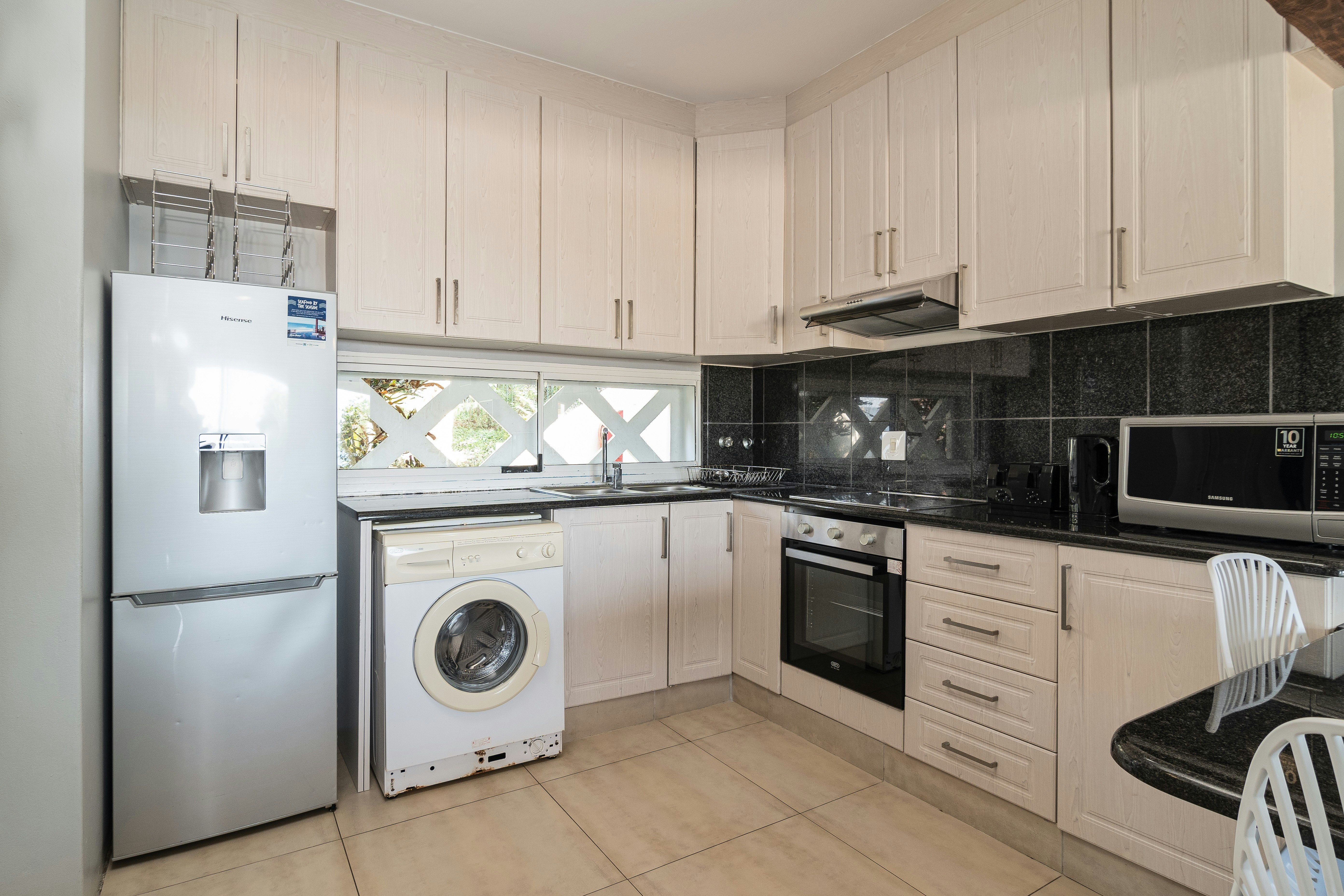 The open-plan kitchen is equipped with a fridge-freezer, stove, oven, microwave, basic cutlery, crockery, and tea- and coffee-making facilities, and features a breakfast island with stools. In addition, there’s a washing machine for guests’ convenience. It extends to the lounge furnished with comfy seating space and a TV with the DStv Stay Essential package. The unit has Wi-Fi for the guests' convenience.