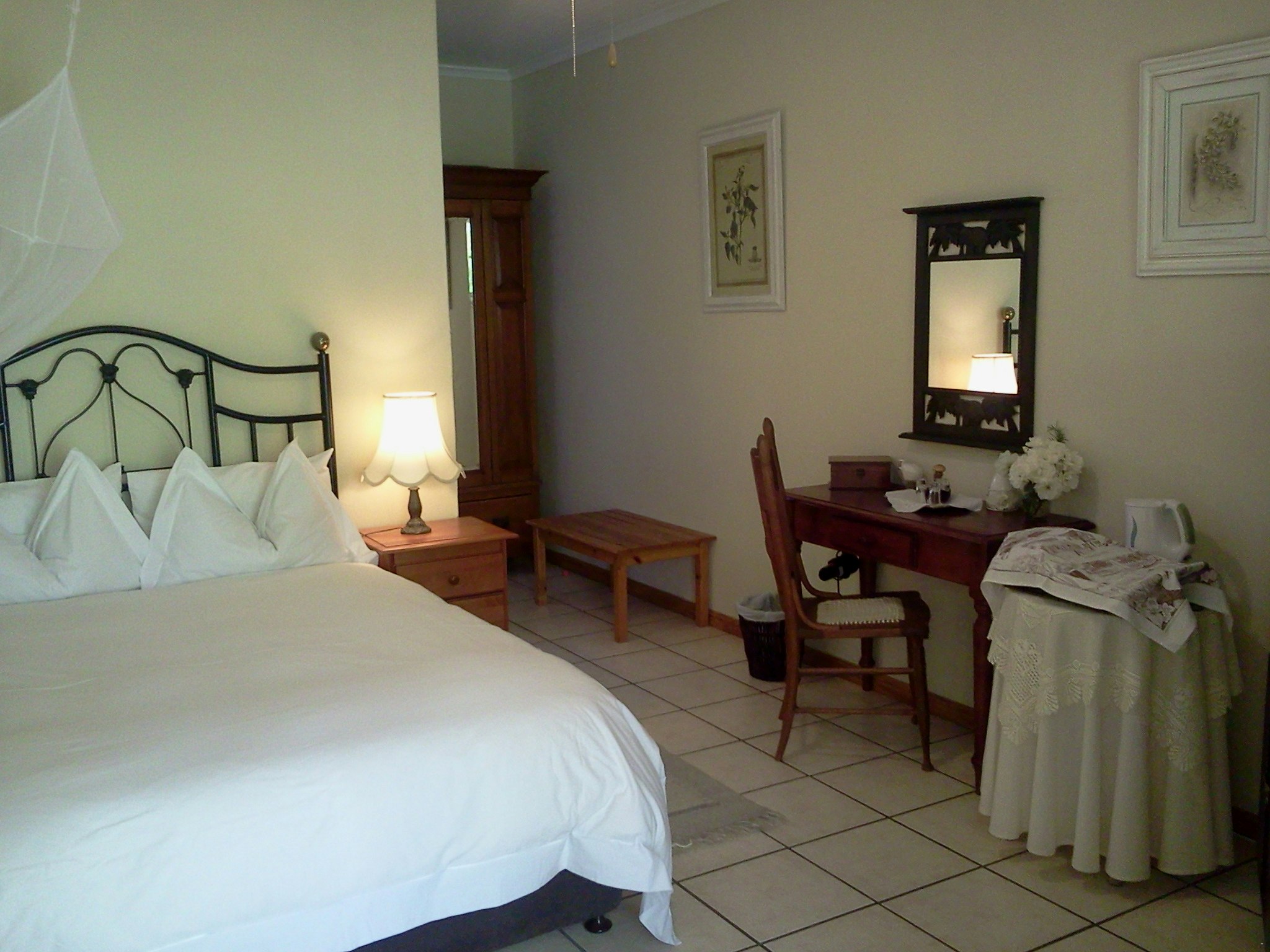 The air-conditioned Superior Double Room has a private entrance and comprises a four-poster king-size bed and an en-suite bathroom with a shower, Victorian slipper bath and complimentary amenities. Other features include pure cotton linen, electric blanket, safe, hairdryer, TV with selected channels, bar fridge, tea- and coffee-making facilities. There is a seating area inside the room as well as outside on the patio.