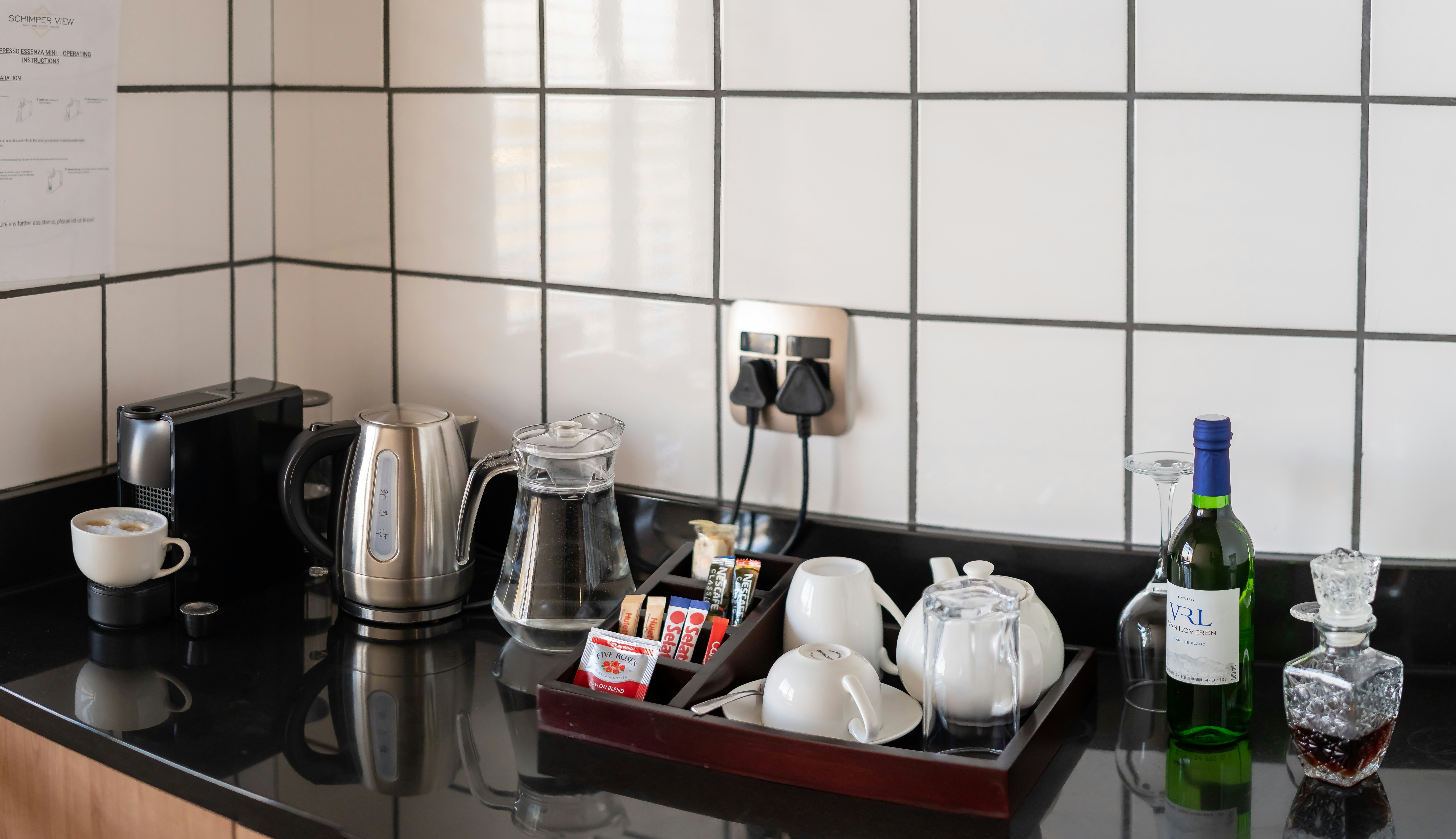 Accommodation is offered in 6 guest rooms that each contain a king-size bed that can be converted to 2 single beds and their own en-suite bathroom facilities with complimentary bathroom amenities, bathrobes and slippers. Each room has a kitchenette with a bar fridge, Nespresso coffee machine, and tea- and coffee-making facilities. Room amenities include a Smart TV with Netflix, a hairdryer, air-conditioning, and complimentary Wi-Fi internet access.