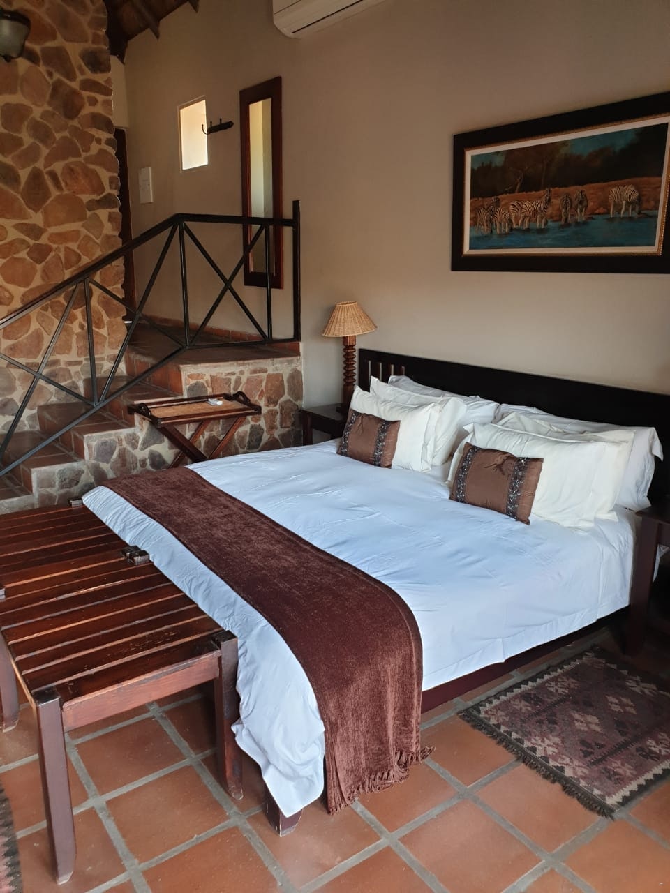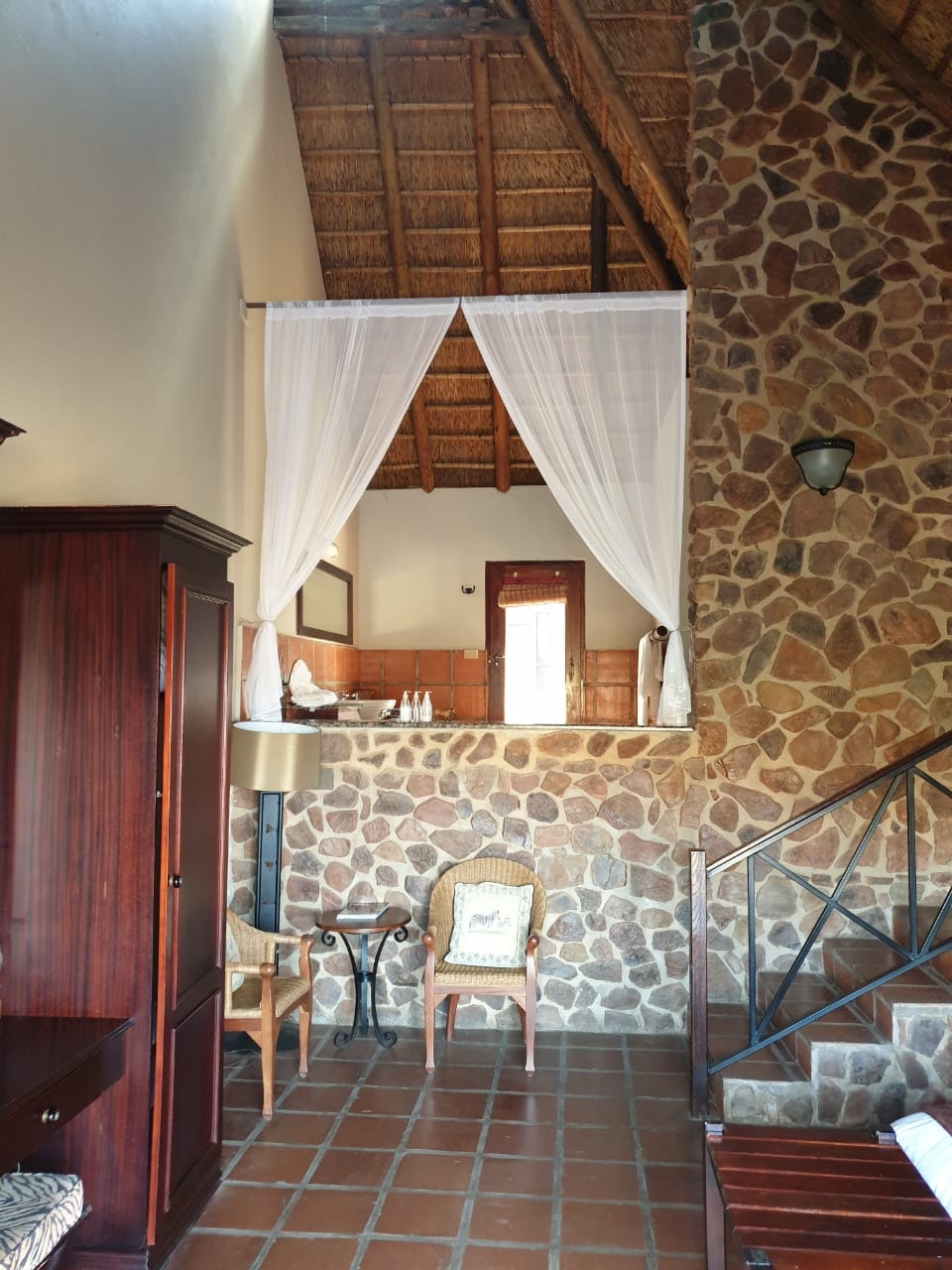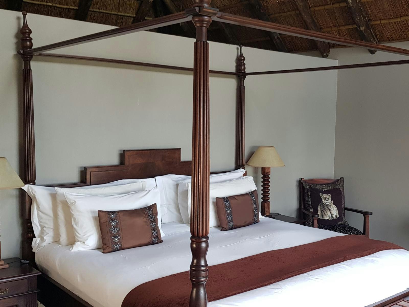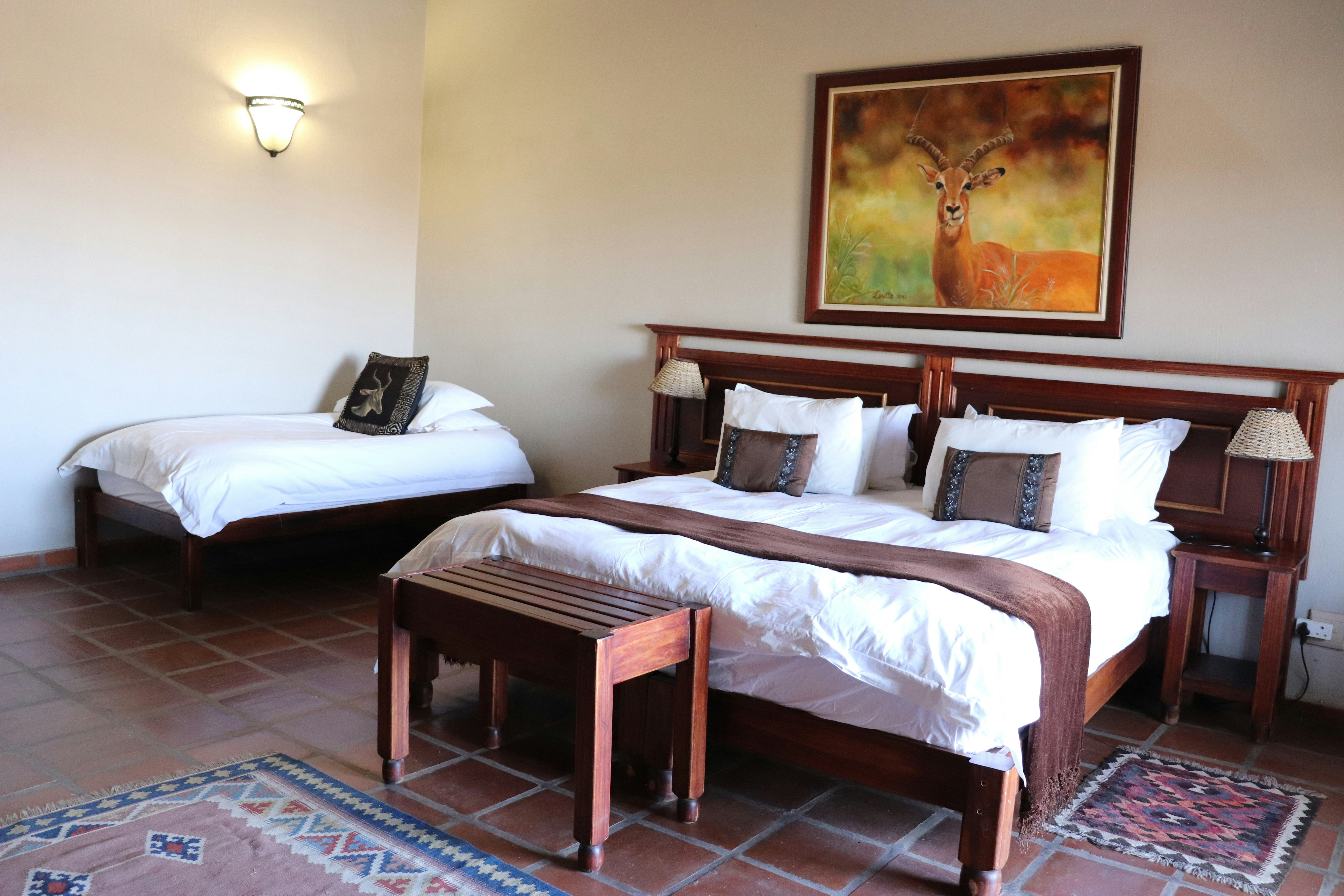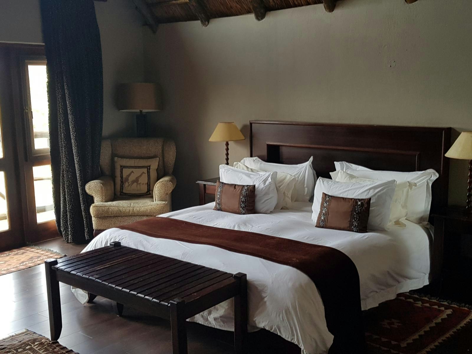 Inside the lodge is a reception area, a dining room, several comfortable sitting areas with open fires and a well-stocked bar. Outside on the decks are dining and lounging facilities, with a wonderful view of the hills, bushveld and the waterhole. The communal Jacuzzi is available for guests to use and is situated next to the gym. Sit and relax with a nice drink and watch the many birds or see the nyala, sable antelopes, buffalo and much more pass by. Downstairs are a swimming pool table and dartboard for your entertainment. The lodge area offers Wi-Fi. A game drive is included, and additional game drives can be booked.