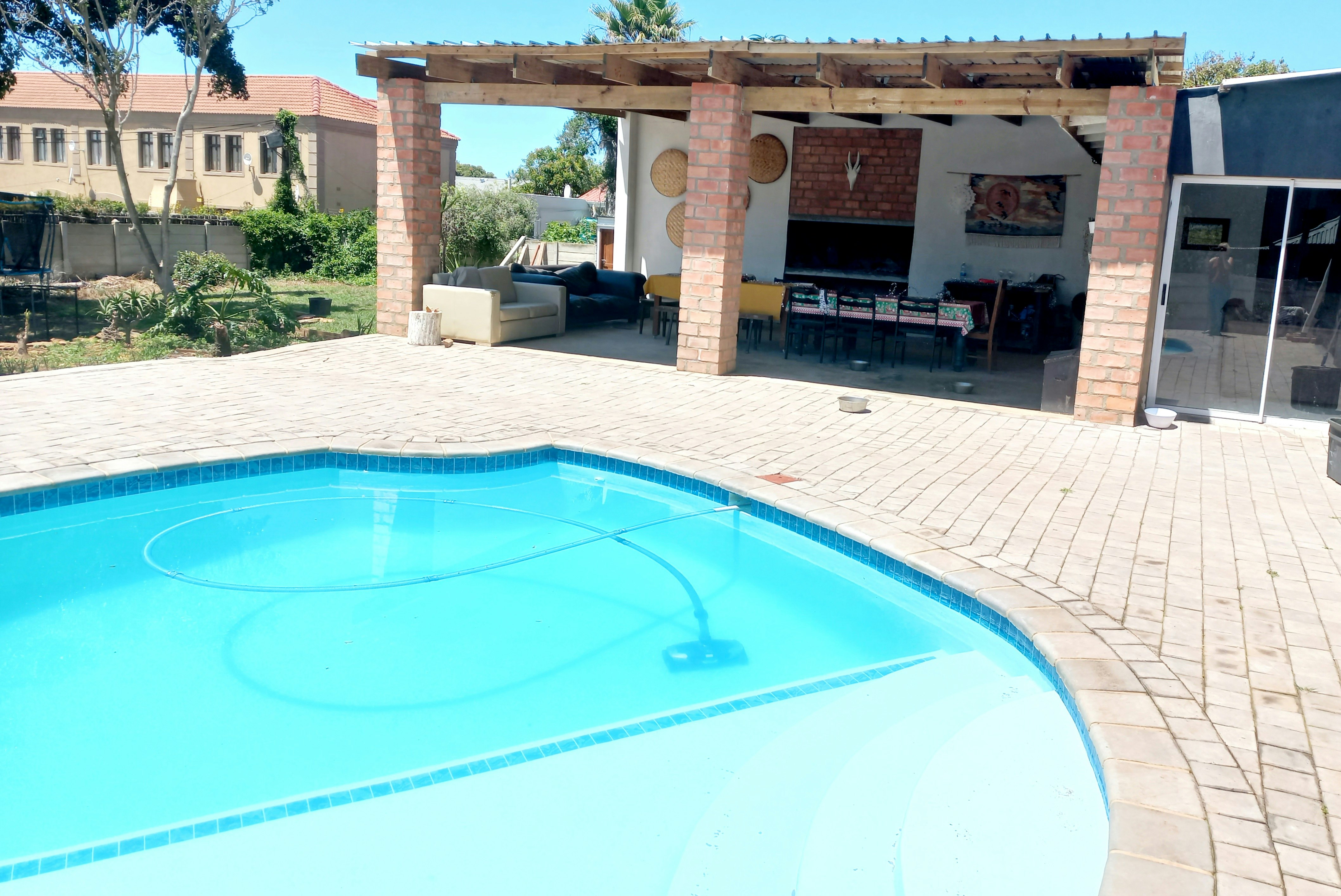 The living area opens up onto a covered verandah, which features a dining area, comfy seating, a built-in braai, and a pizza oven. Guests can enjoy a dip in the swimming pool, a picnic in the garden, or have fun on the trampoline. Access to secure parking is also available.