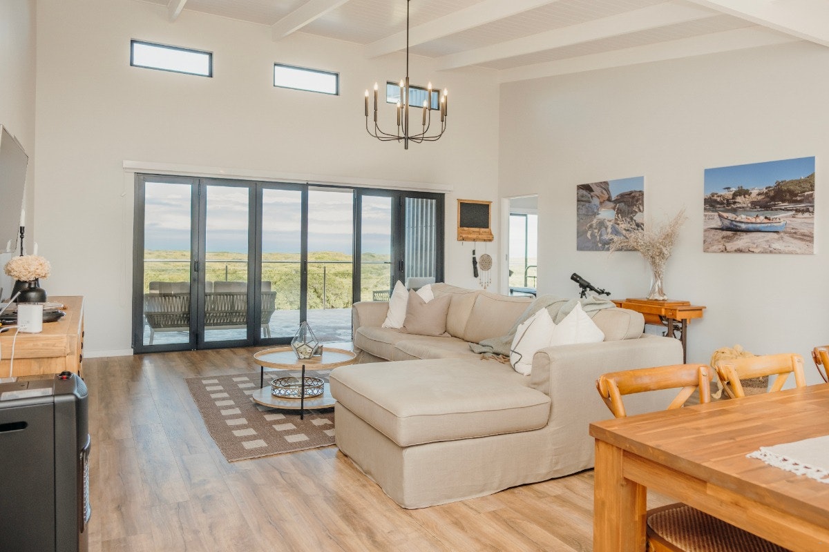 The lower-level entertainment area offers a built-in wood-burning braai, drinks fridge, and dishwasher, as well as ample comfortable seating and a dining area for shared meals. Whether you’re enjoying a morning walk on the beach, relaxing on the patio with ocean views, or spending quality time with loved ones, Sea Mist Villa provides the perfect setting for rest and relaxation. Secure driveway parking is provided.