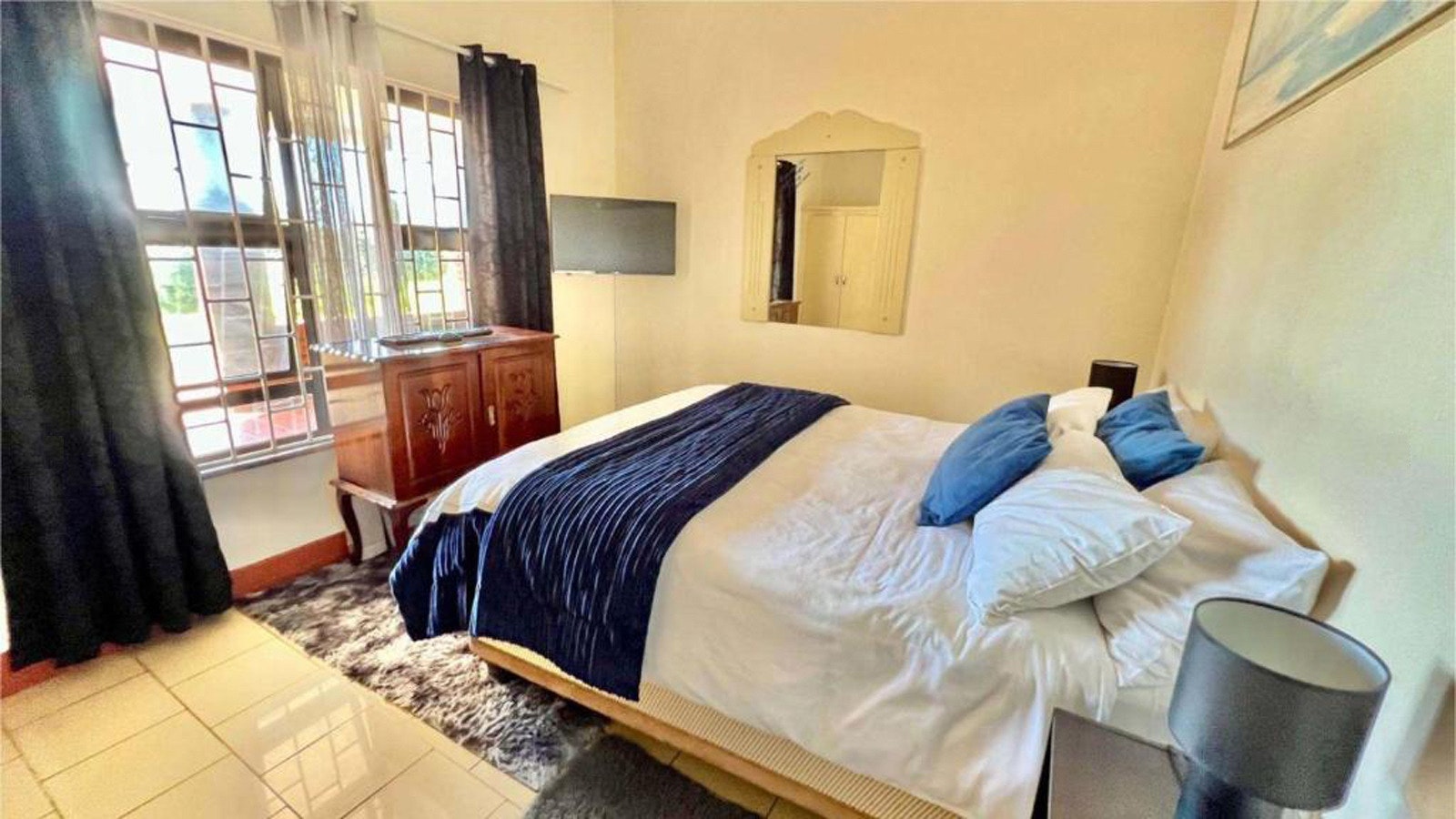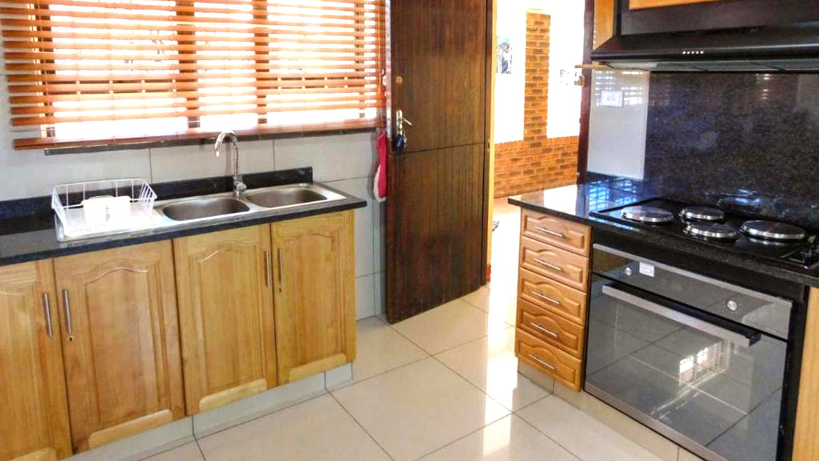 The kitchen is fully equipped with a stove, oven, fridge-freezer, microwave, cutlery and crockery. The living area includes a dining table, comfortable seating, a smart TV, and DStv. Guests are encouraged to bring their own decoder and smart card to access their preferred sports or DStv channels.