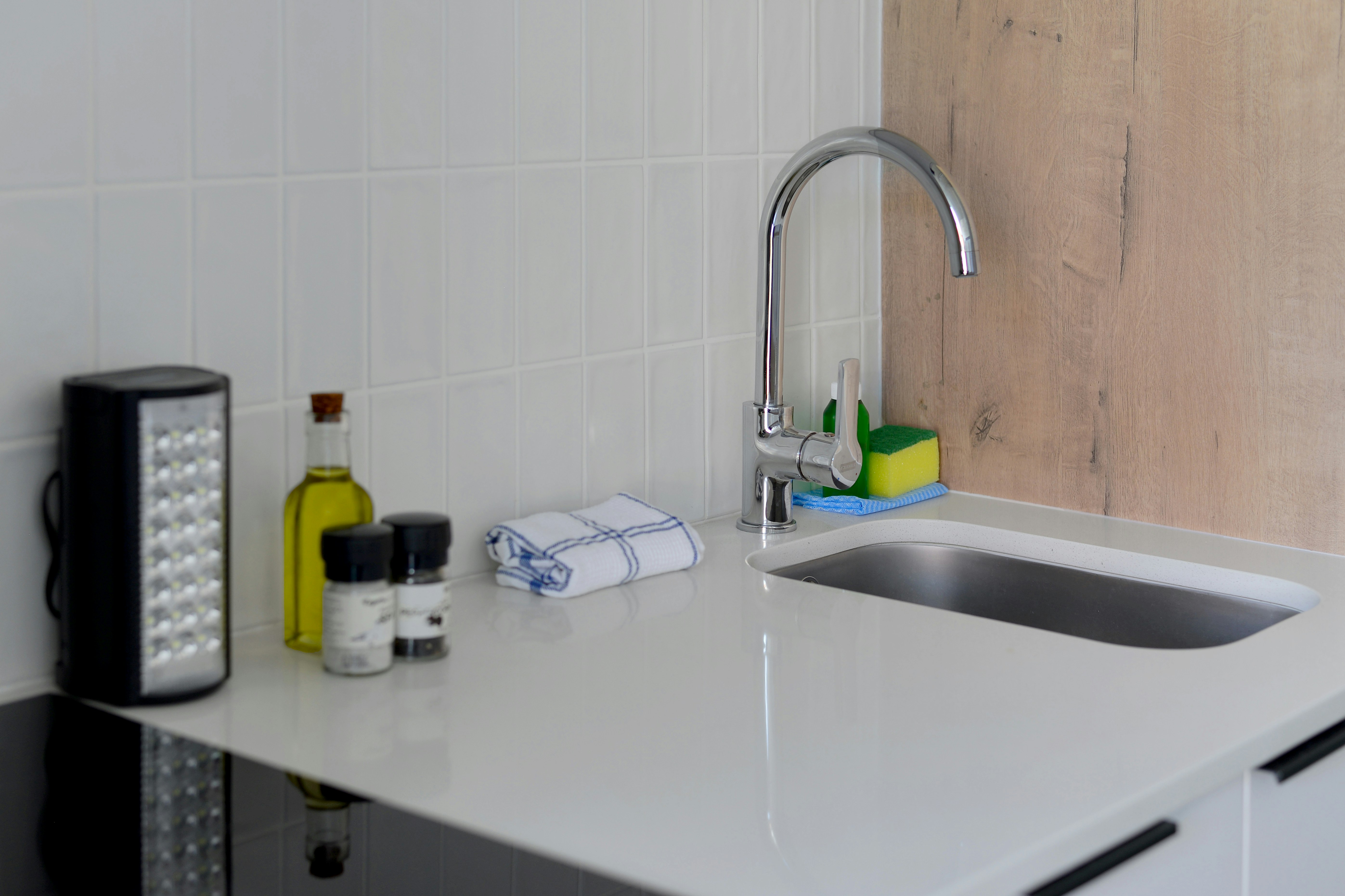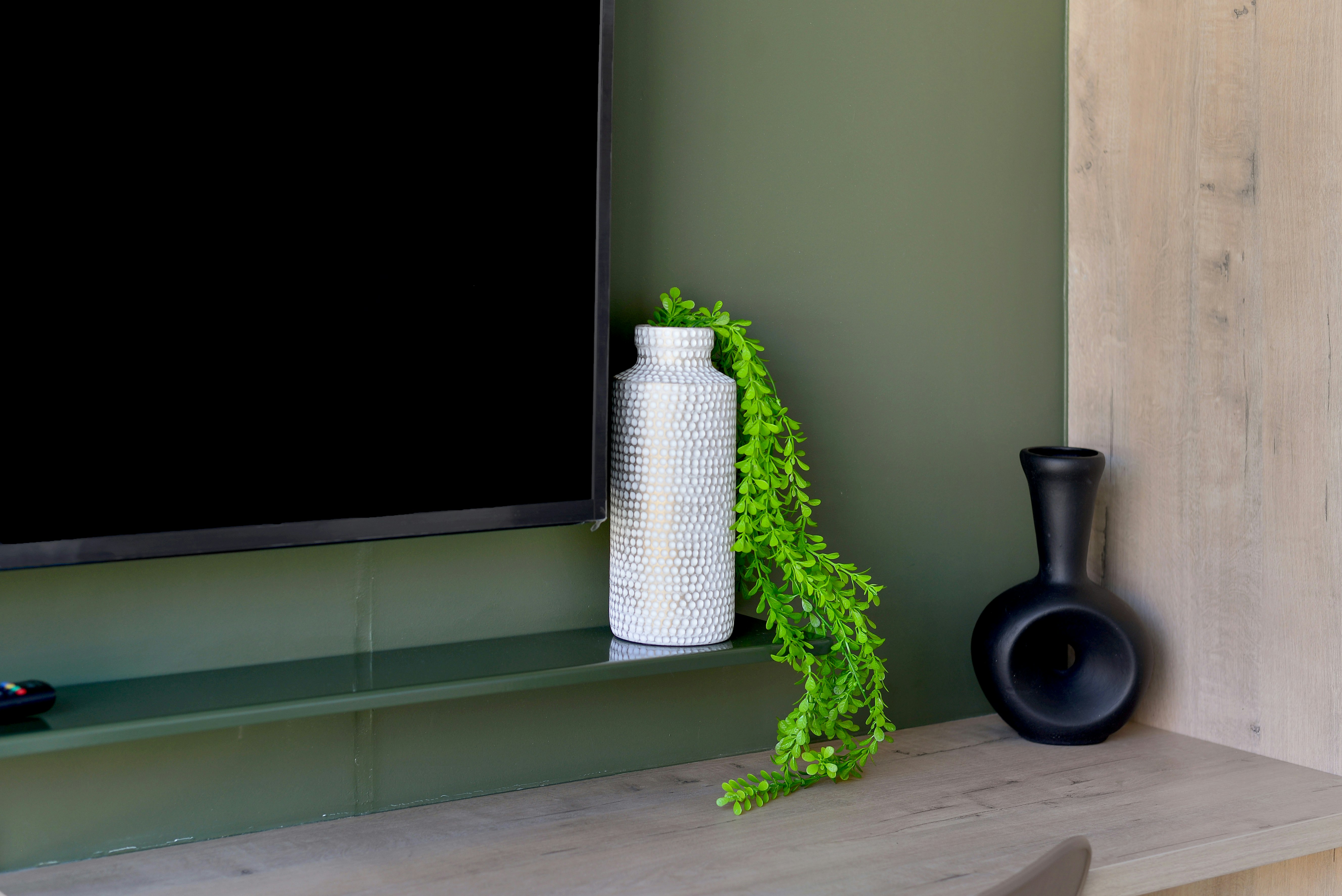 The kitchenette is fitted for self-catering and includes an induction plate, oven, fridge, microwave, cutlery, and crockery. The living area features a comfortable couch and a TV.