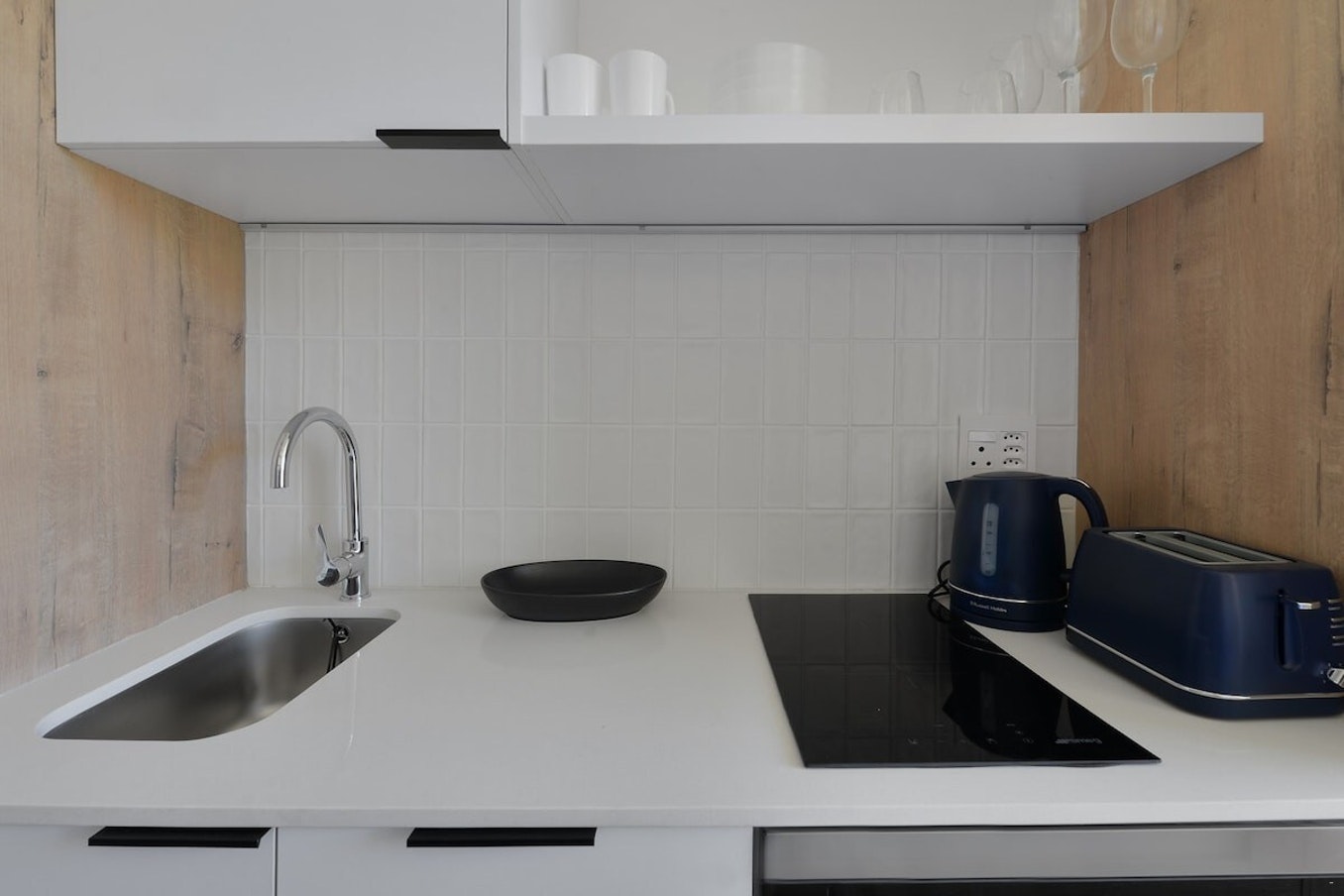 The open-plan living area features a kitchen well-equipped with a stove, oven, microwave, fridge-freezer, cutlery, crockery and a kettle. Leading from the kitchen is the lounge with a comfortable couch, a TV and a designated workspace. Access to free Wi-Fi is available.
