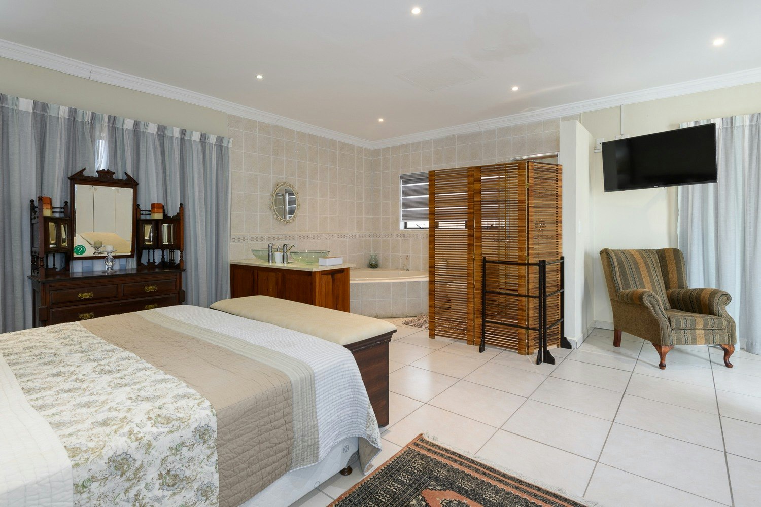 This beachfront, secure, superior villa is the perfect place for a family vacation, accommodating up to 8 guests. This fully furnished vacation home offers a 180-degree ocean view and everything you may need or want for a pleasant stay with family and friends. The villa features 4 bedrooms, two with king-size beds, and the other two furnished with queen-size beds. Each bedroom has a private en-suite bathroom, with bedroom 1 and 2 fitted with a corner bath, wash basin, toilet and shower, bedroom 3 fitted with a toilet, wash basin, bath and shower over bath, and the final en-suite fitted with a wash basin, toilet and shower. The kitchen is fully equipped with modern appliances, including a fridge, microwave, kettle, electric stove, oven, toaster, and a scullery with a washing machine and dishwasher for added convenience. There is also a dining room furnished with a 12-seater dining table perfect for the whole family to enjoy a home-made meal. The lounge provides comfortable seating for relaxation while reading a book or enjoying the beautiful view.