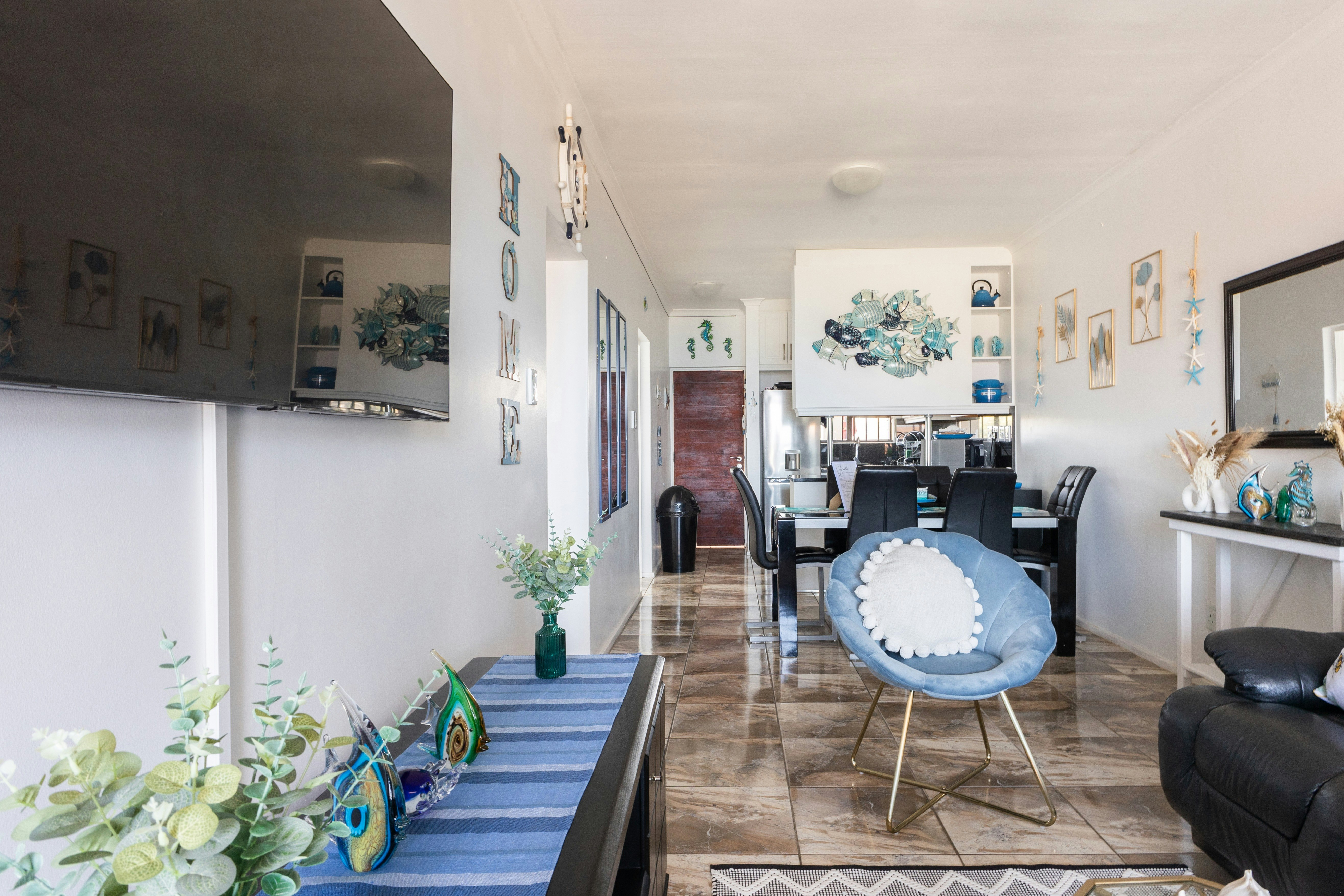 The open-plan living area includes a well-equipped kitchen with a fridge-freezer, stove, oven, microwave, cutlery, crockery, and tea- and coffee-making facilities. A washing machine and wine cooler is available for added convenience. Adjacent to the kitchen is a 6-seater dining table, and the lounge features comfortable seating, a wall-mounted smart TV with a limited selection of DStv channels, and access to complimentary Wi-Fi.