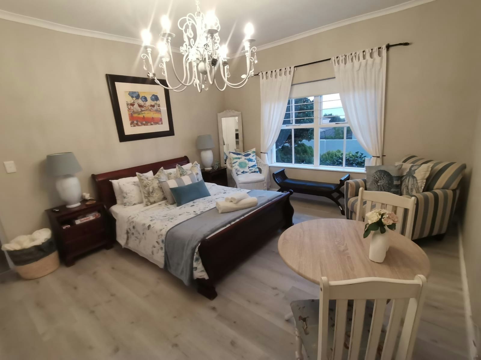 Accommodation is available for 4 guests and comprises a 2-bedroom unit attached to the main house. The unit has a private entrance and the bedrooms are furnished with a king-size bed and a double bed, respectively. The shared bathroom is connected to one of the rooms and is fitted with a bath and shower. One of the rooms has a kitchenette equipped with a microwave, kettle, and bar fridge. Additionally, the unit has a 2-seater dining table, a TV with selected streaming services, and free Wi-Fi. Guests are also afforded secure parking on the premises.