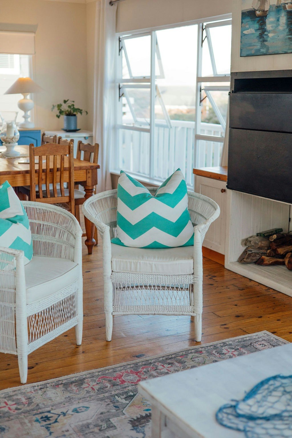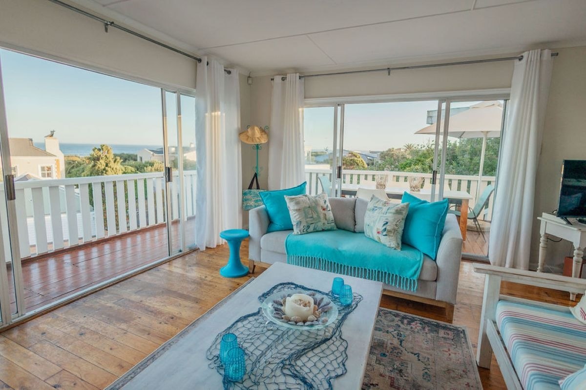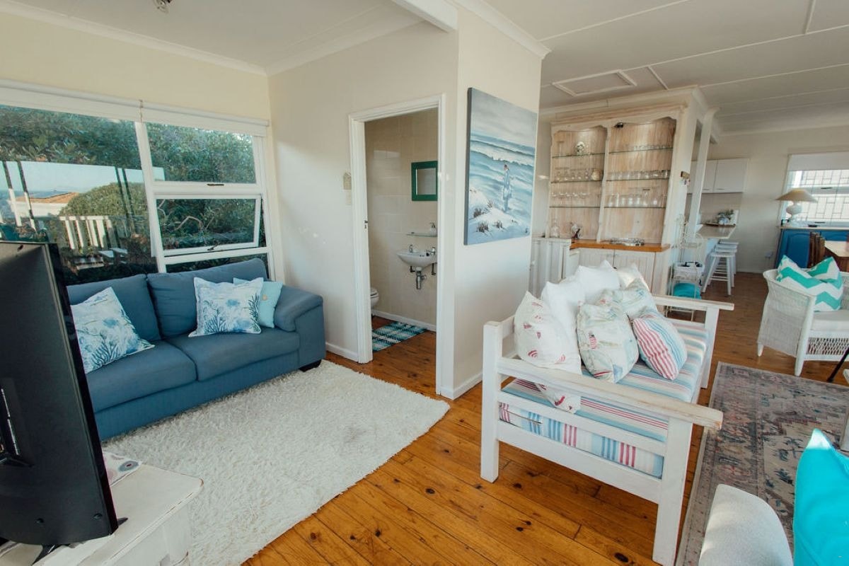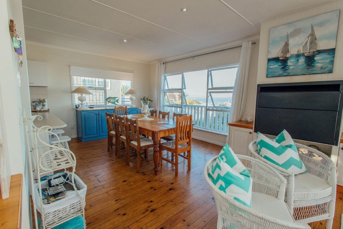 Bo spog die oopplan-kombuis en -leefarea met panoramiese see-uitsigte. Die kombuis is volledig toegerus vir selfsorg en bevat 'n yskas, diepvrieskas, gasstoof, elektriese oond, skottelgoedwasser, wasmasjien en tuimeldroër. Die leefarea beskik oor gemaklike sitplek, 'n kaggel, 'n slim-TV, 'n kroegarea met 'n yskas, DStv en gratis WiFi. Deure lei na 'n houtdek met 'n vrystaande braai en 'n eetkamertafel met 10 sitplekke en 'n sambreel, perfek om die see-uitsig te geniet en walvisse gedurende die seisoen te sien.