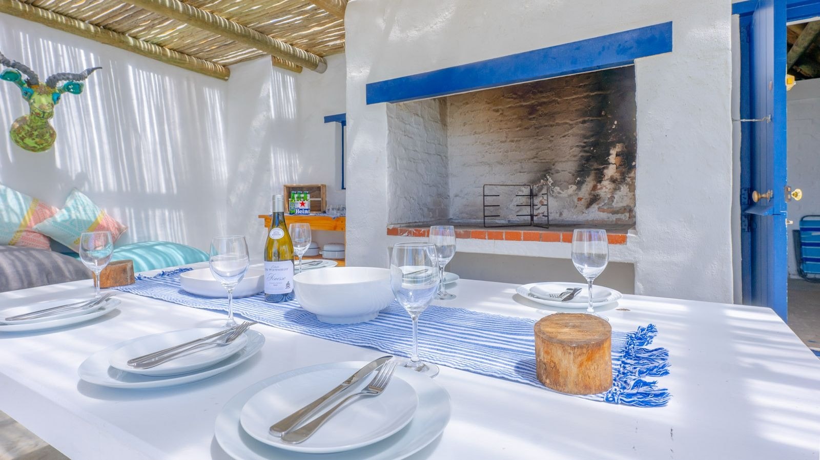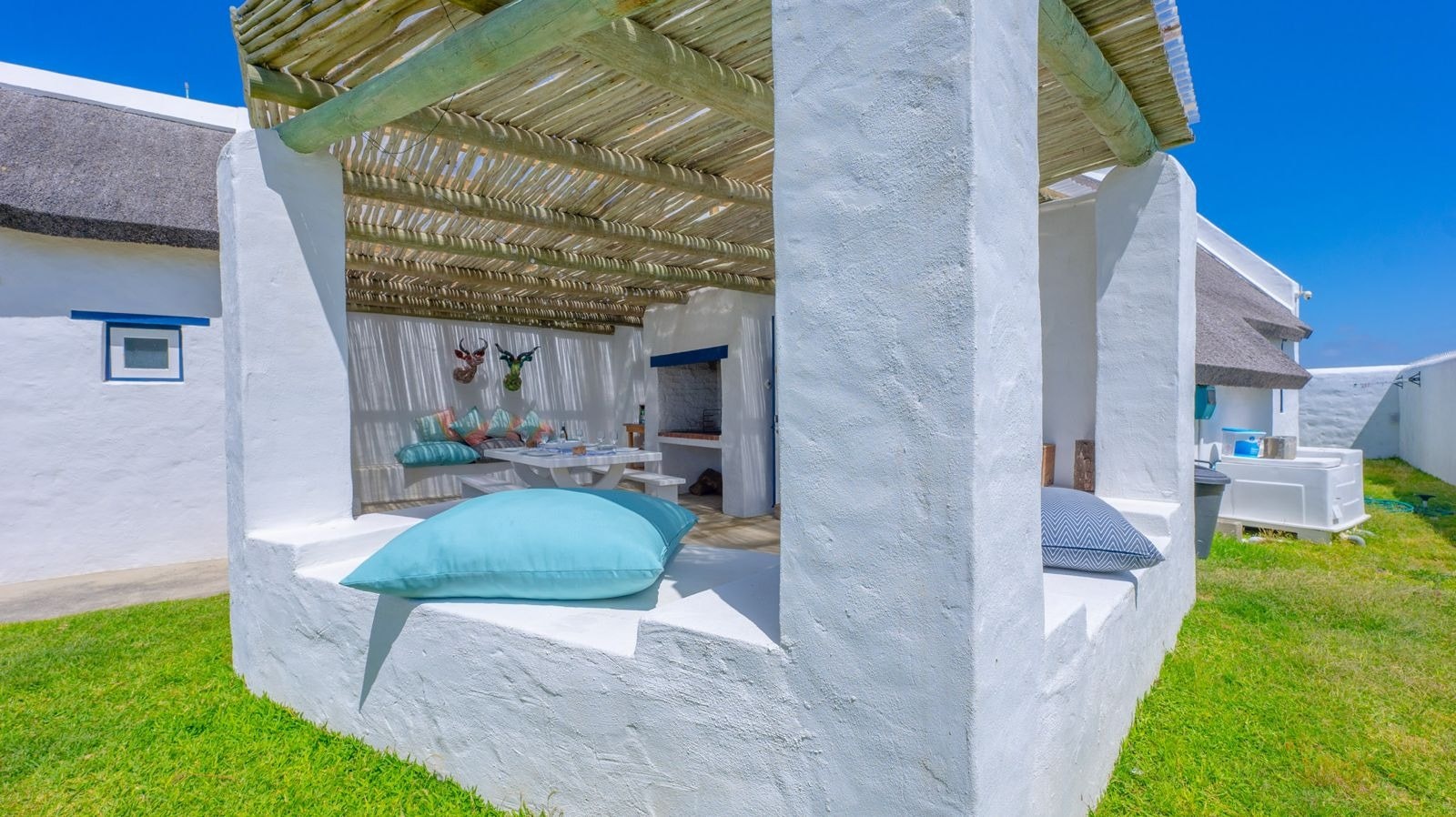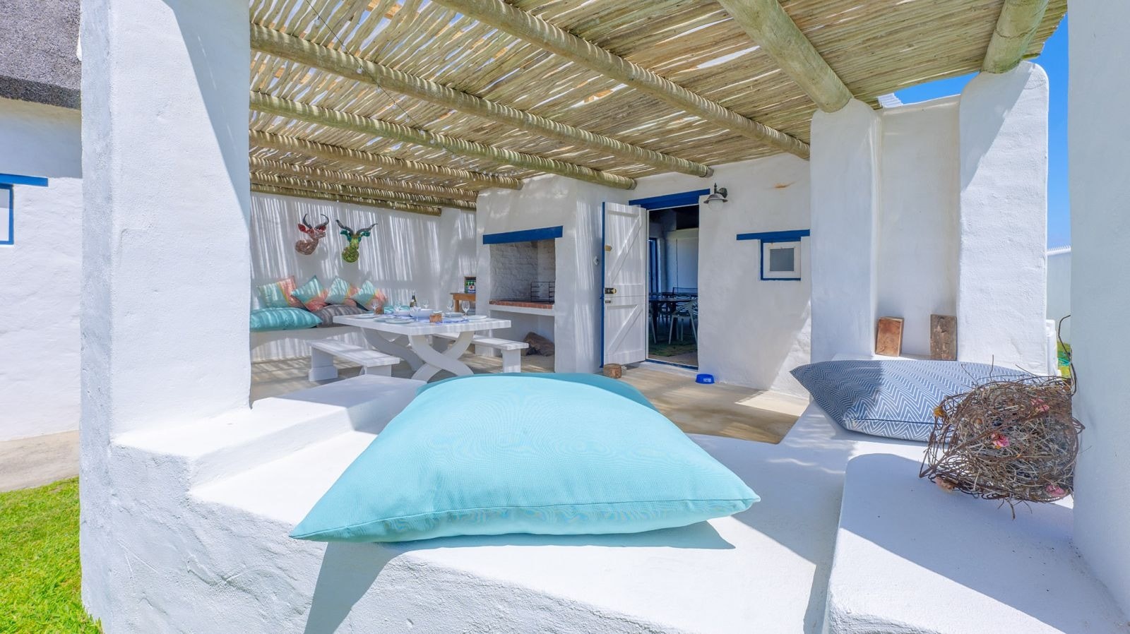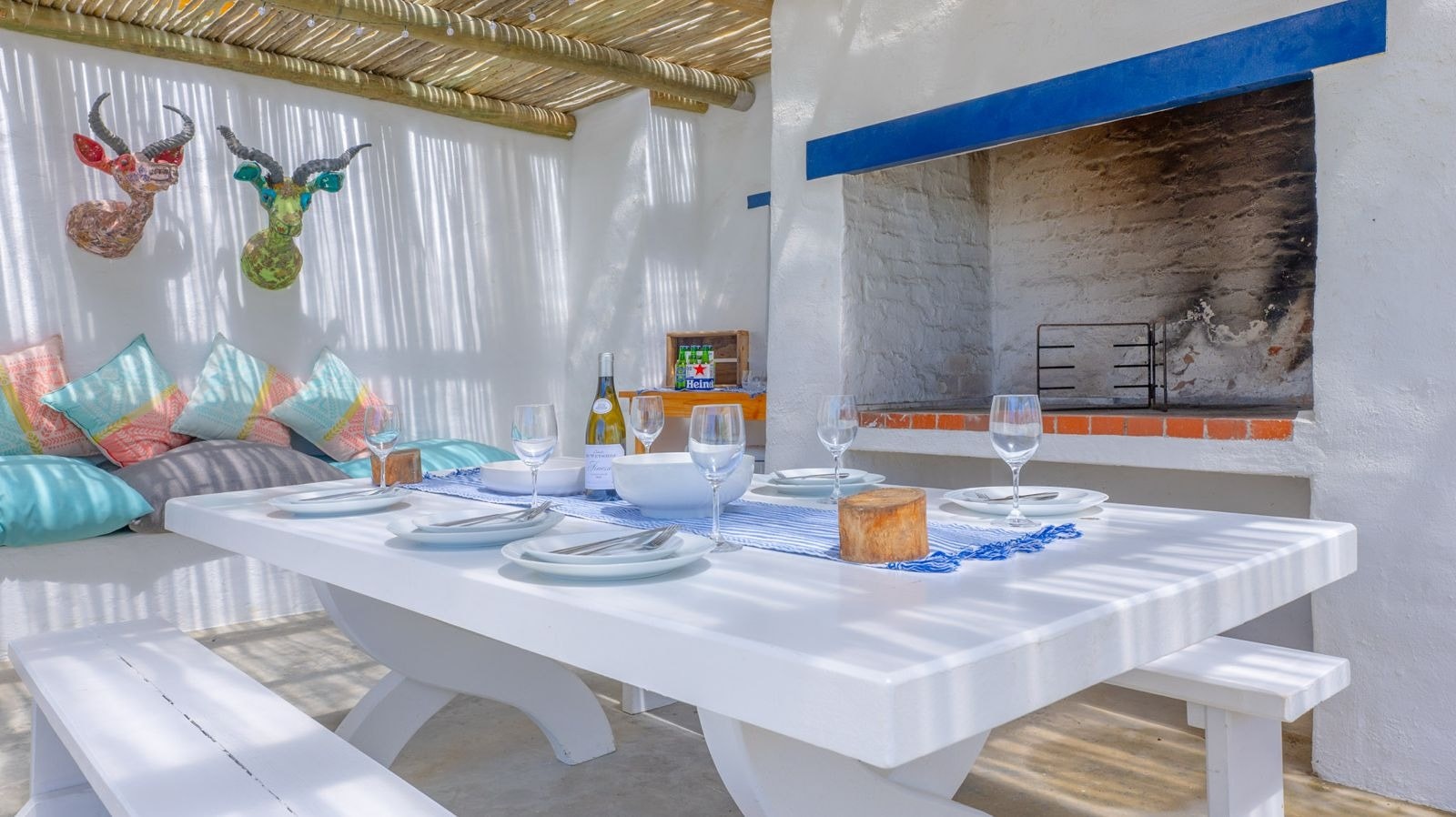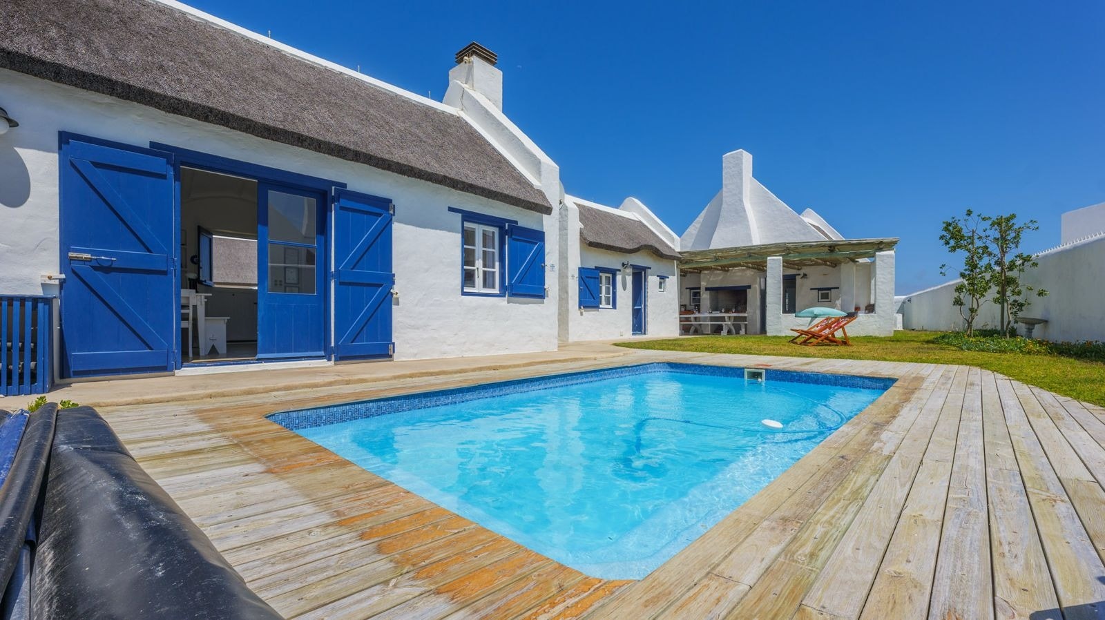 Outside is a covered patio with an outdoor dining table and a built-in braai which creates a great spot for guests to fully unwind and enjoy a sundowner while the fire is burning. This patio leads to an inviting swimming pool for guests to cool off.
