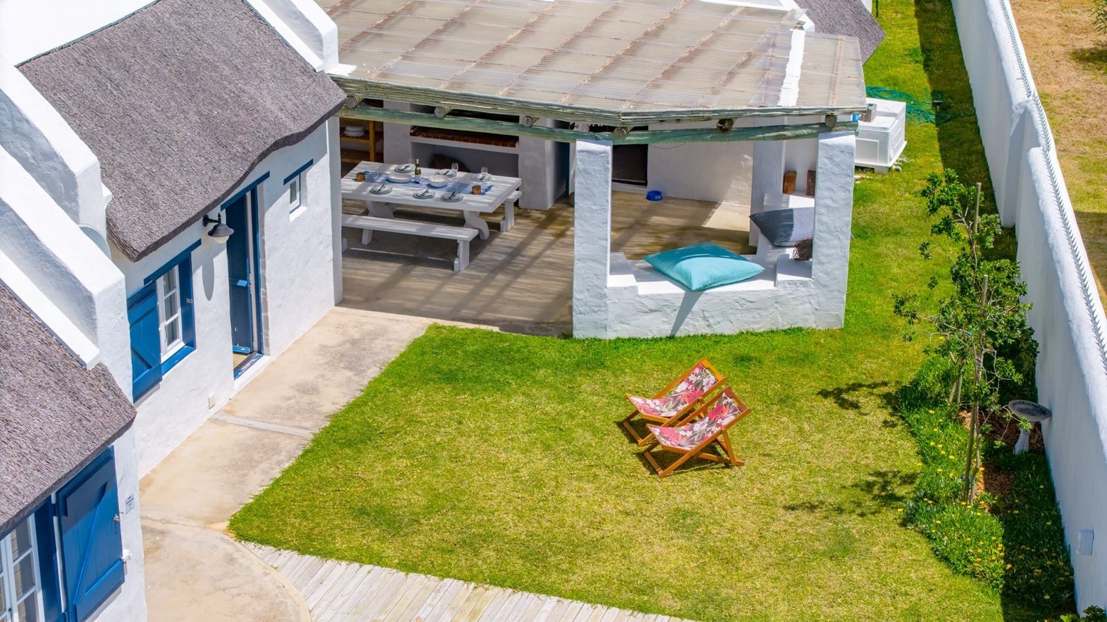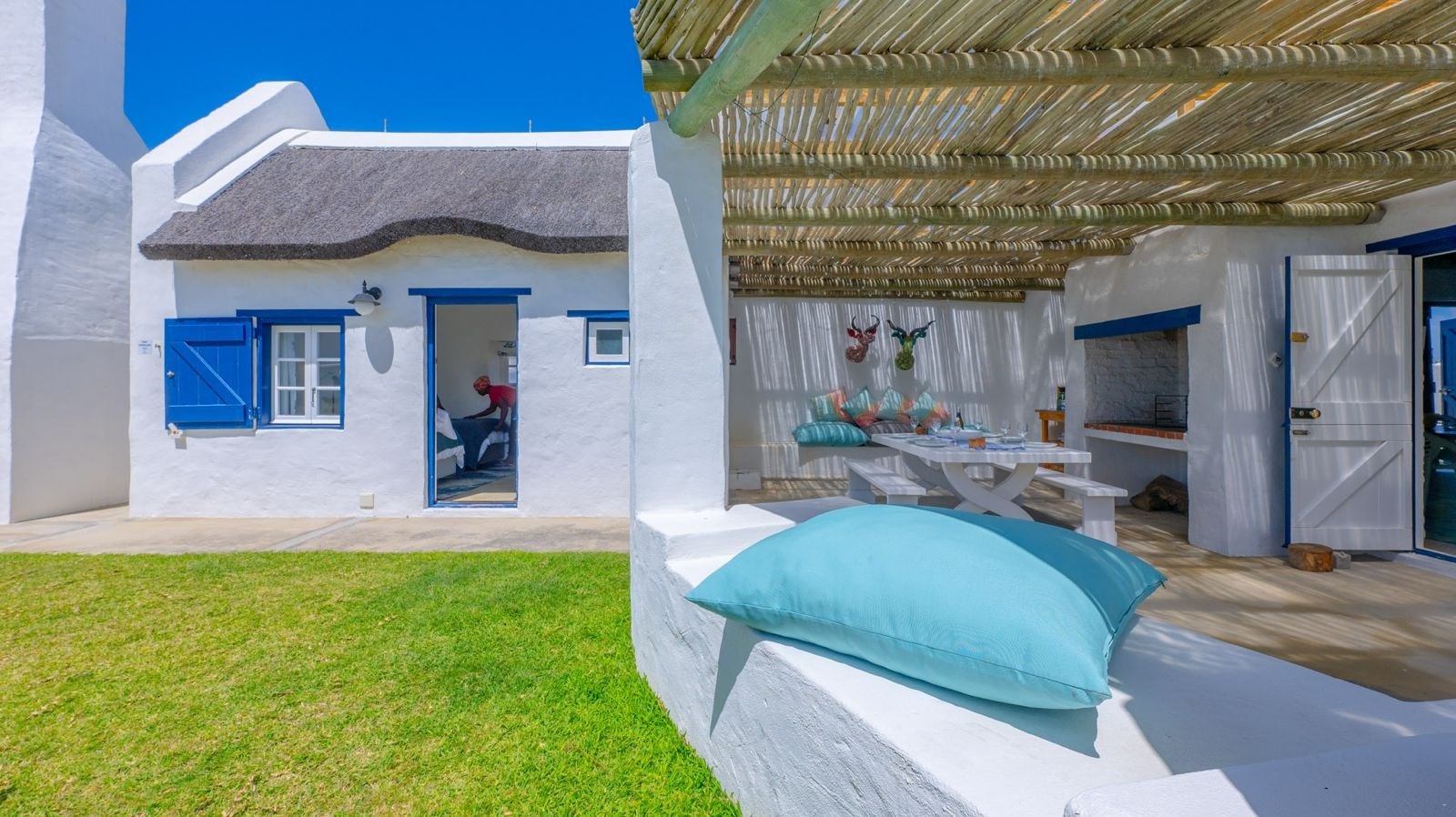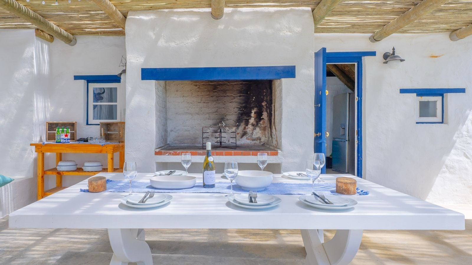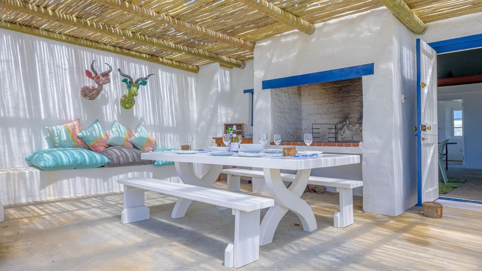 Outside is a covered patio with an outdoor dining table and a built-in braai which creates a great spot for guests to fully unwind and enjoy a sundowner while the fire is burning. This patio leads to an inviting swimming pool for guests to cool off.