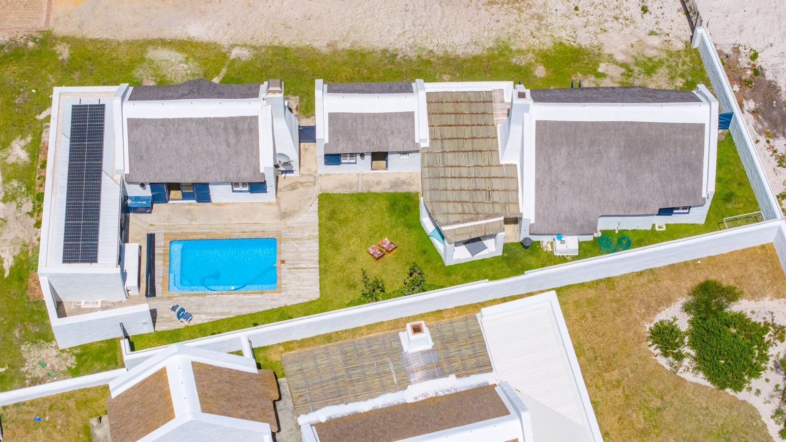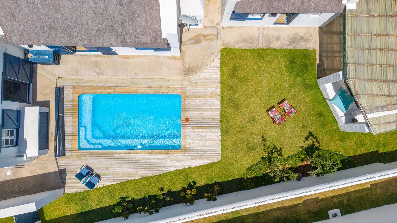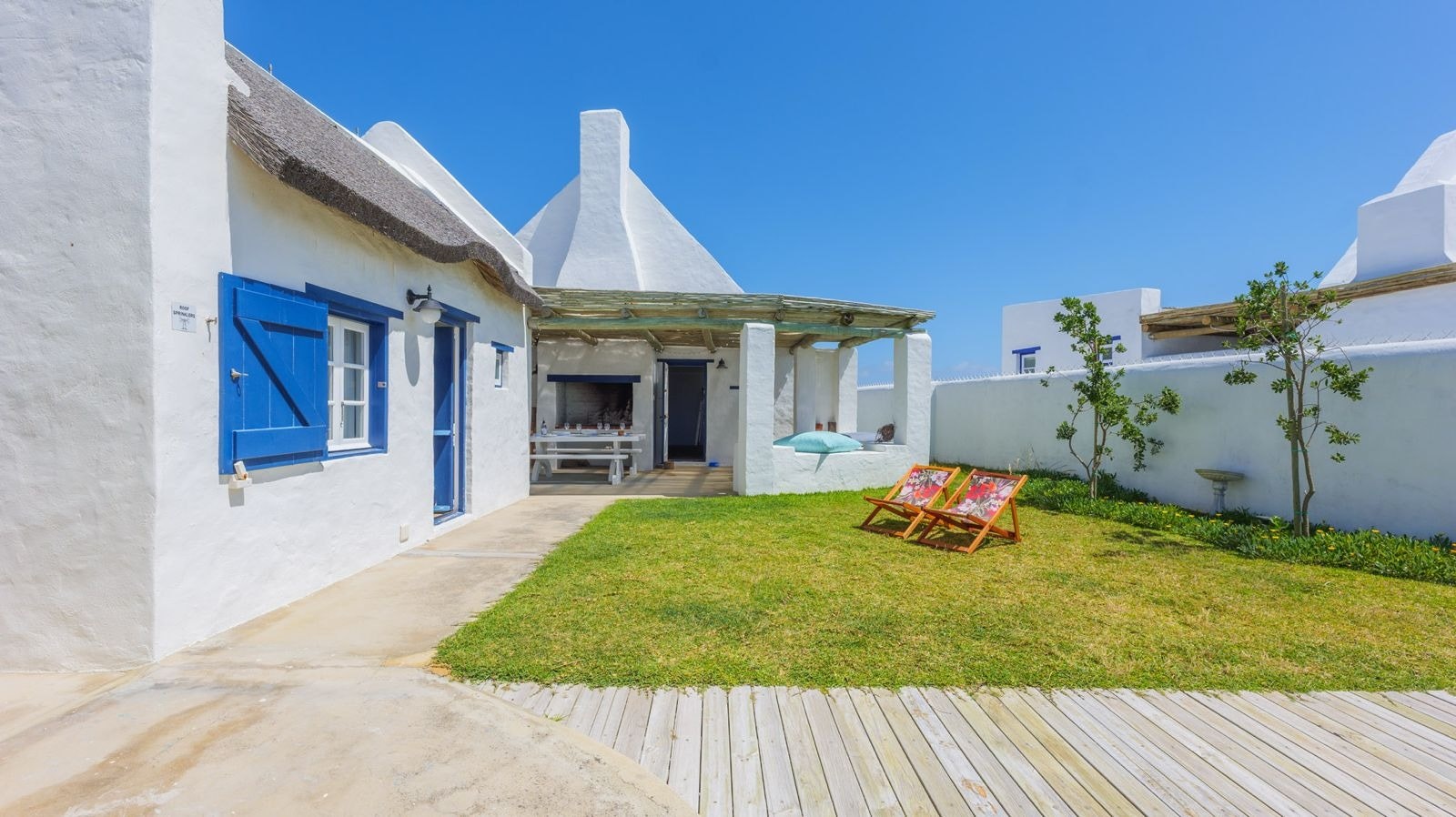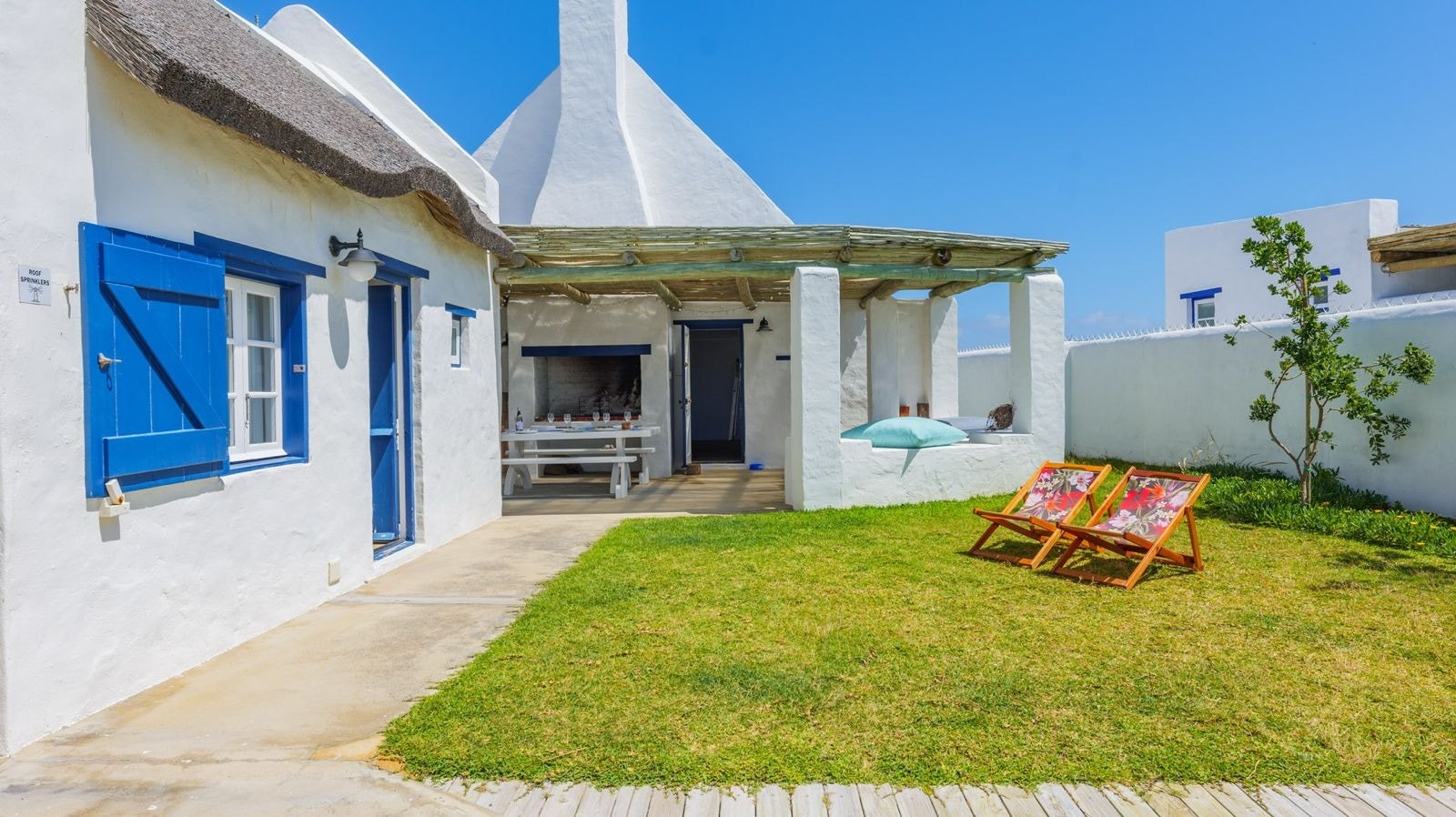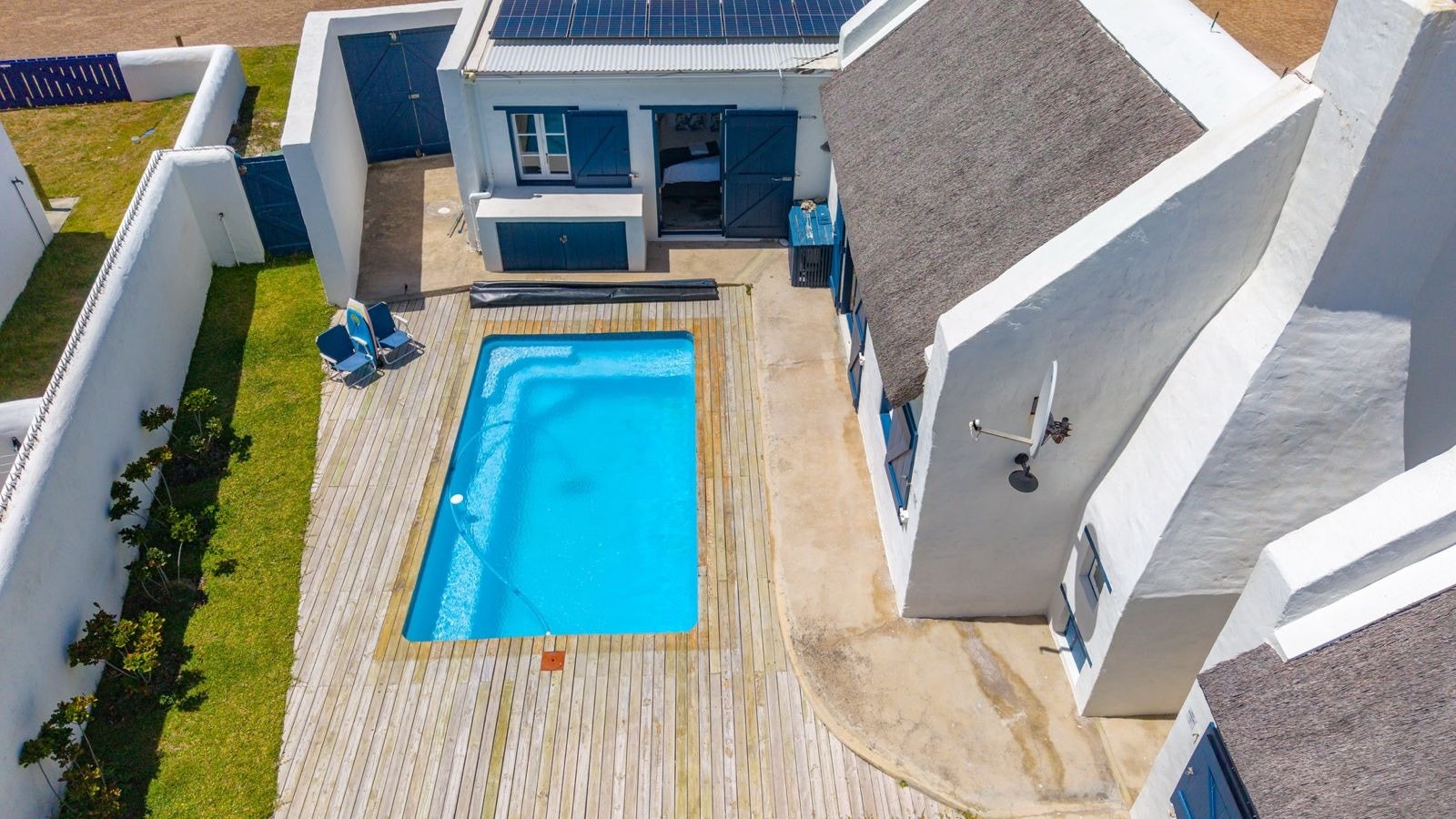 Outside is a covered patio with an outdoor dining table and a built-in braai which creates a great spot for guests to fully unwind and enjoy a sundowner while the fire is burning. This patio leads to an inviting swimming pool for guests to cool off.