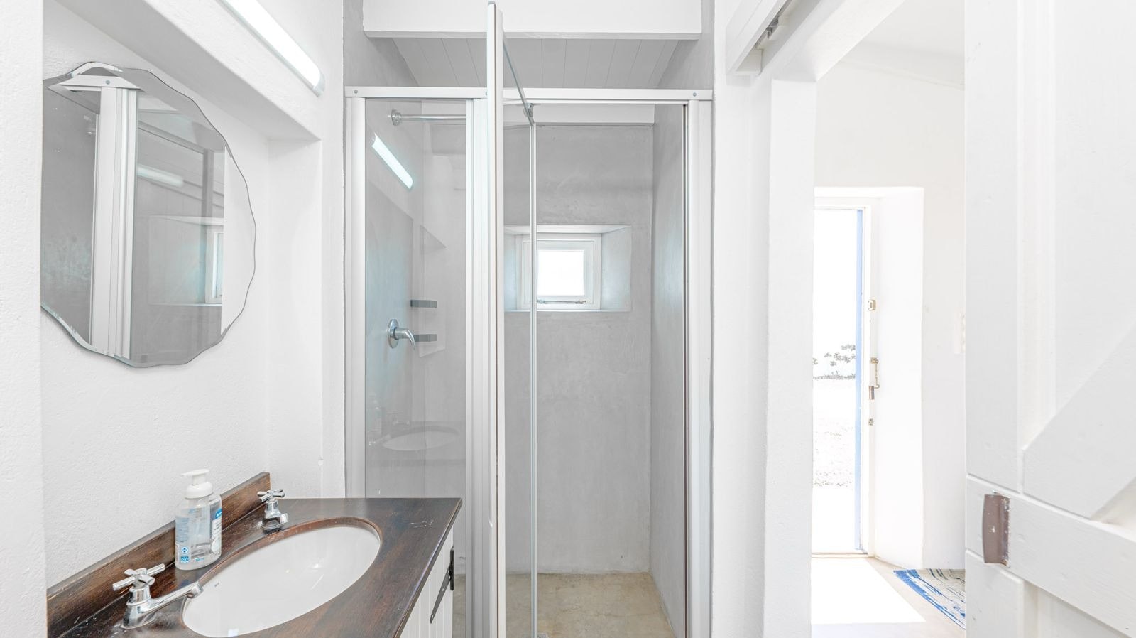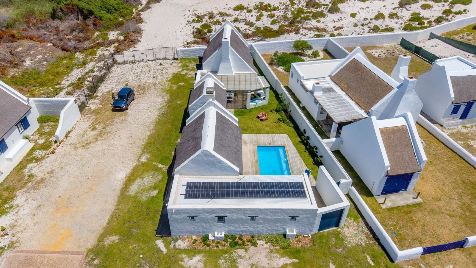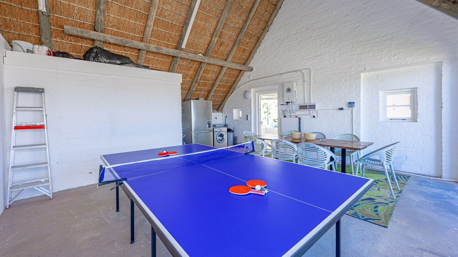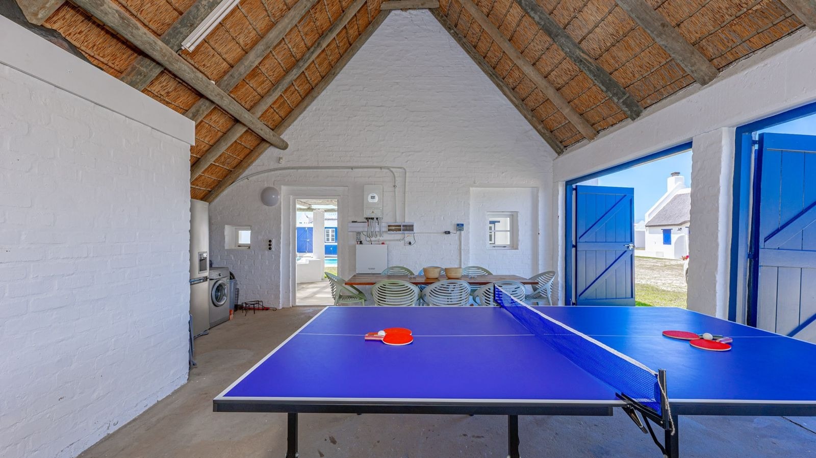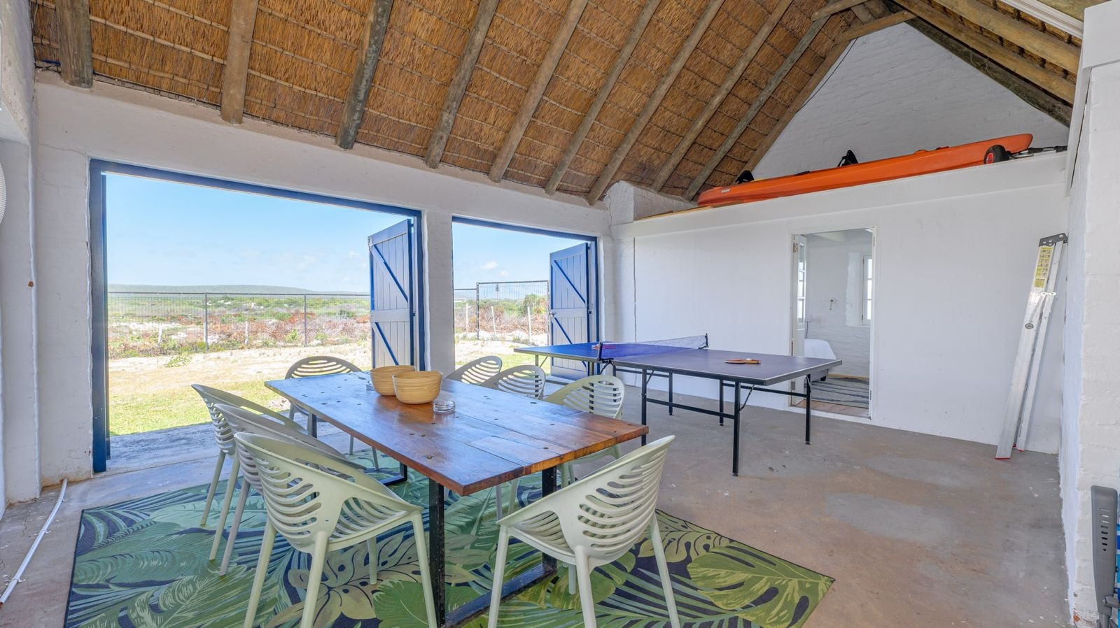Outside is a covered patio with an outdoor dining table and a built-in braai which creates a great spot for guests to fully unwind and enjoy a sundowner while the fire is burning. This patio leads to an inviting swimming pool for guests to cool off.