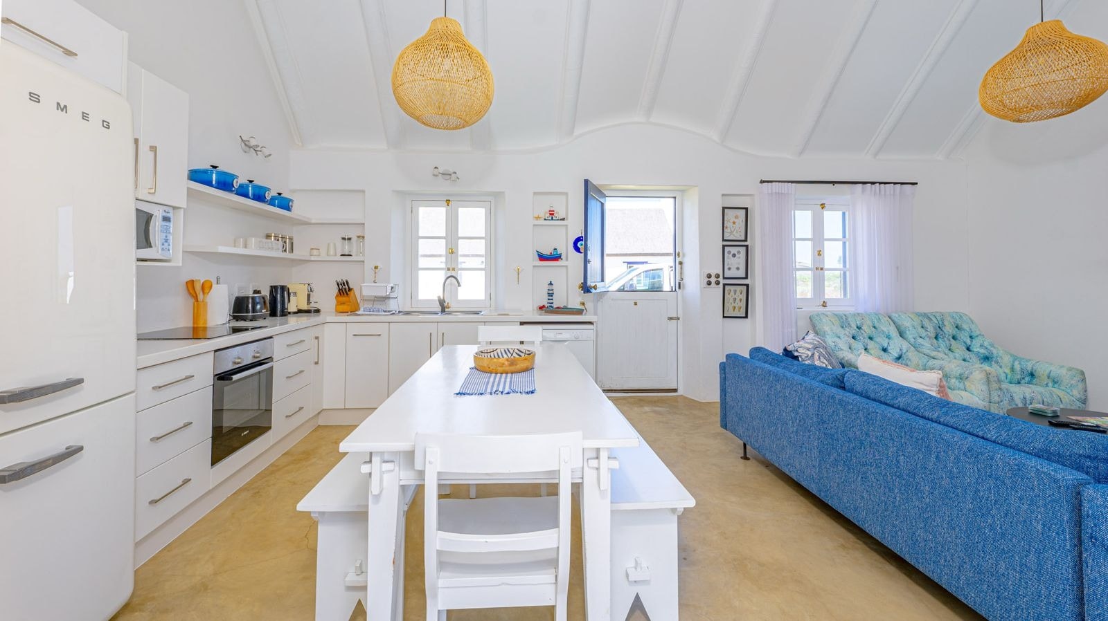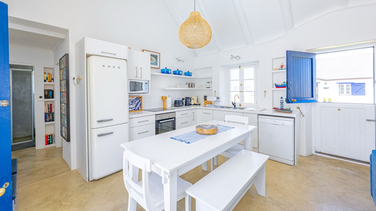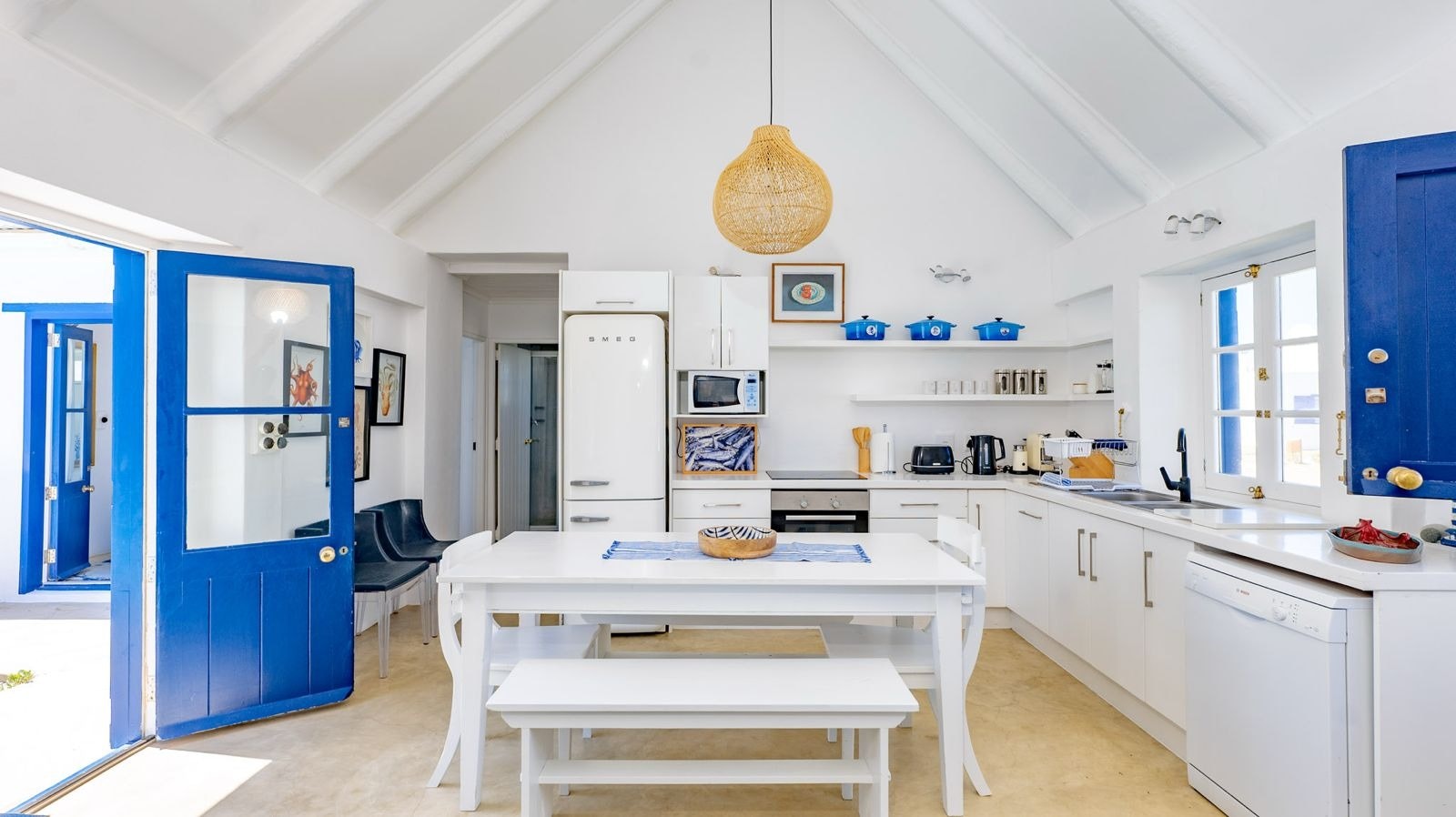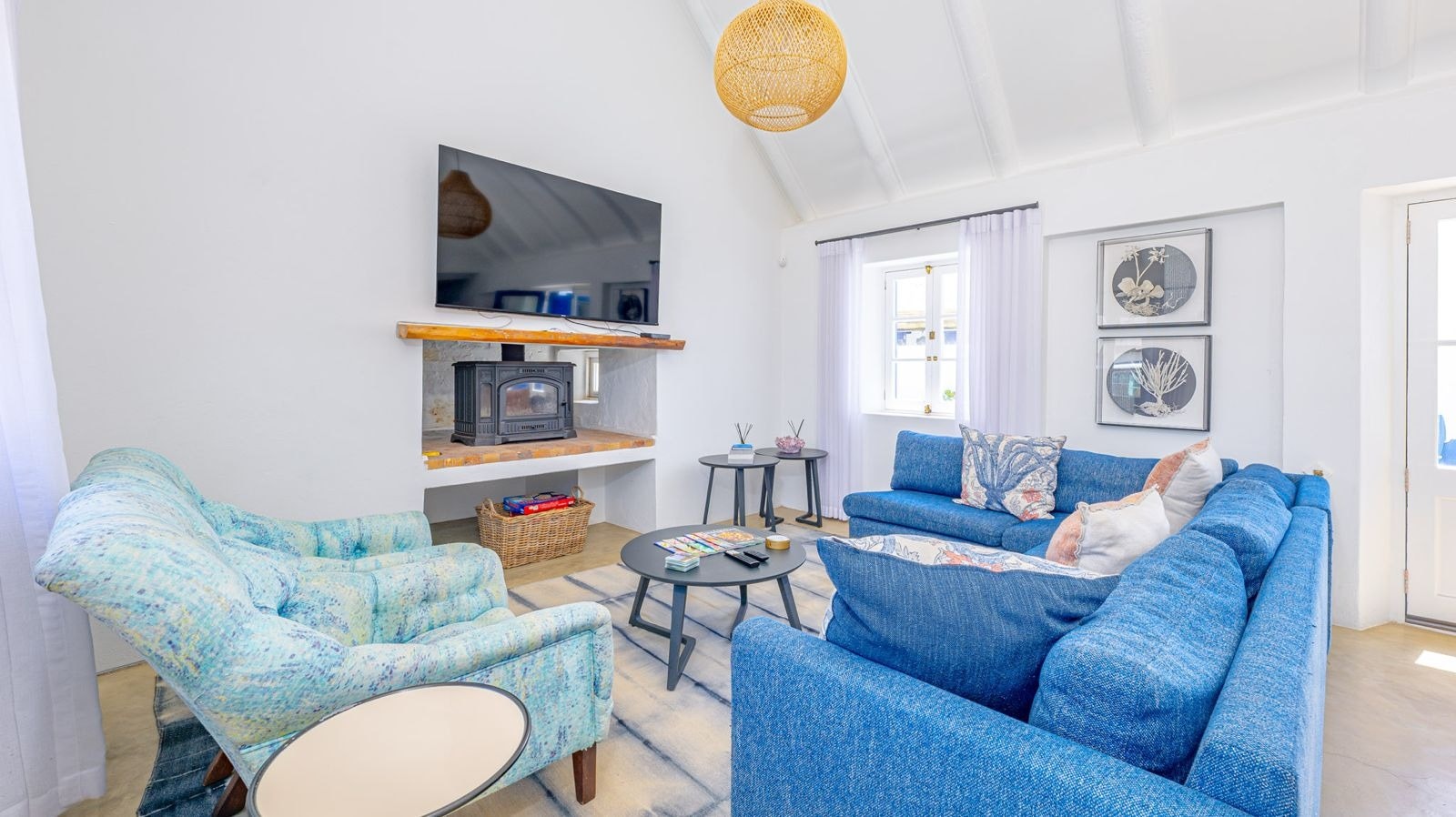 The open-plan living area features a kitchen fully equipped with a stove, oven, microwave, fridge-freezer, Nespresso machine, cutlery and crockery as well as a central breakfast table. A dishwasher is available too. Leading from this kitchen is a lounge space with comfortable seating, a fireplace and a TV with DStv. Access to free Wi-Fi is available.