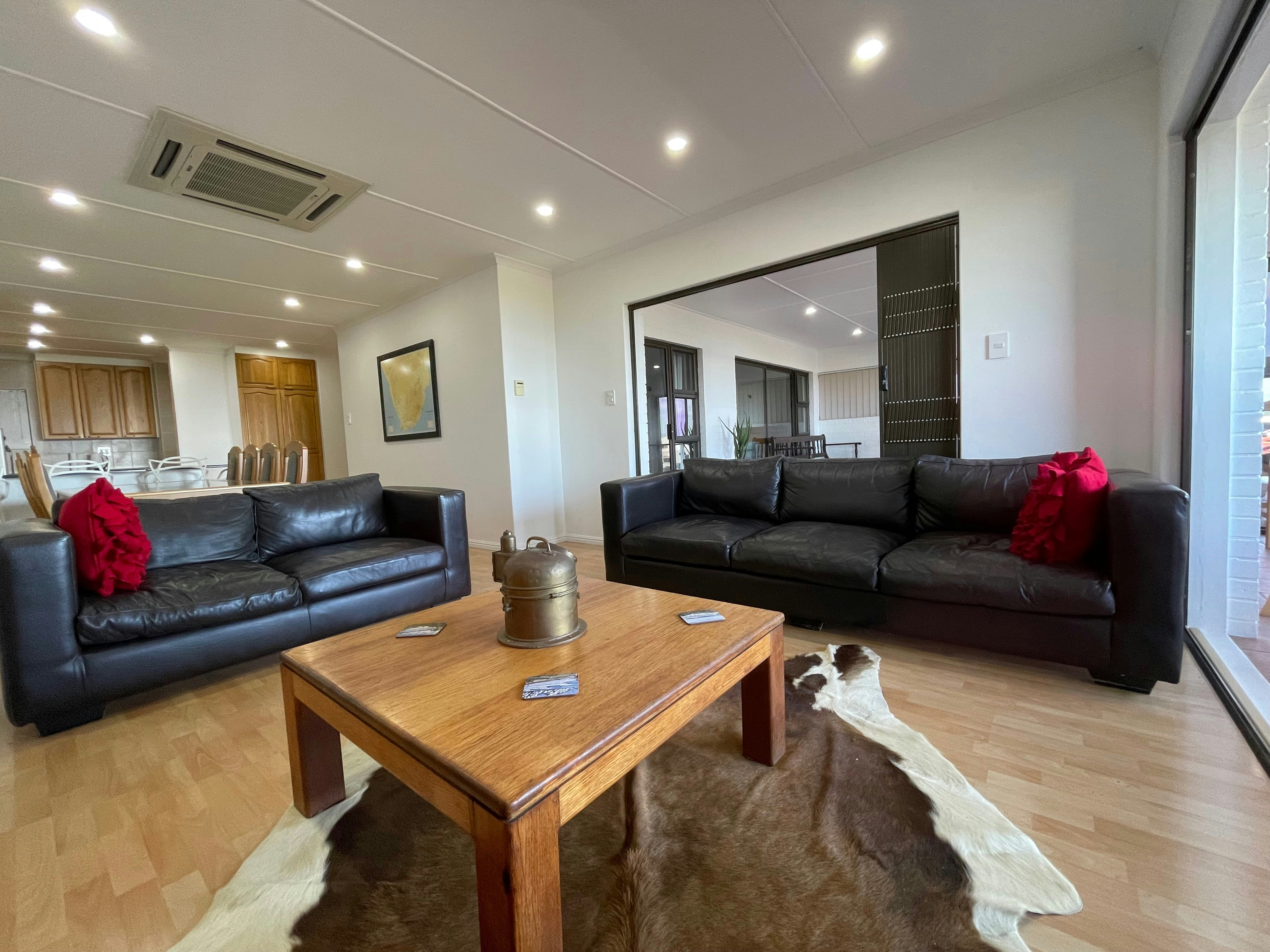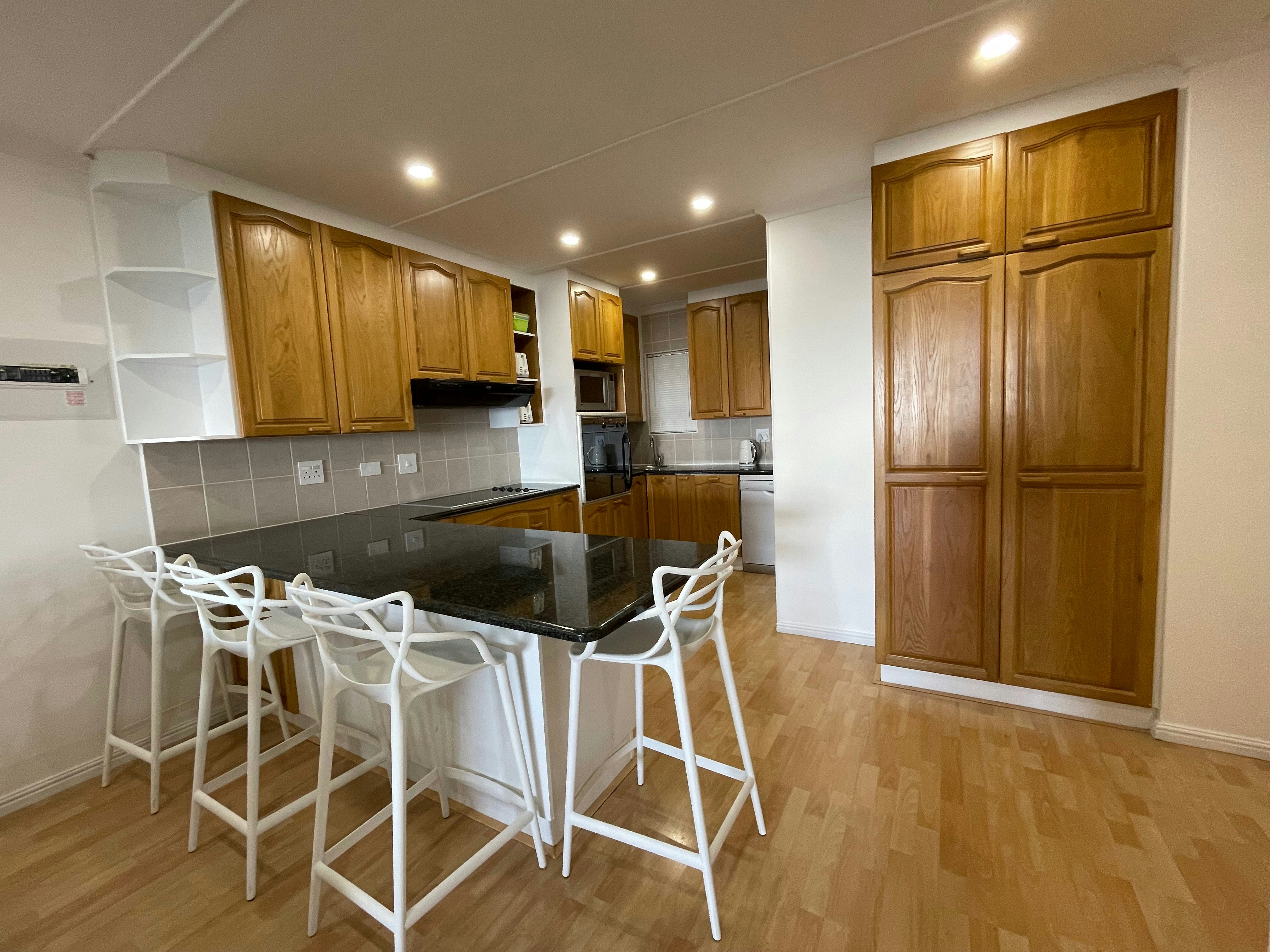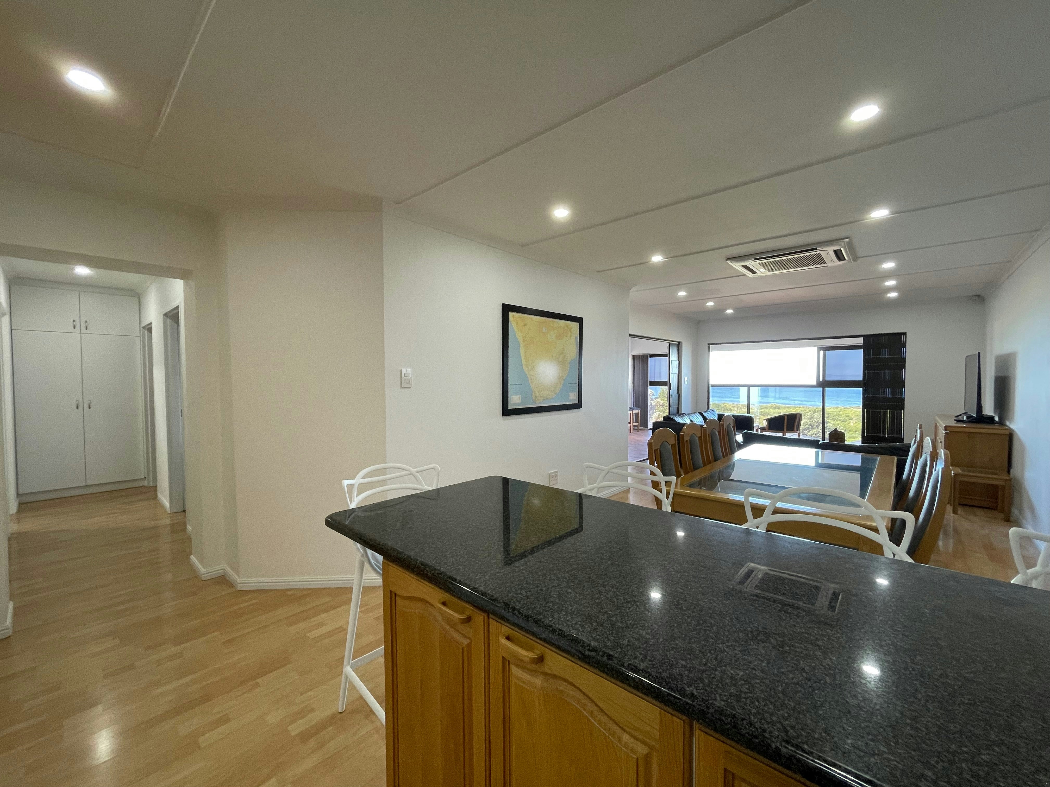 Die ruim oopplan-kombuis is volledig toegerus vir selfsorg met 'n stoofplaat, oond op ooghoogte, mikrogolfoond, skottelgoedwasser en ruim kaste met eetgerei, breekware, glasware en 'n braaistel. 'n Afsonderlike opwasarea bevat 'n yskas-vrieskas en wasmasjien, met toegang tot 'n privaat buitewasgoedlyn. Die leefarea beskik oor 'n eetarea en 'n sitkamer met see-uitsigte wat na die vermaaklikheidsarea lei. Die sitkamer sluit 'n slim-TV met Netflix, YouTube en DStv in. Die dubbelmotorhuis het 'n omsetter en 'n binnewasgoedlyn.