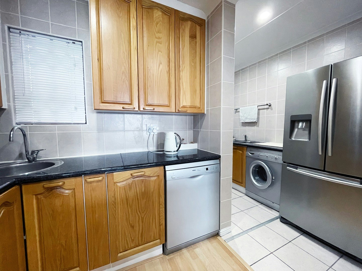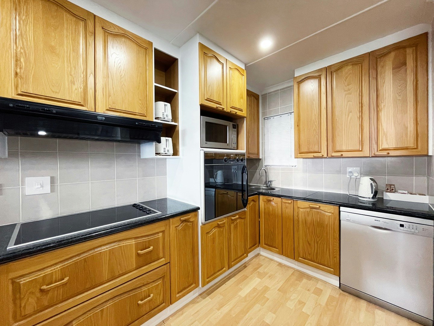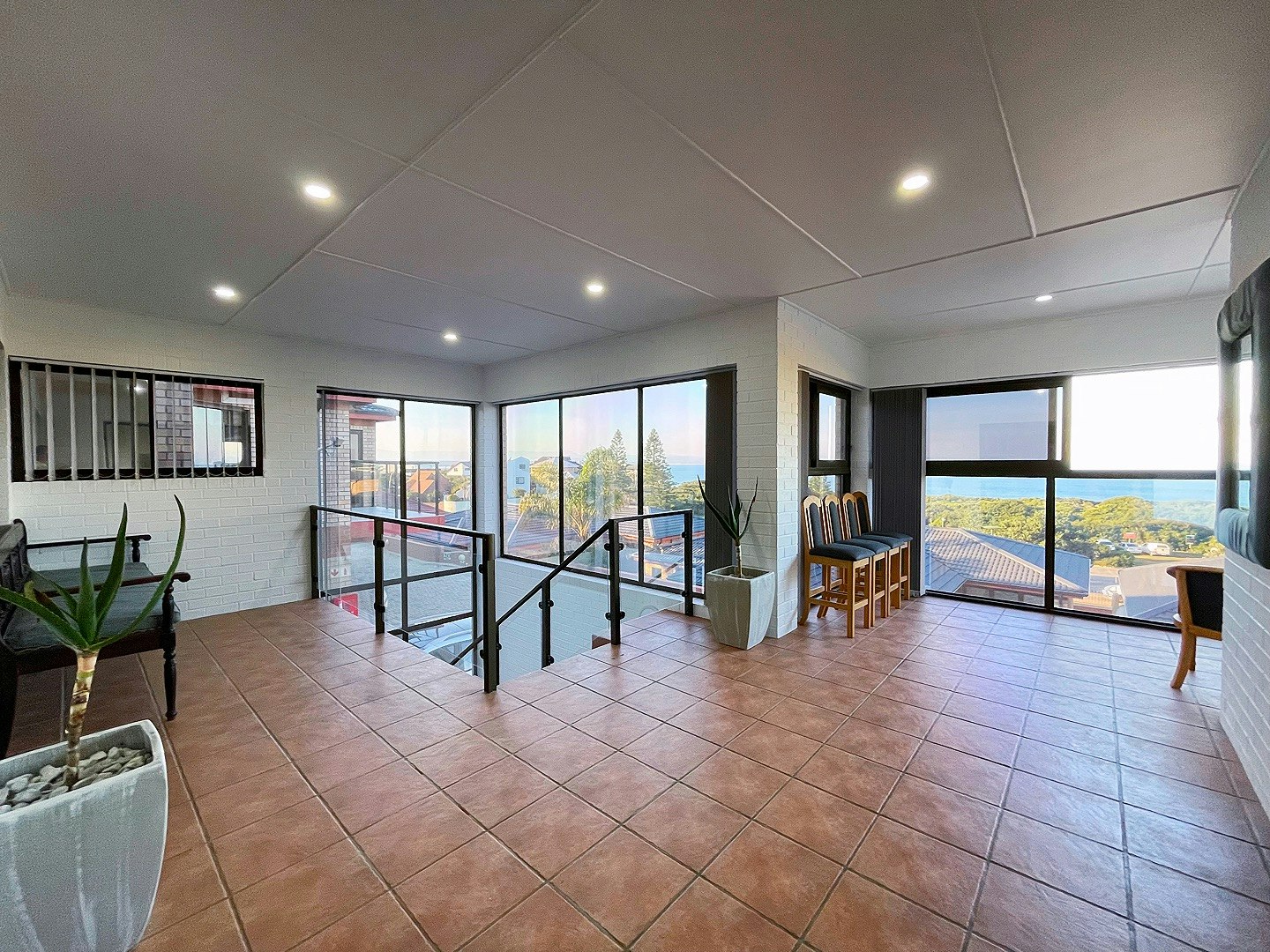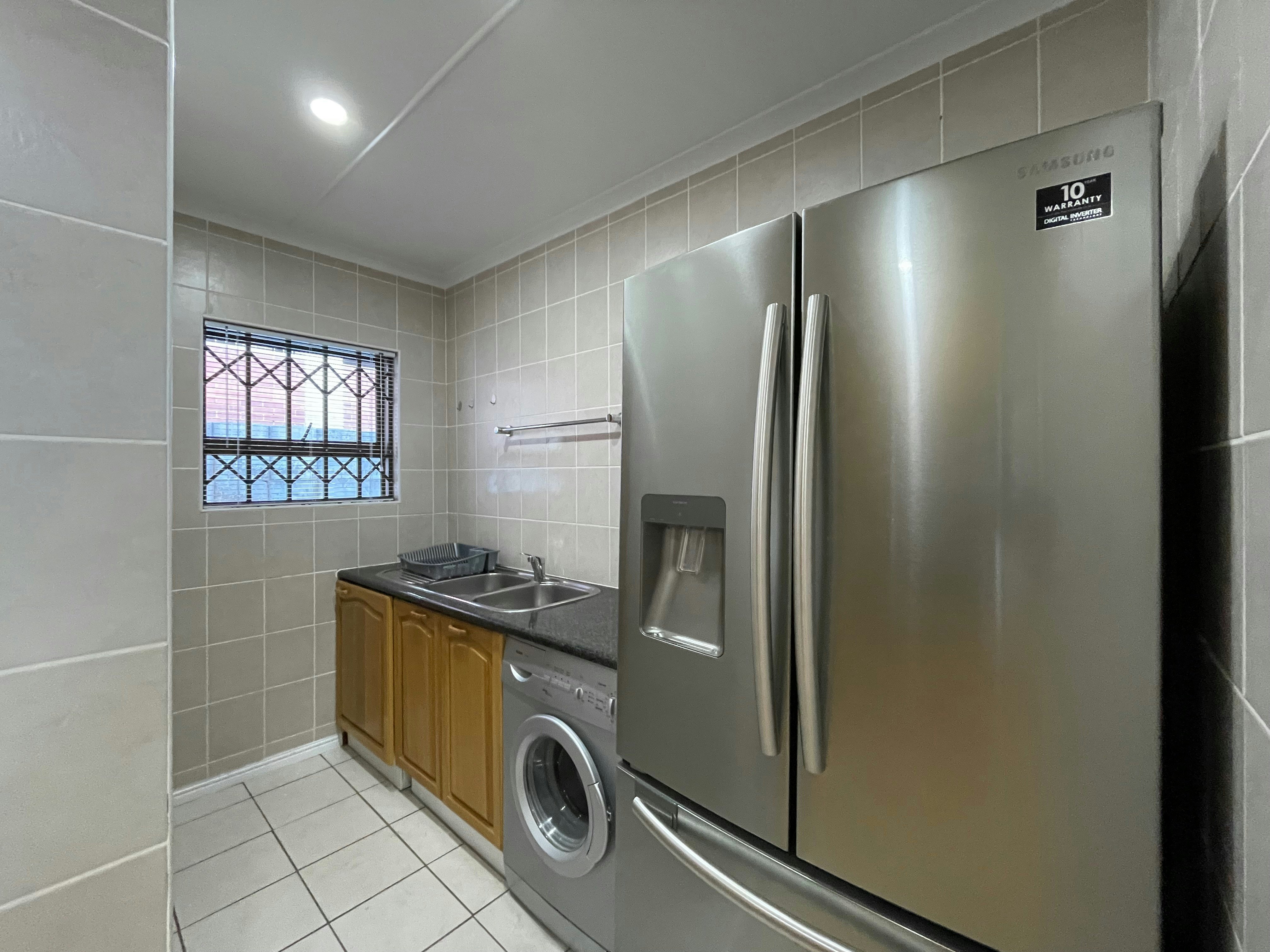 Die ruim oopplan-kombuis is volledig toegerus vir selfsorg met 'n stoofplaat, oond op ooghoogte, mikrogolfoond, skottelgoedwasser en ruim kaste met eetgerei, breekware, glasware en 'n braaistel. 'n Afsonderlike opwasarea bevat 'n yskas-vrieskas en wasmasjien, met toegang tot 'n privaat buitewasgoedlyn. Die leefarea beskik oor 'n eetarea en 'n sitkamer met see-uitsigte wat na die vermaaklikheidsarea lei. Die sitkamer sluit 'n slim-TV met Netflix, YouTube en DStv in. Die dubbelmotorhuis het 'n omsetter en 'n binnewasgoedlyn.