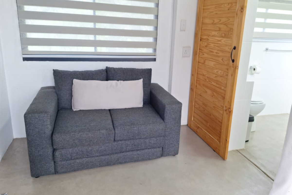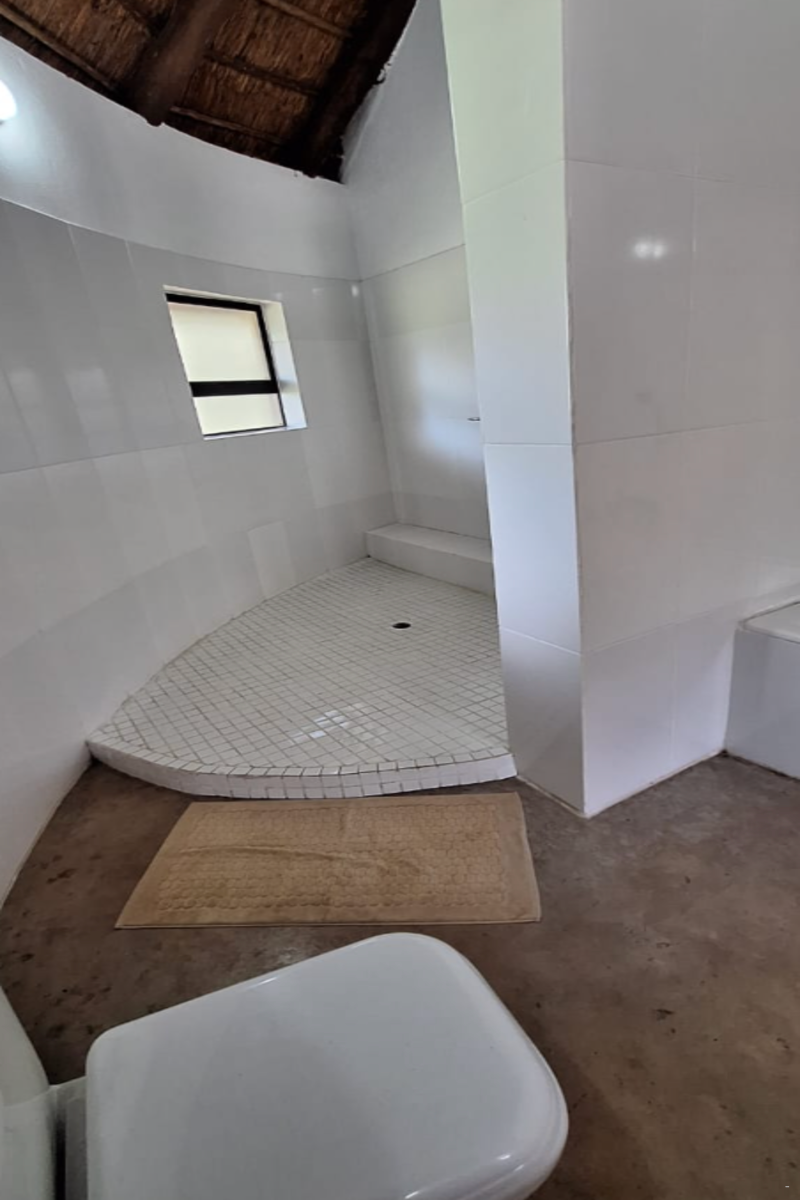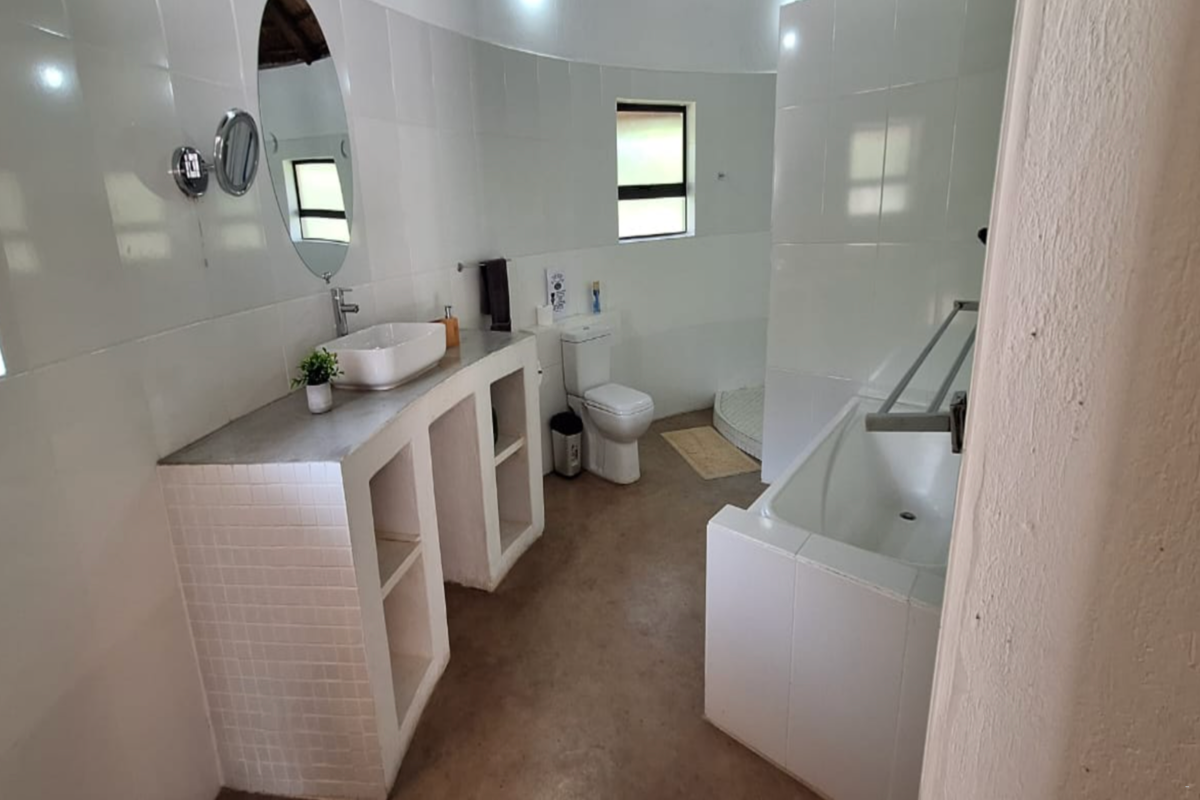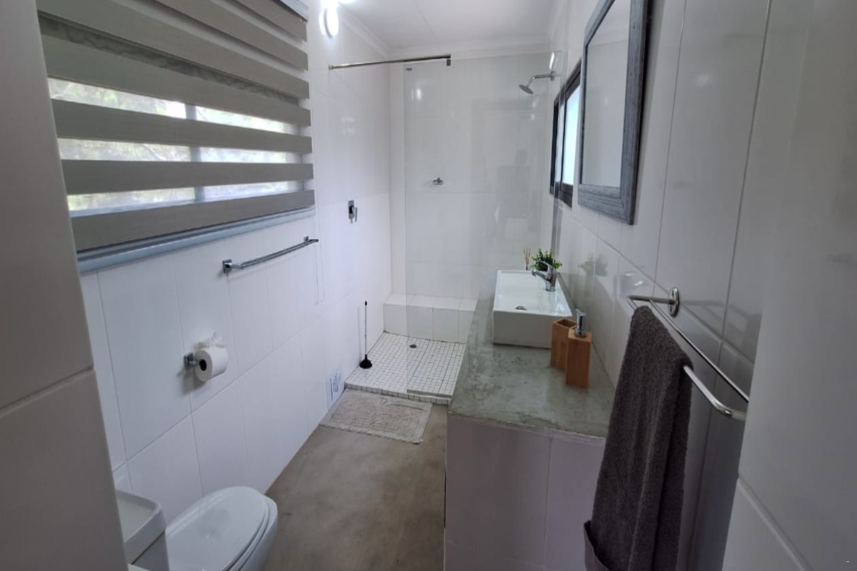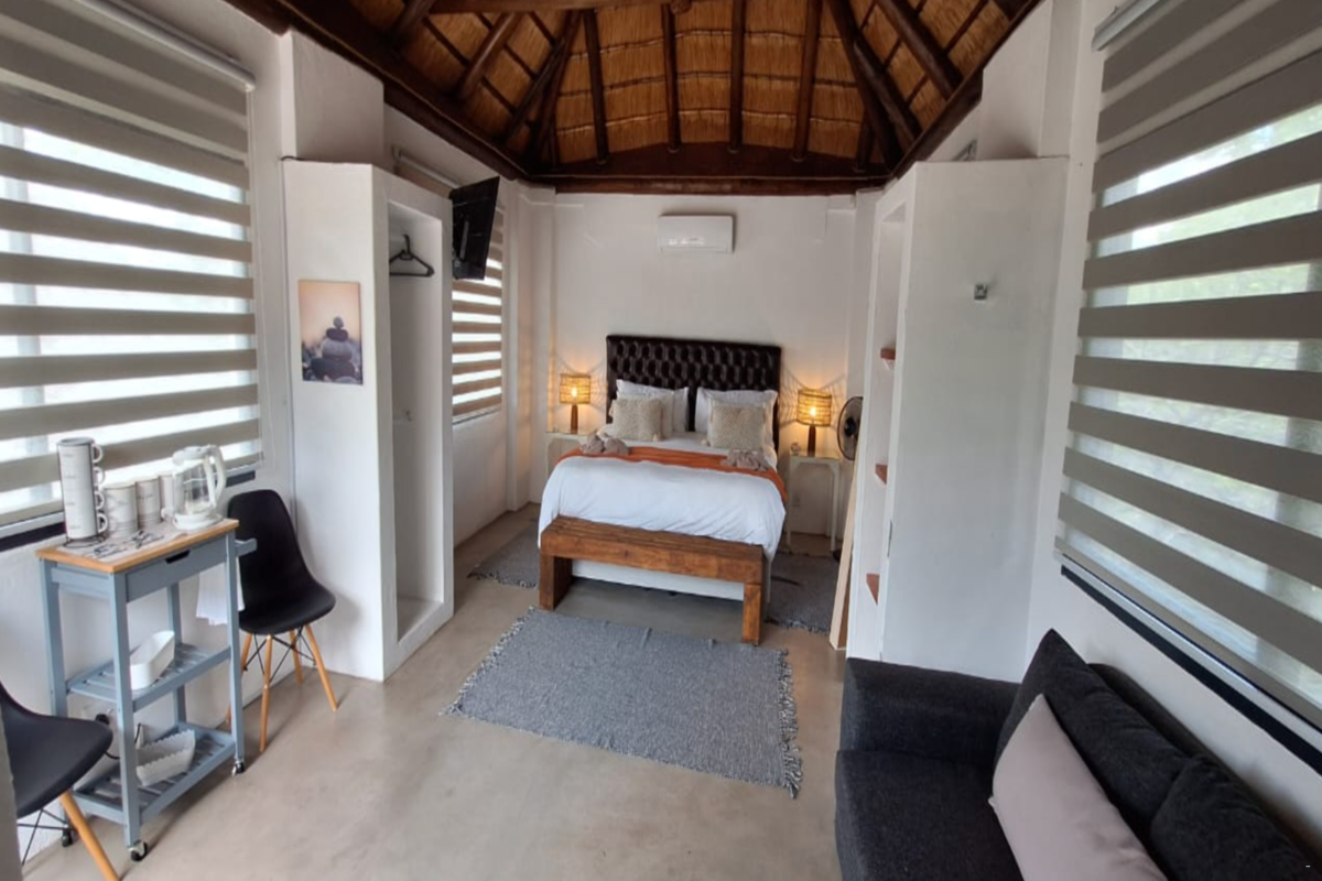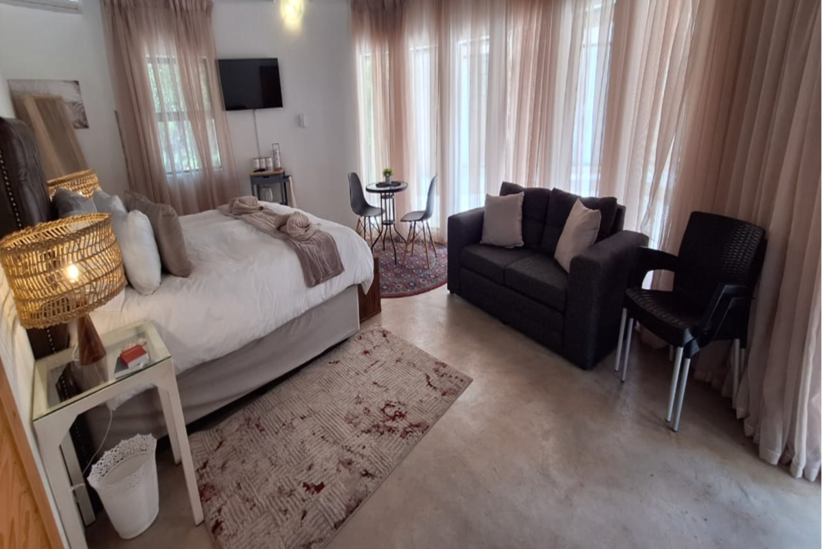 Guests have access to a shared kitchen, which is equipped with a stove, bar island with stools, tea- and coffee-making facilities, a microwave, fridge-freezer, and all necessary crockery and cutlery. The communal lounge and dining area offers comfortable seating with a dining table and chairs, providing a relaxed space to unwind and enjoy meals. Outside, guests can make use of the communal swimming pool and the outdoor braai area, ideal for relaxing and socialising in a natural bush setting.