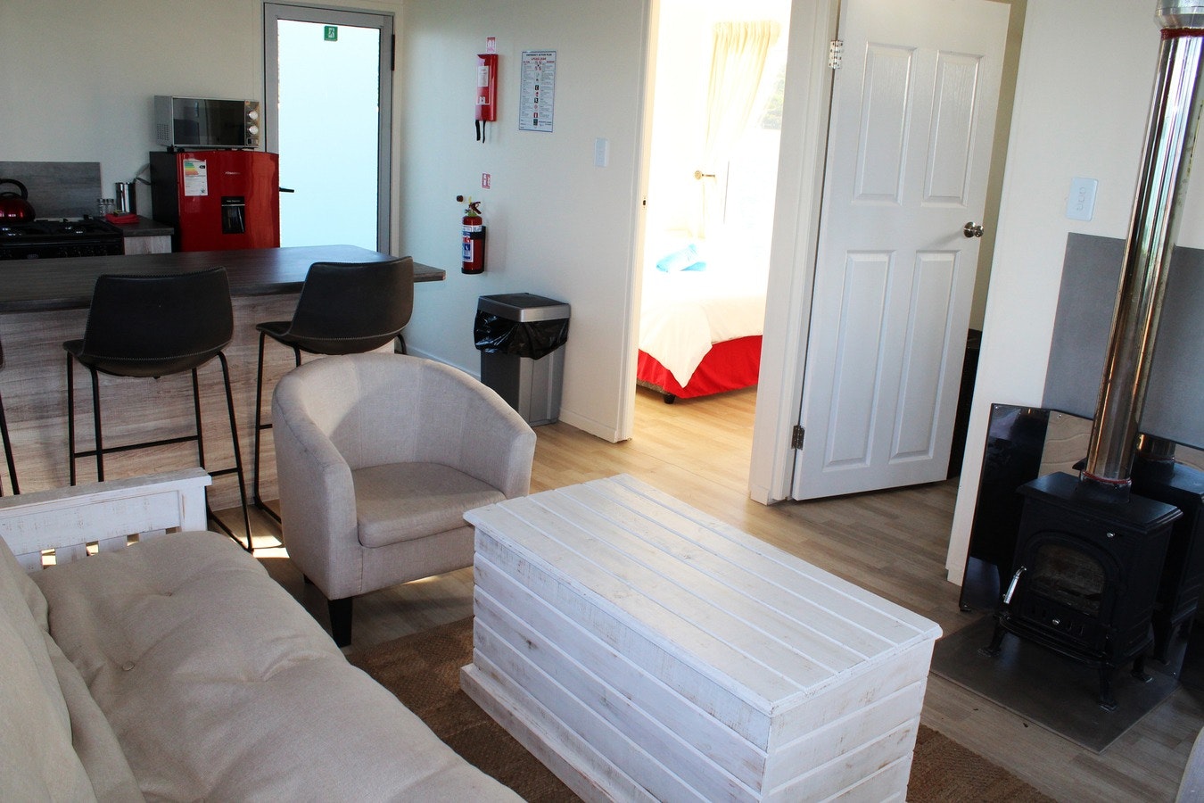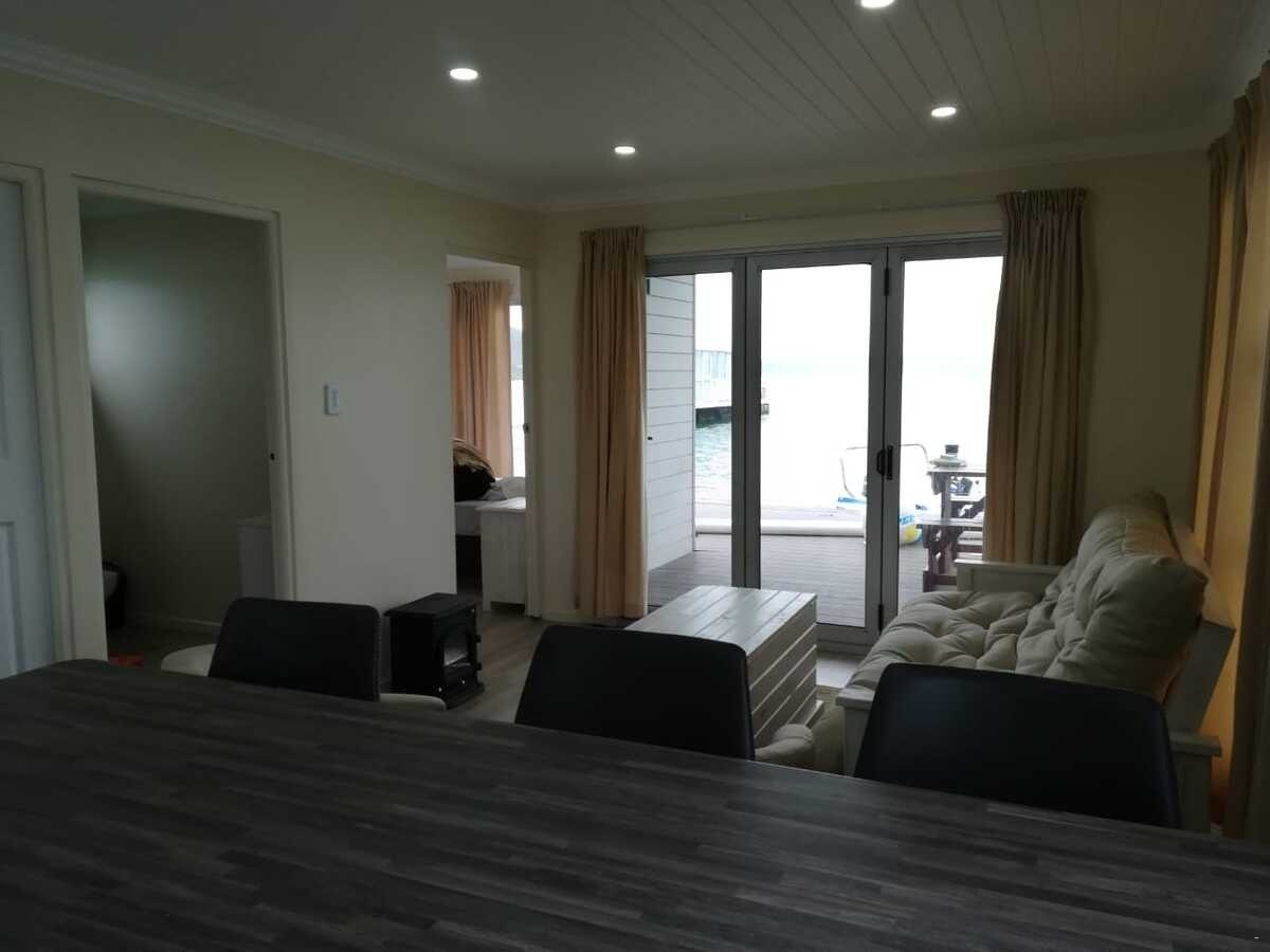 The living area features an open-plan design with a fully equipped kitchen including a stove, oven, microwave, kettle, fridge-freezer, cutlery, and crockery. For added convenience, there is an island in the kitchen perfect for preparing meals. The lounge is furnished with a comfortable couch as well a fire place for colder nights.This houseboat uses solar electricity only.