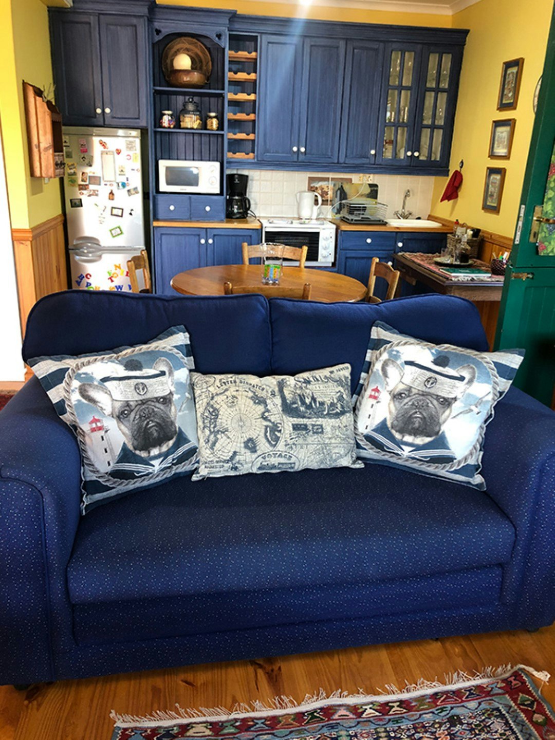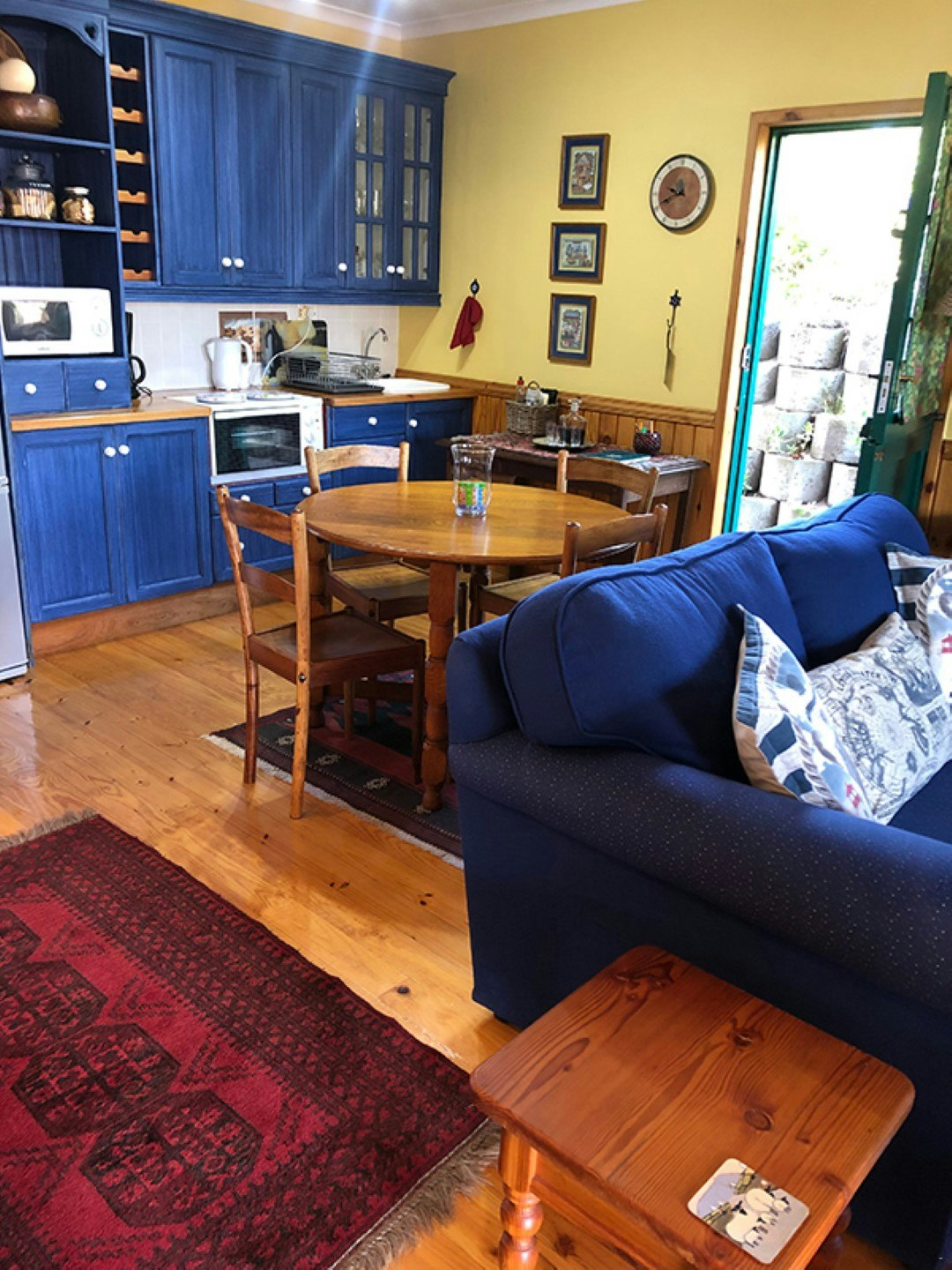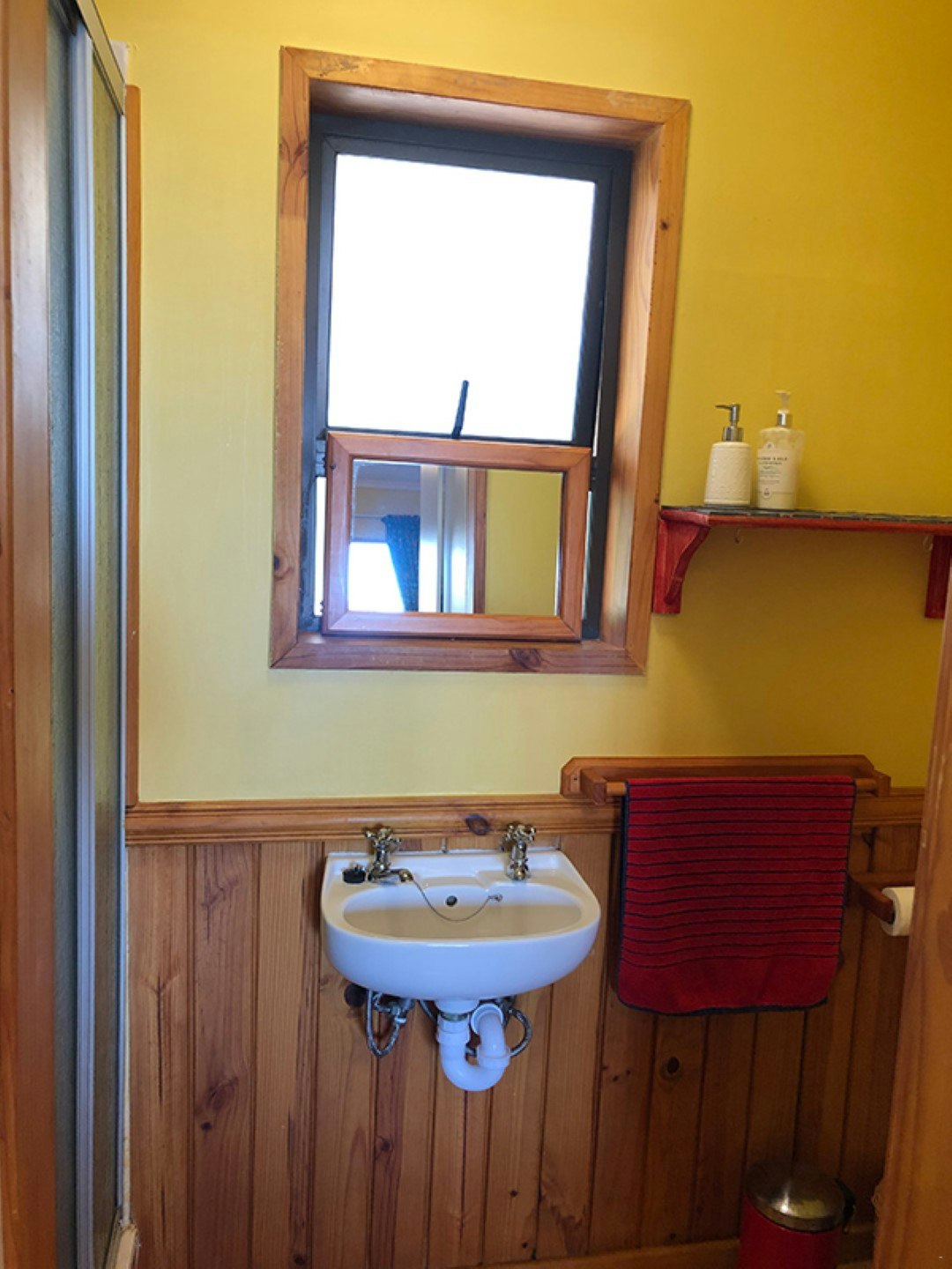 The kitchenette is well equipped and features 2 induction plates, an air fryer, fridge-freezer, a microwave, kettle, crockery, and cutlery. The open-plan living area has a dining table with 4 chairs; and a lounge area with a sleeper couch and a flat-screen TV with Netflix and Showmax. Wi-Fi is also available. There are braai facilities available.