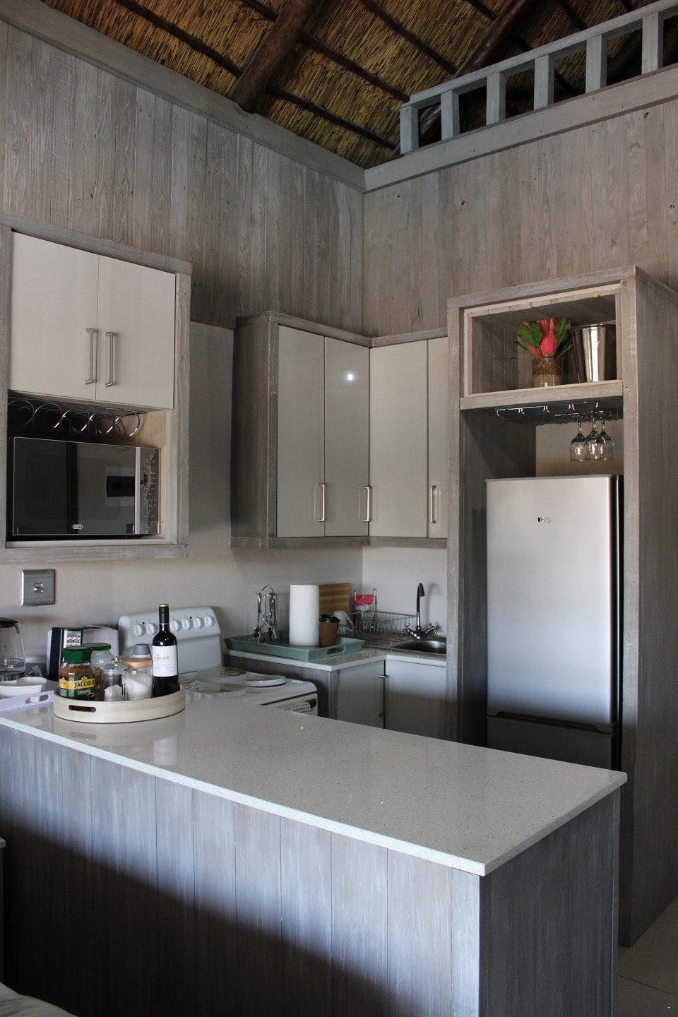 The Oryx has 2 lovely self-catering 4-sleeper units that can accommodate 4 guests each and comprise 2 bedrooms and a bathroom each. The main bedroom area is furnished with a queen-size bed and a TV with exclusive DStv. The loft bedroom is furnished with 2 single beds. The bathroom is fitted with a bath, a shower, a toilet and a washbasin. The kitchen area is equipped with a stove, oven, microwave, fridge-freezer, tea- and coffee-making facilities, and cutlery and crockery. This unit also has access to a communal patio that has a bench and a view of the communal swimming pool area.