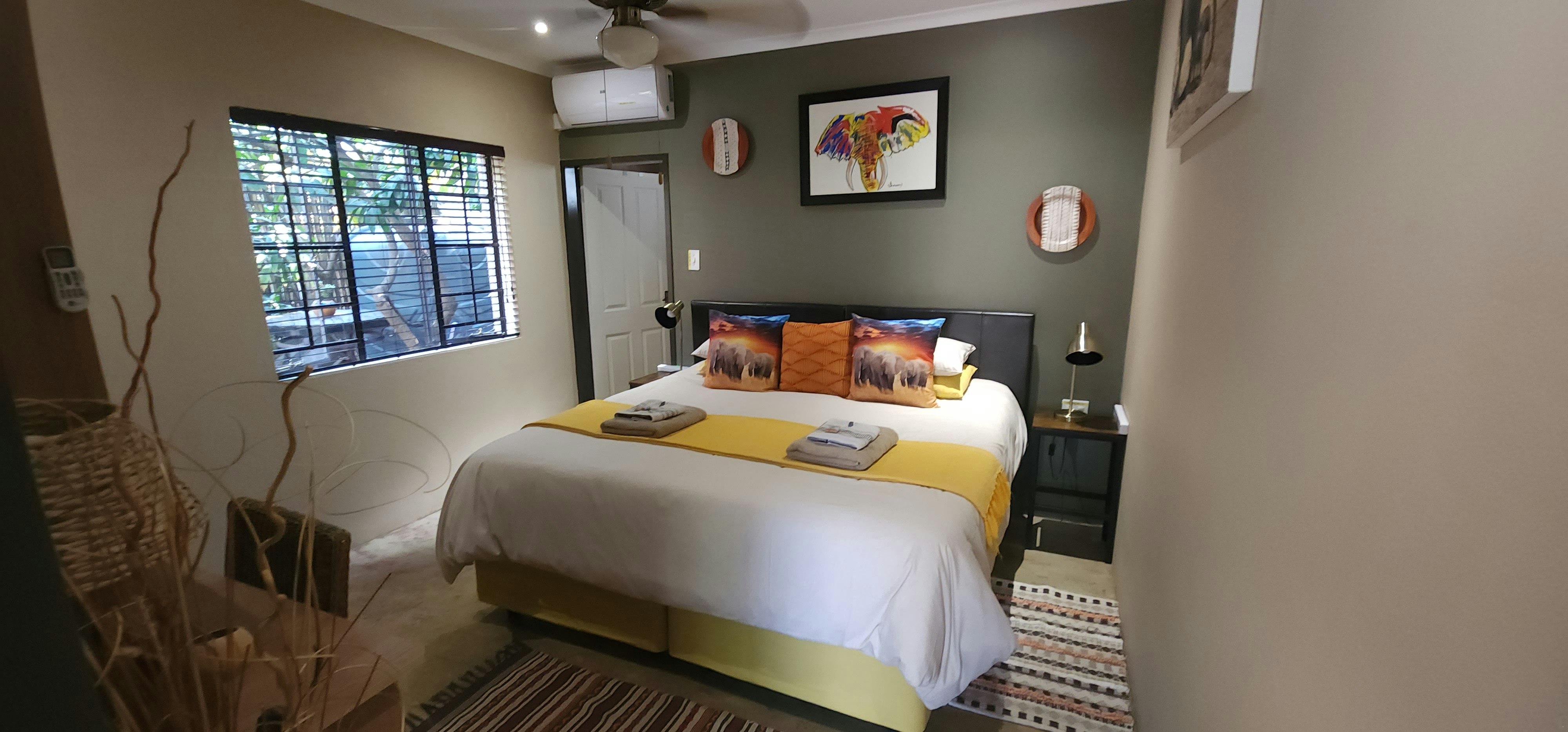 The 3 units are fully self-catering and have sleeping capacities ranging from 2 to 4 guests per unit. Please inquire if there are additional guests. The Shumba, Mbizi, and Aloe unit is furnished with a king bed that can be converted into twin beds, and some have a sleeper couch or single beds included that are perfect for children. The Tranquility Room is furnished with a queen size and a small kitchen outside the unit. The bathrooms are fitted with either a shower, or shower-over-bath, basin, and toilet. All linen and towels are provided.