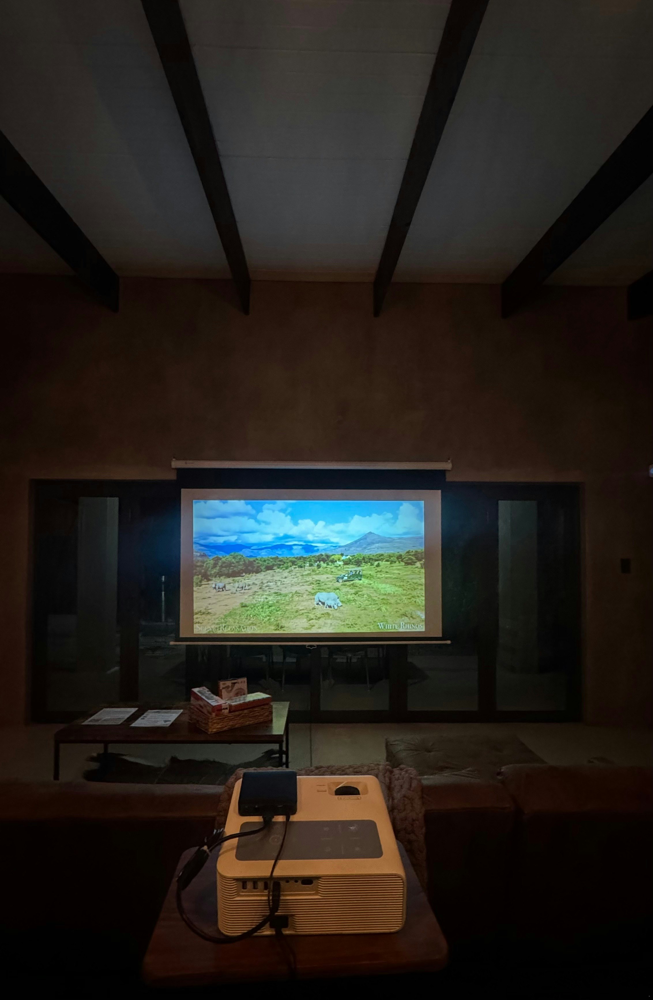 The open-plan living space features a lounge furnished with a comfortable couch and a kitchen equipped with a fridge, gas stove, microwave, washing machine and dishwasher. The living space also features a pizza oven and a projector with DStv and streaming services.