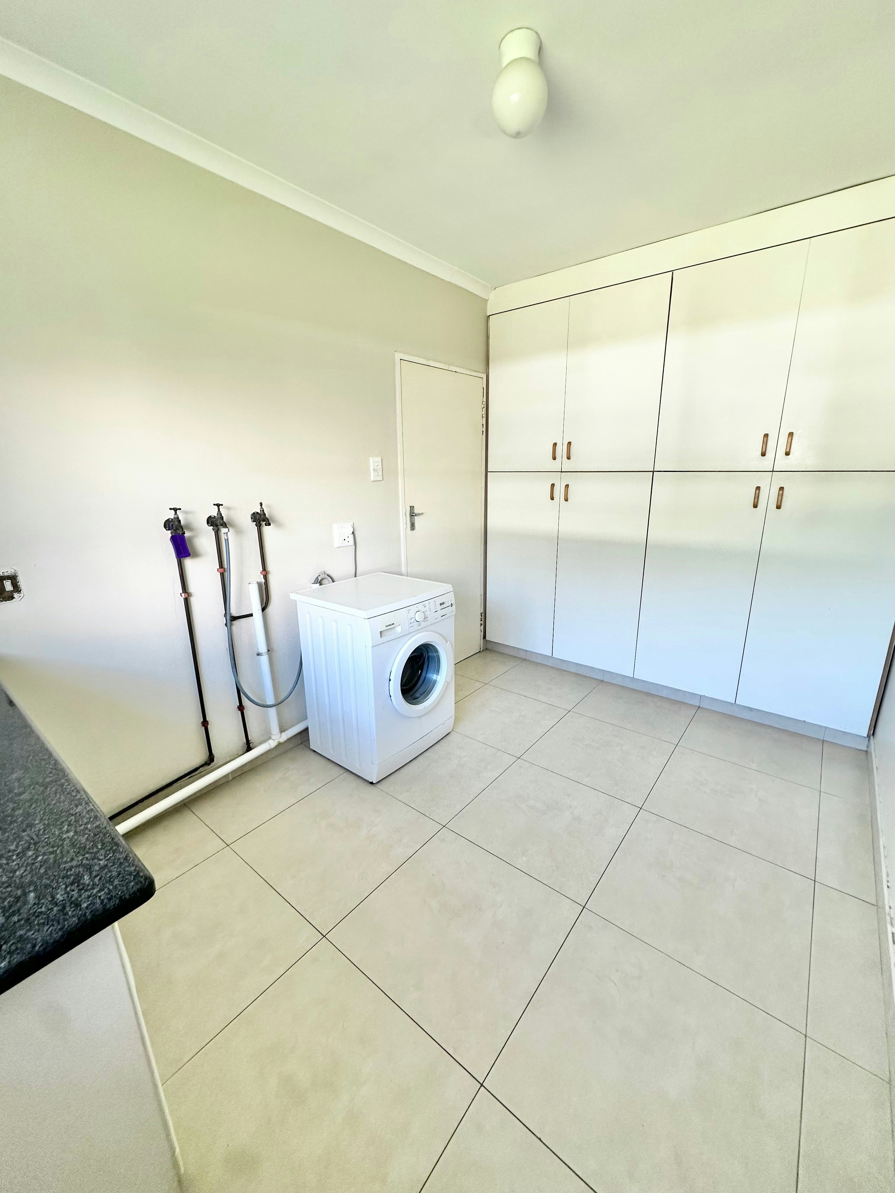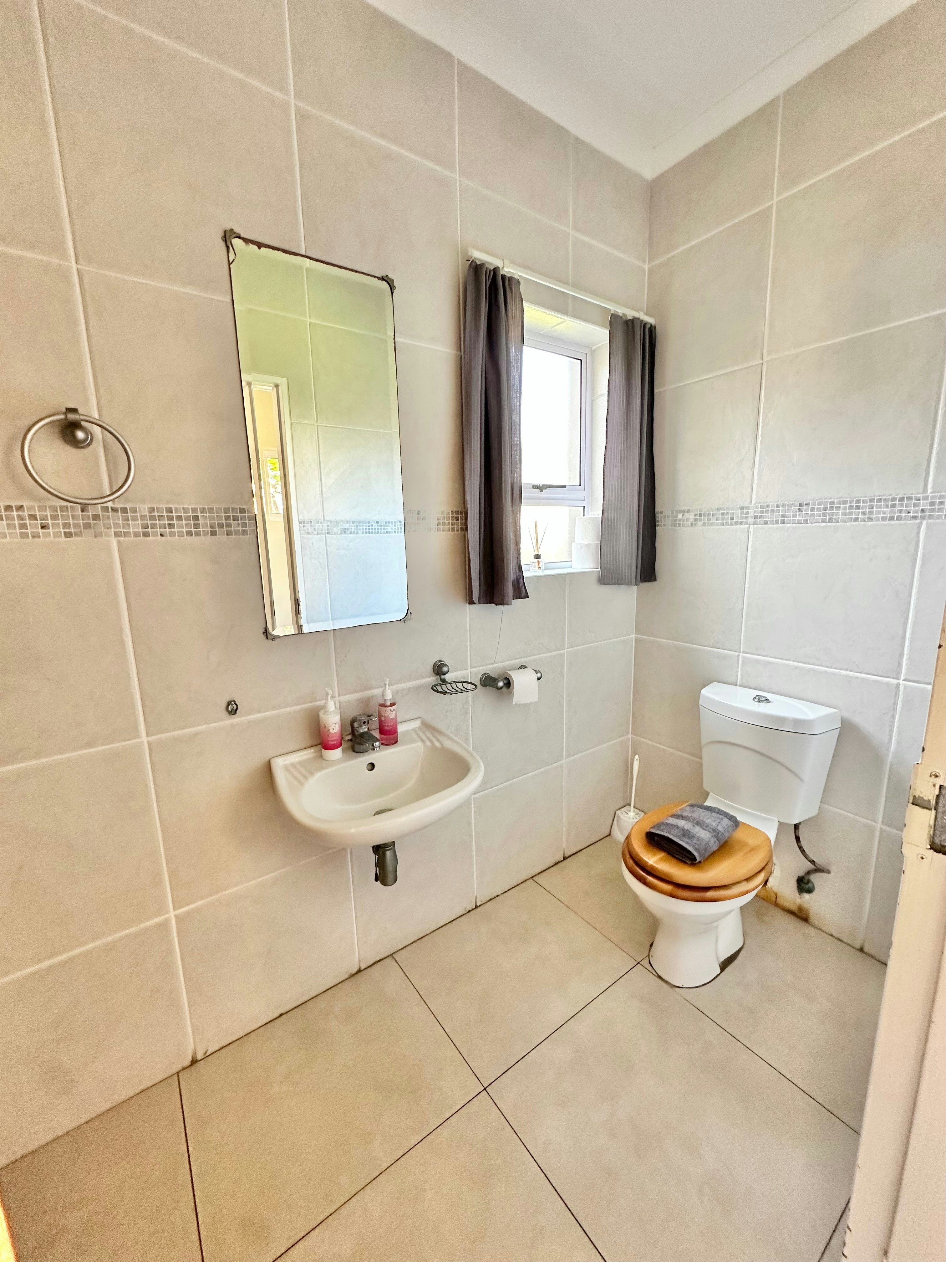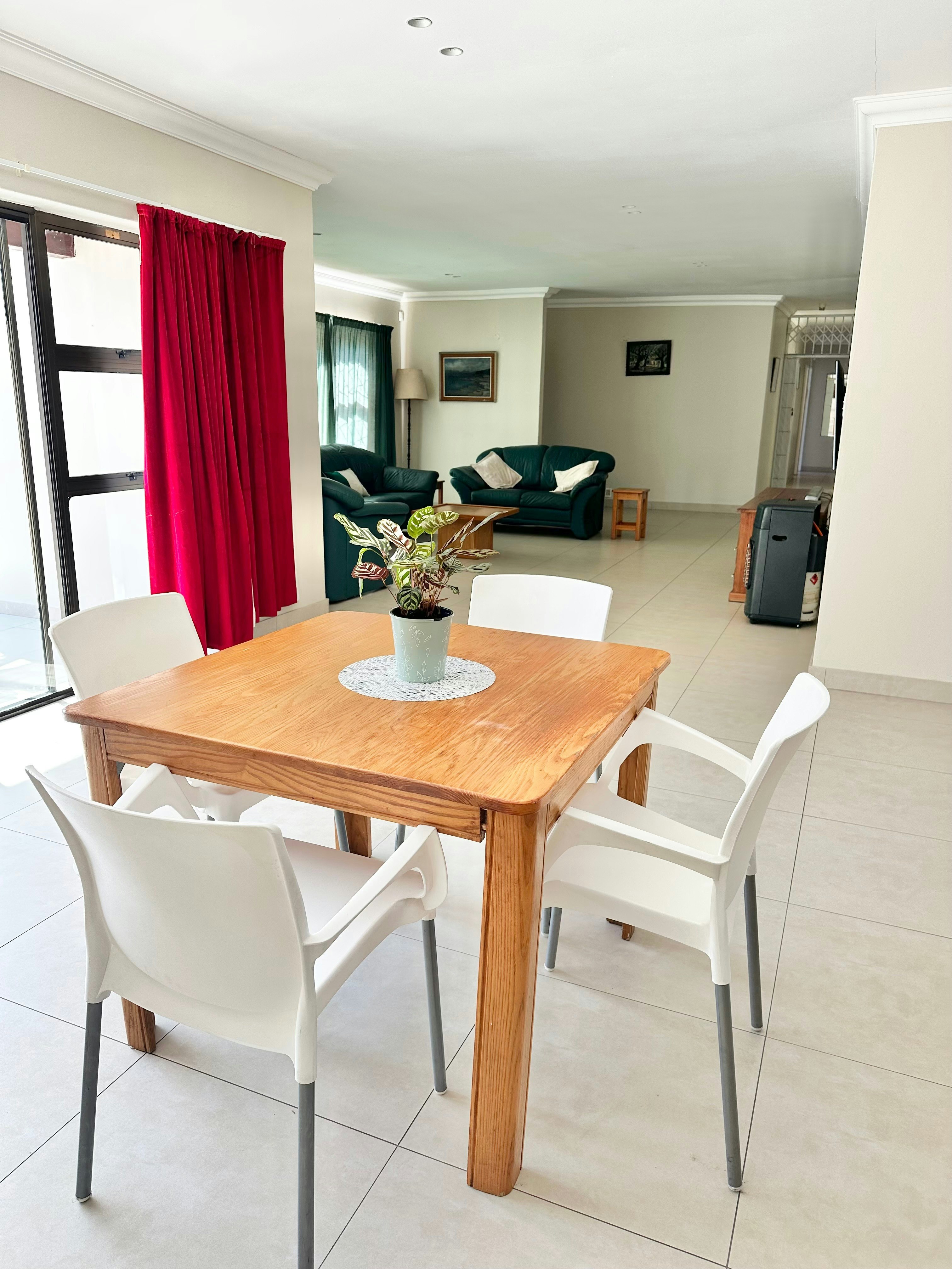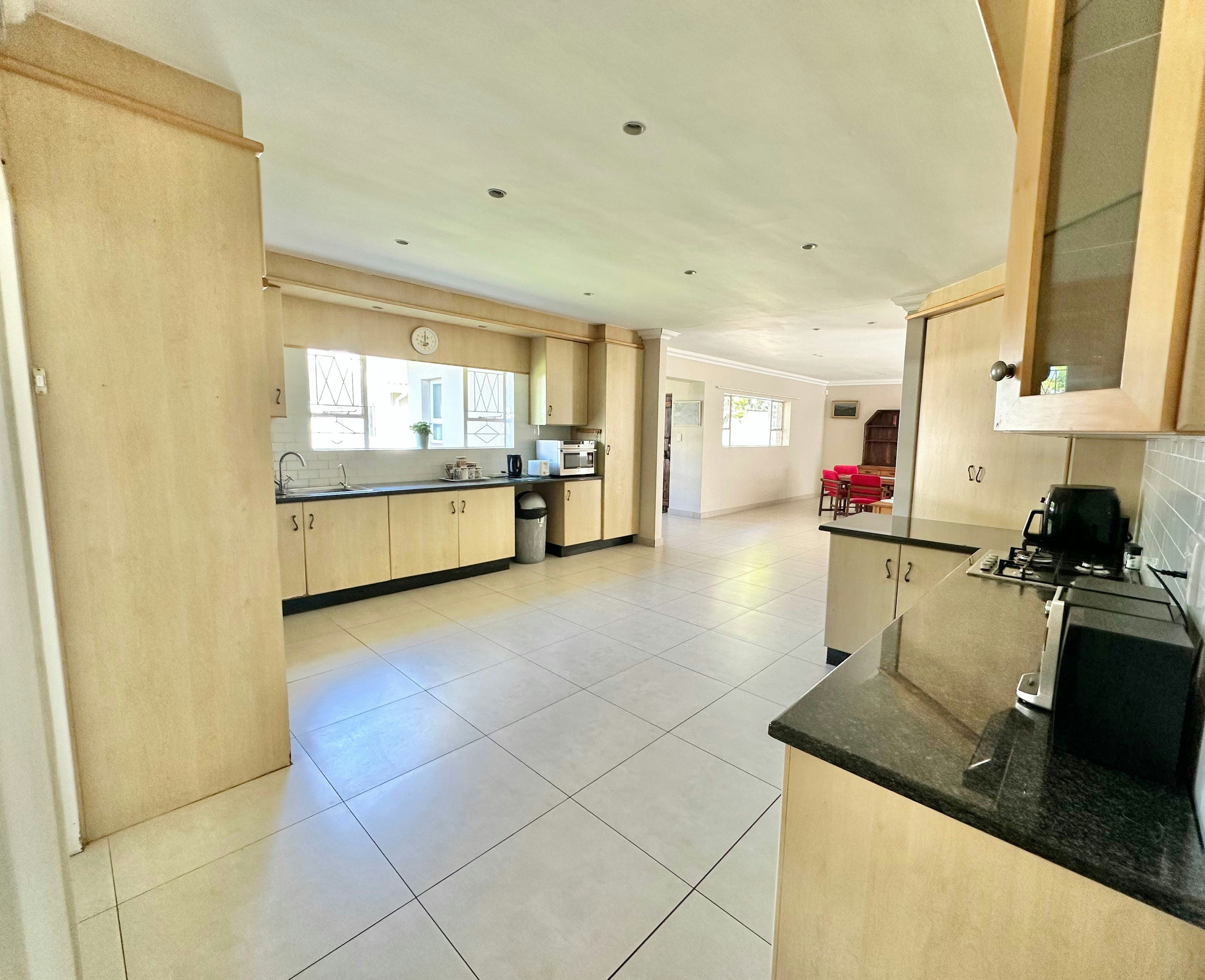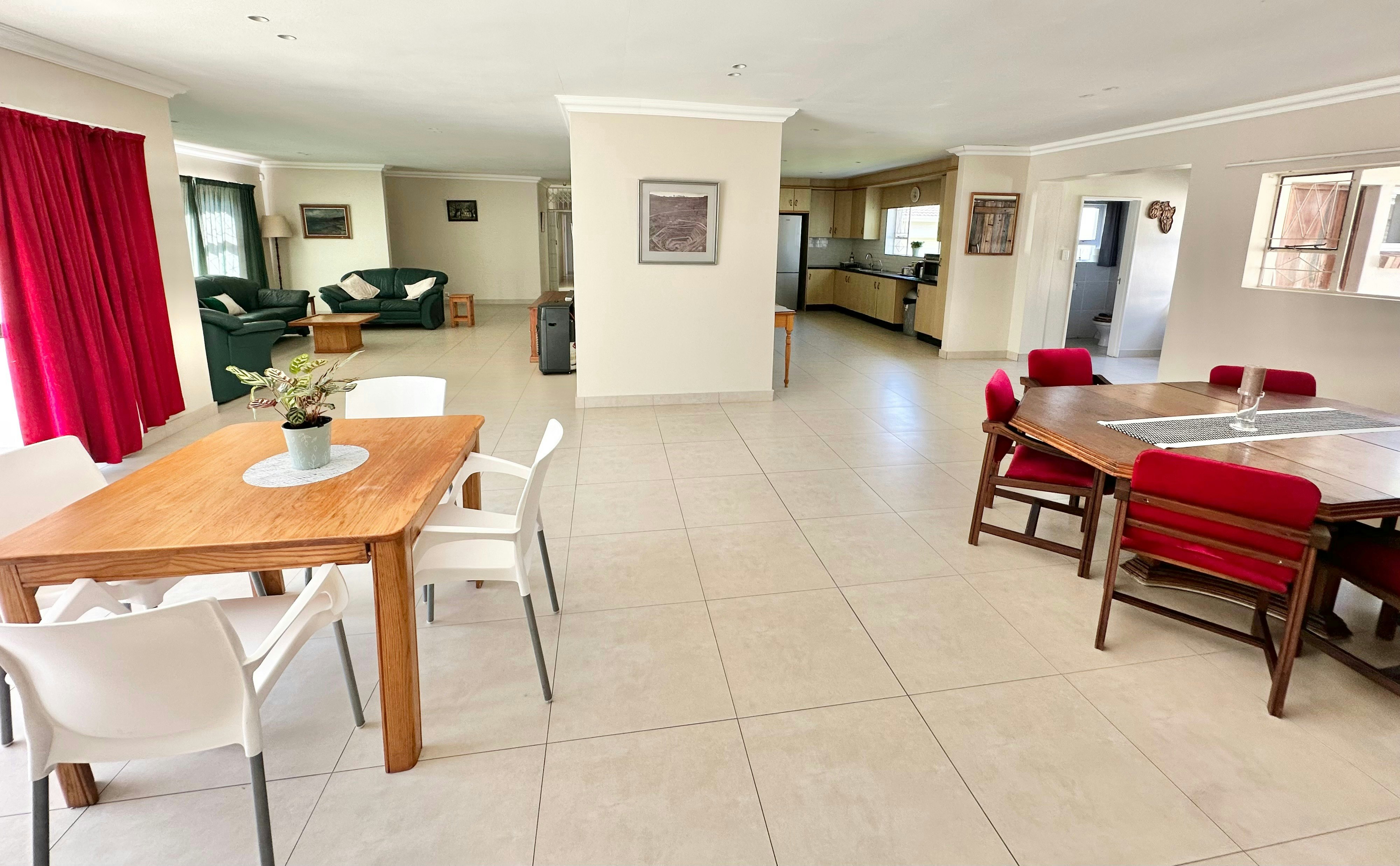The living areas include a modern kitchen equipped with a fridge-freezer, gas stove, electric oven, cutlery and crockery, and tea- and coffee-making facilities. A washing machine is also available in the separate scullery for added convenience. The adjacent dining area contains a 6-seater dining table and flows effortlessly into the lounge, which is furnished with ample comfortable seating, a smart TV with streaming services, and complimentary Wi-Fi access.