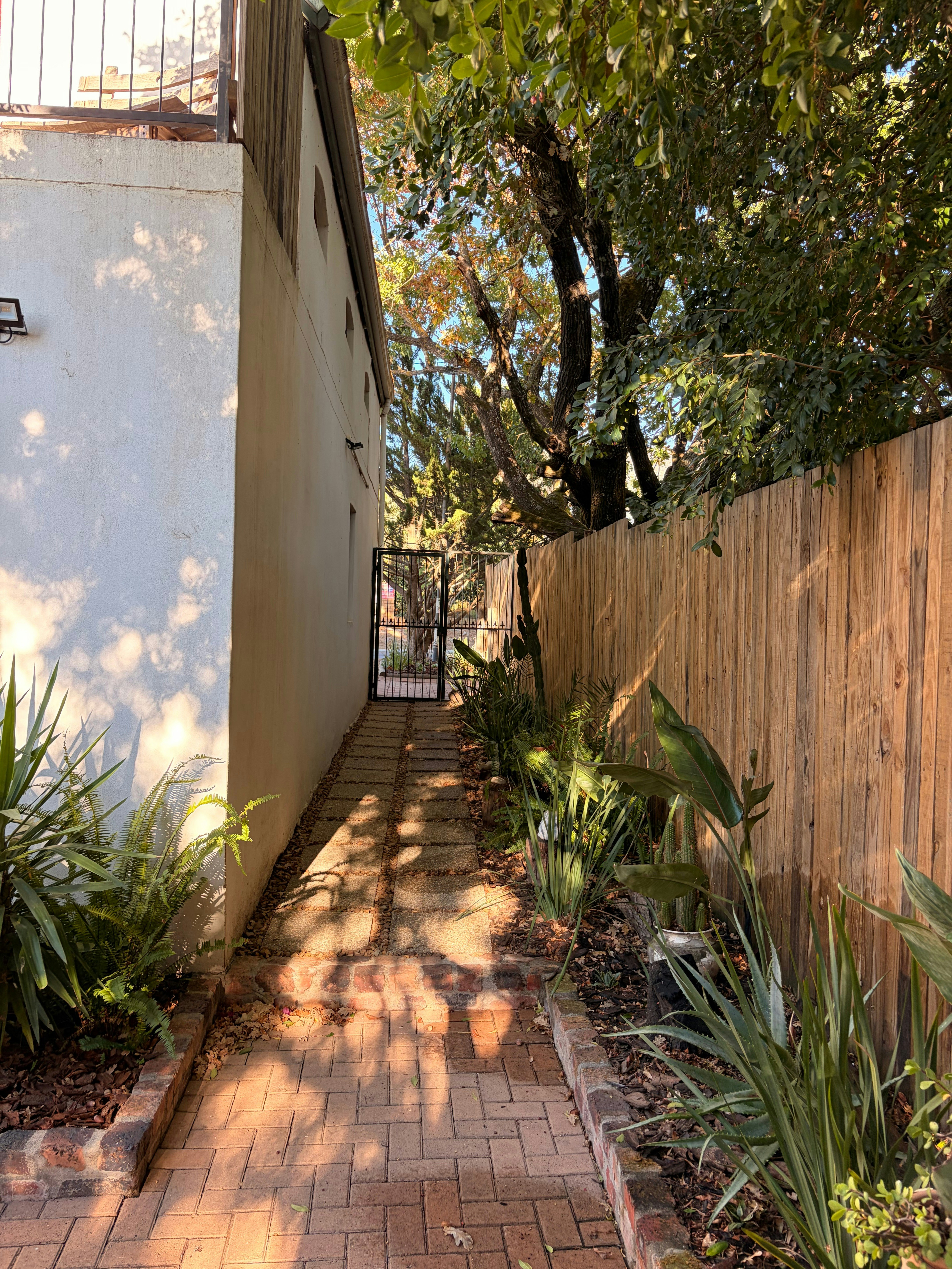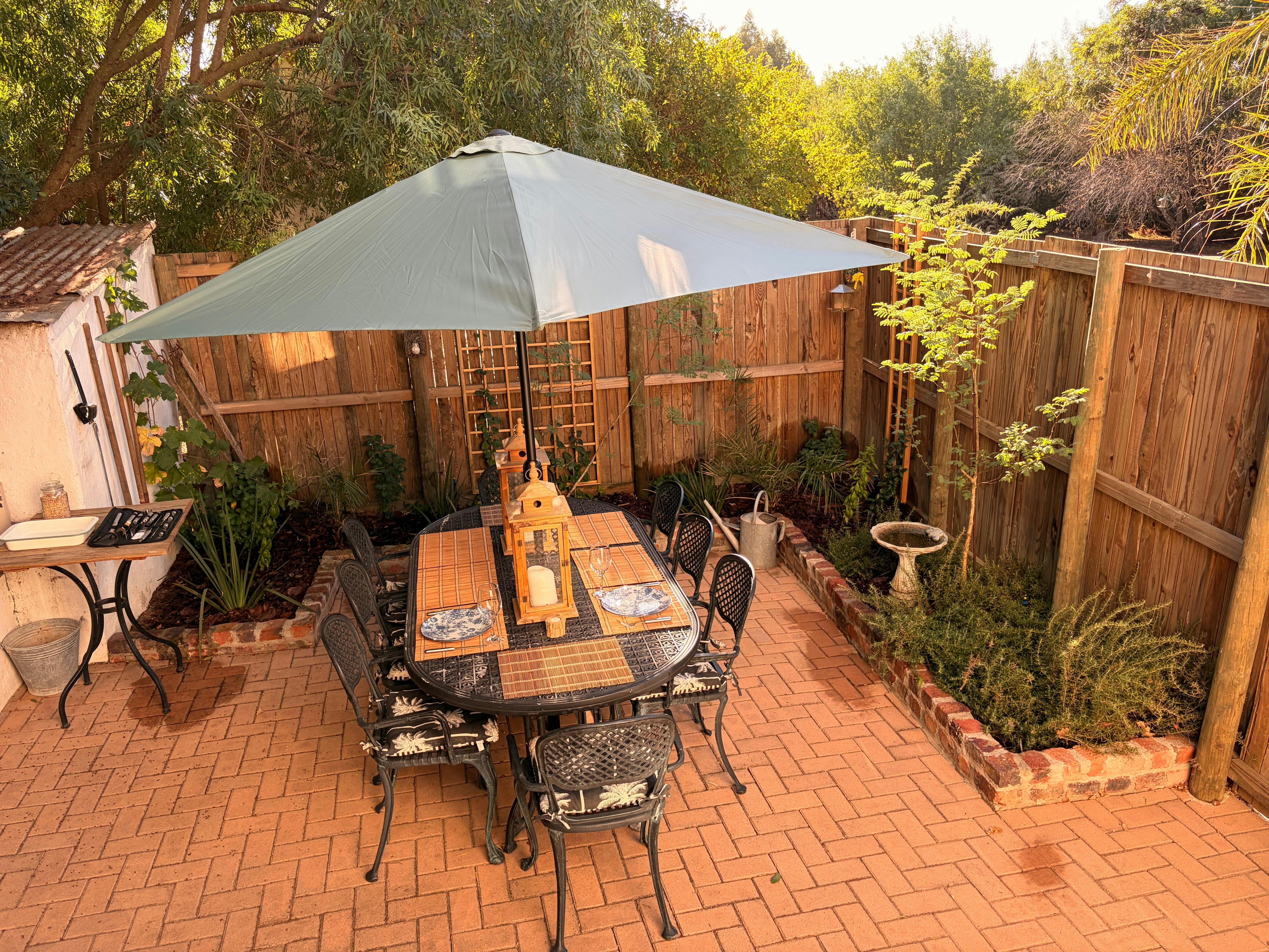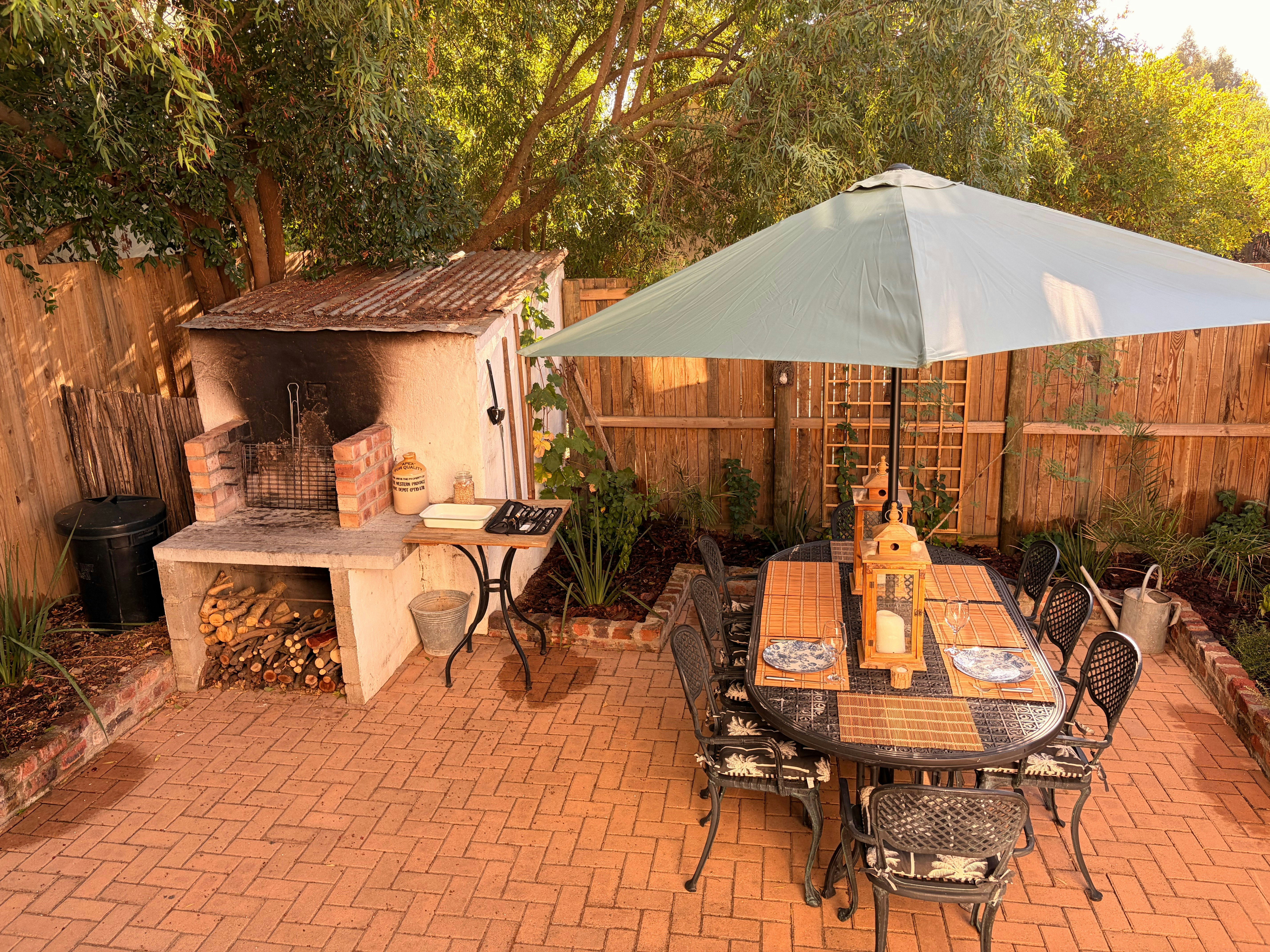 The staircase leads to the kitchen downstairs that’s equipped with a fridge, stove, oven, microwave, toaster, basic cutlery and crockery, as well as tea- and coffee-making facilities. The doors open to a small staircase which leads to the private courtyard with an outdoor dining table with chairs and braai facilities. Off-street parking is available on the private driveway.