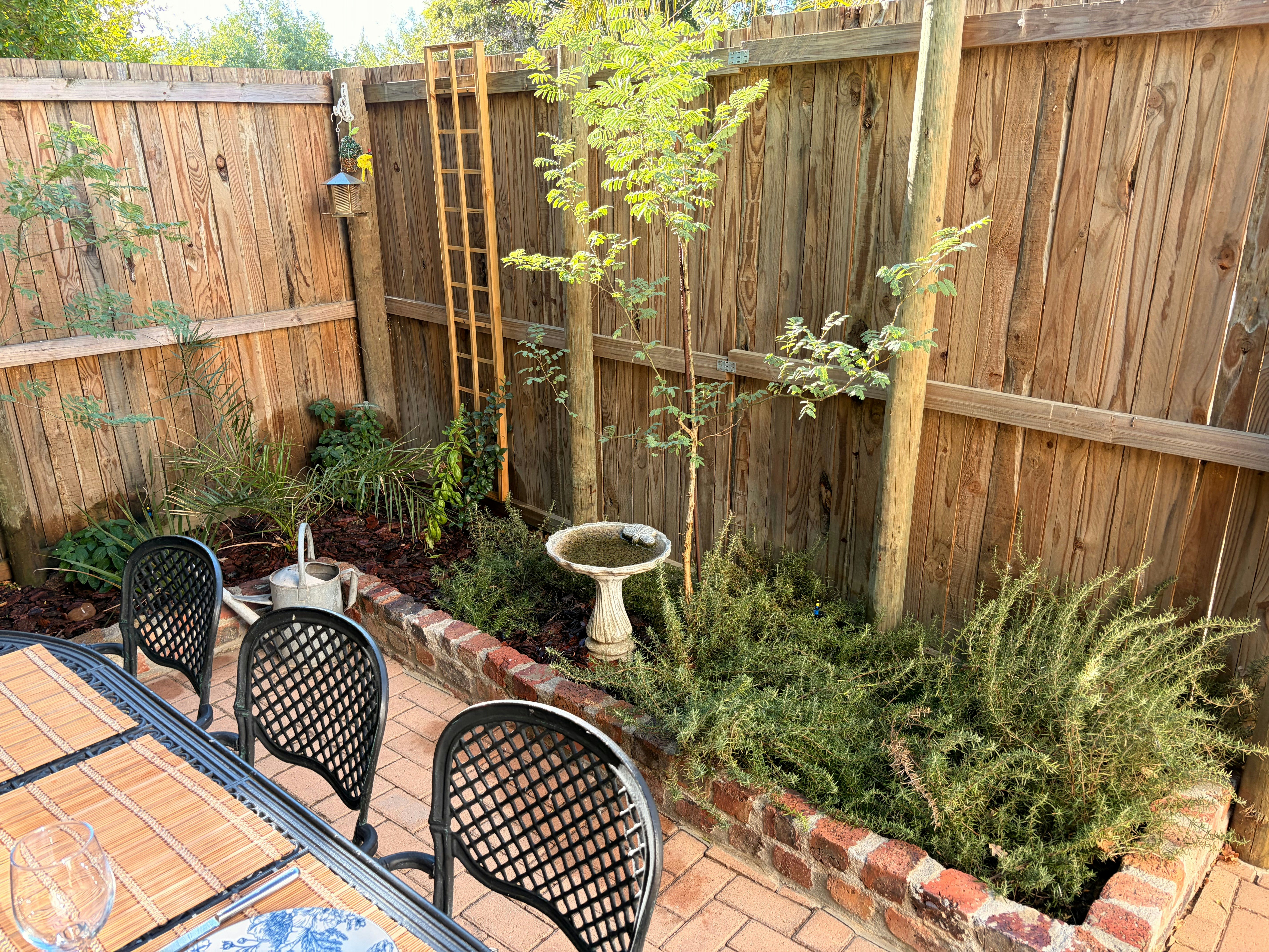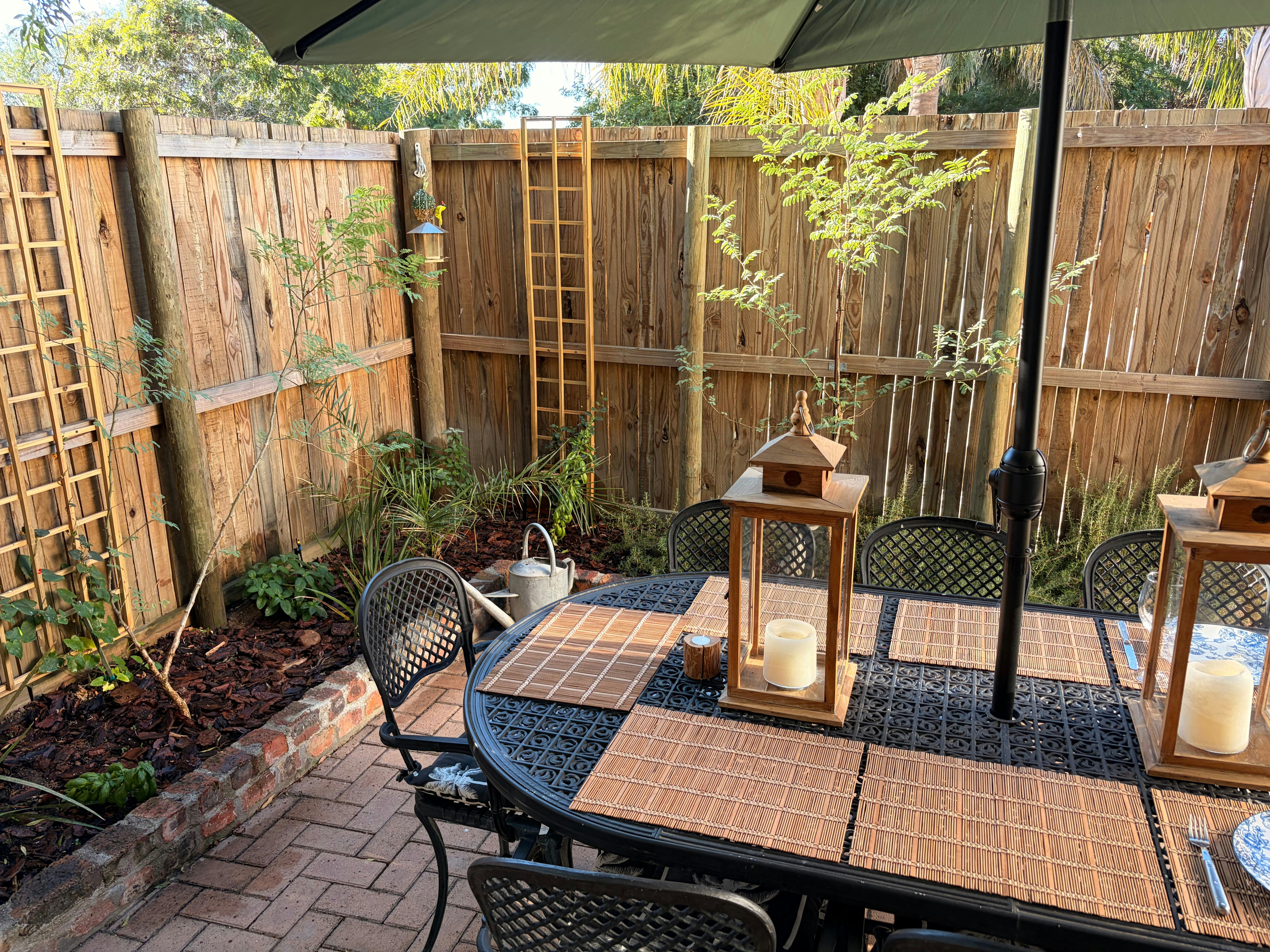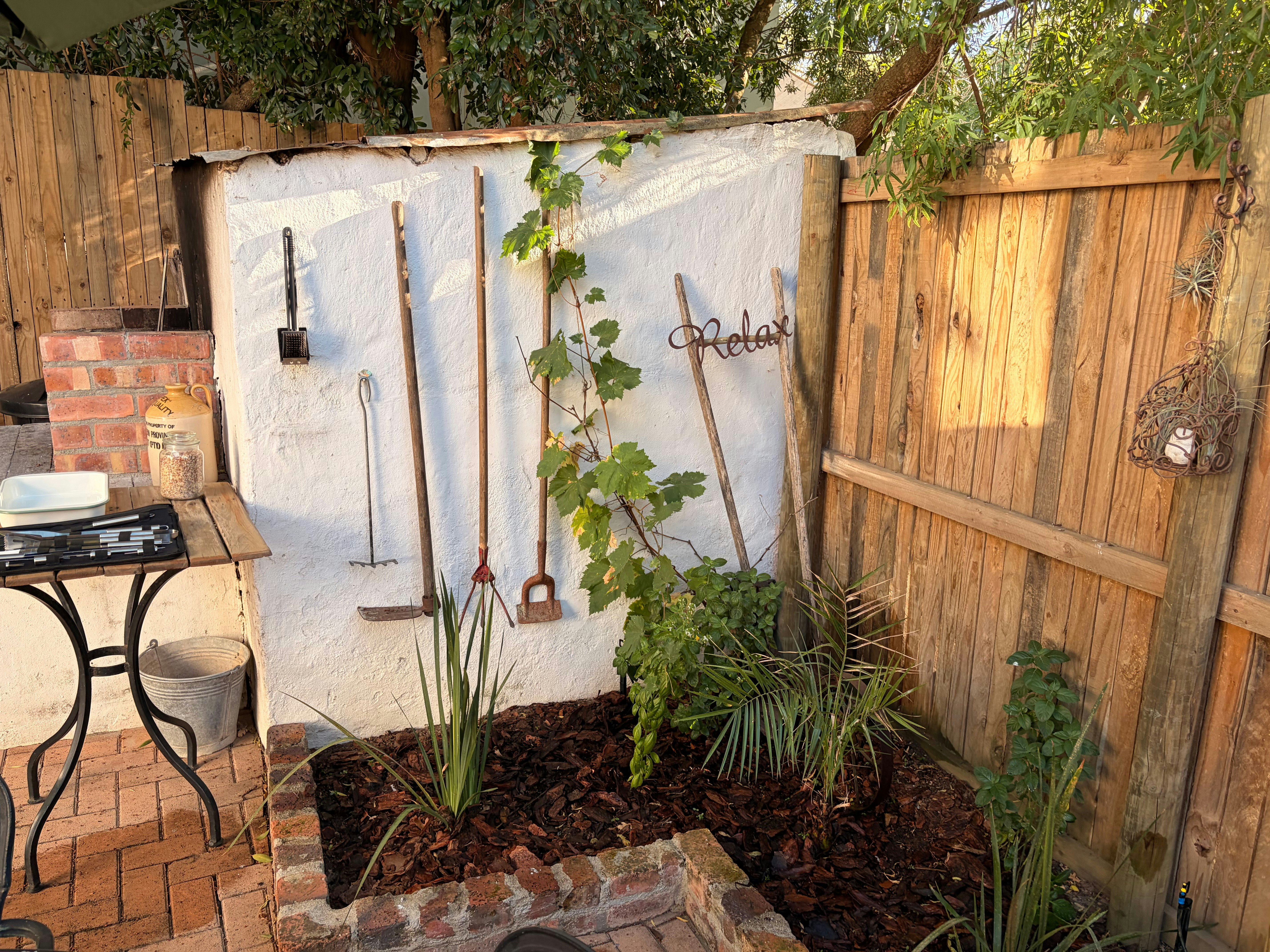 The staircase leads to the kitchen downstairs that’s equipped with a fridge, stove, oven, microwave, toaster, basic cutlery and crockery, as well as tea- and coffee-making facilities. The doors open to a small staircase which leads to the private courtyard with an outdoor dining table with chairs and braai facilities. Off-street parking is available on the private driveway.