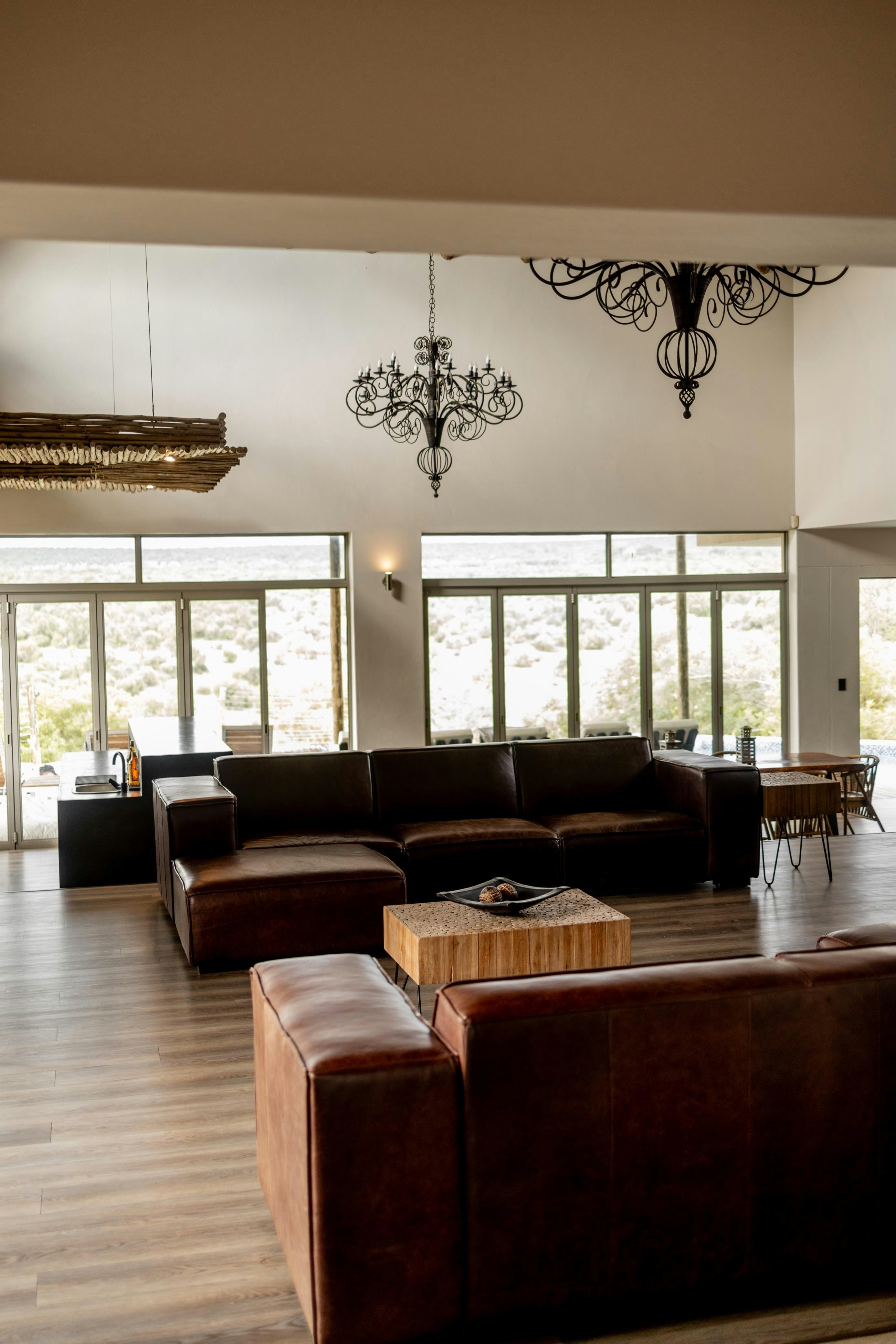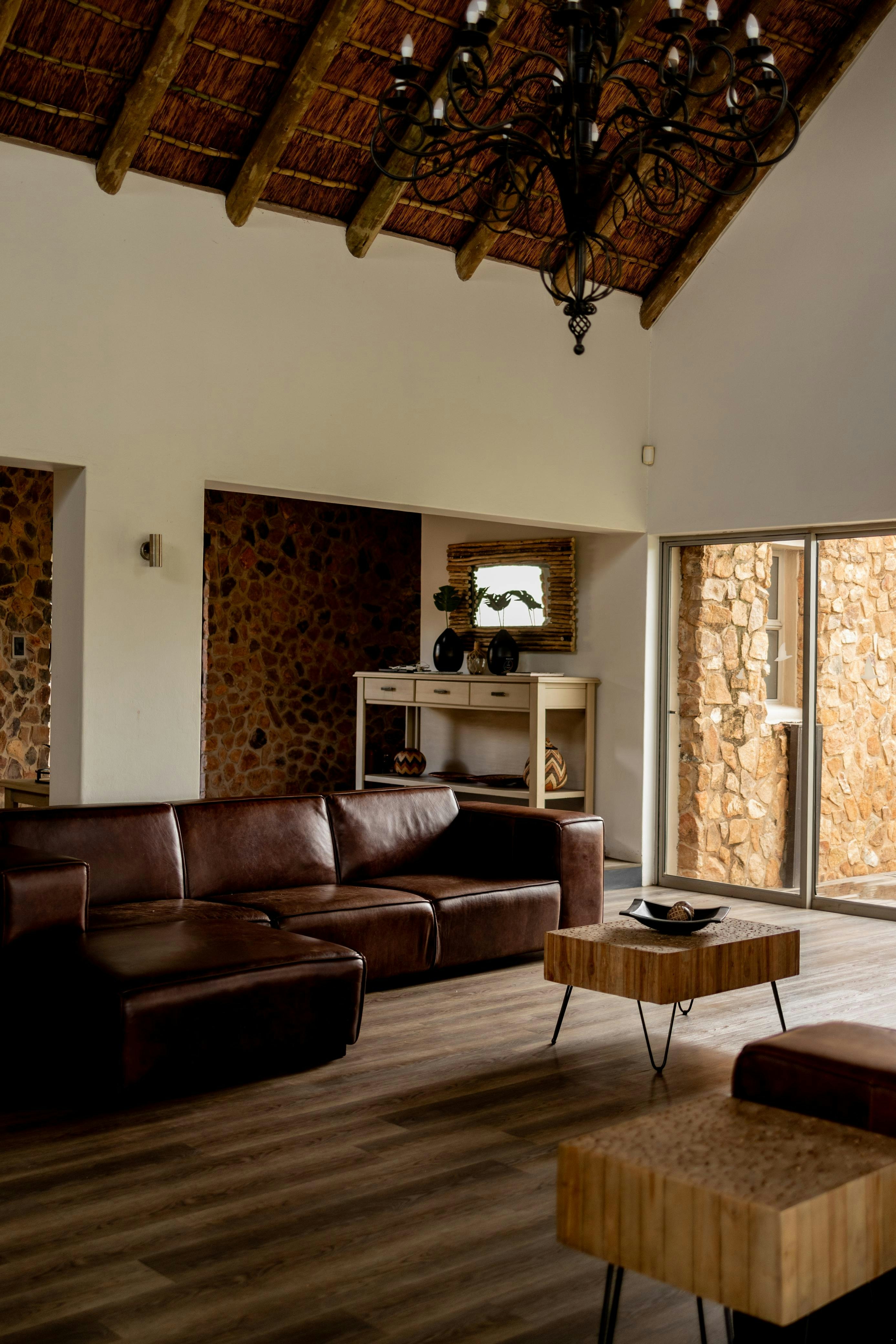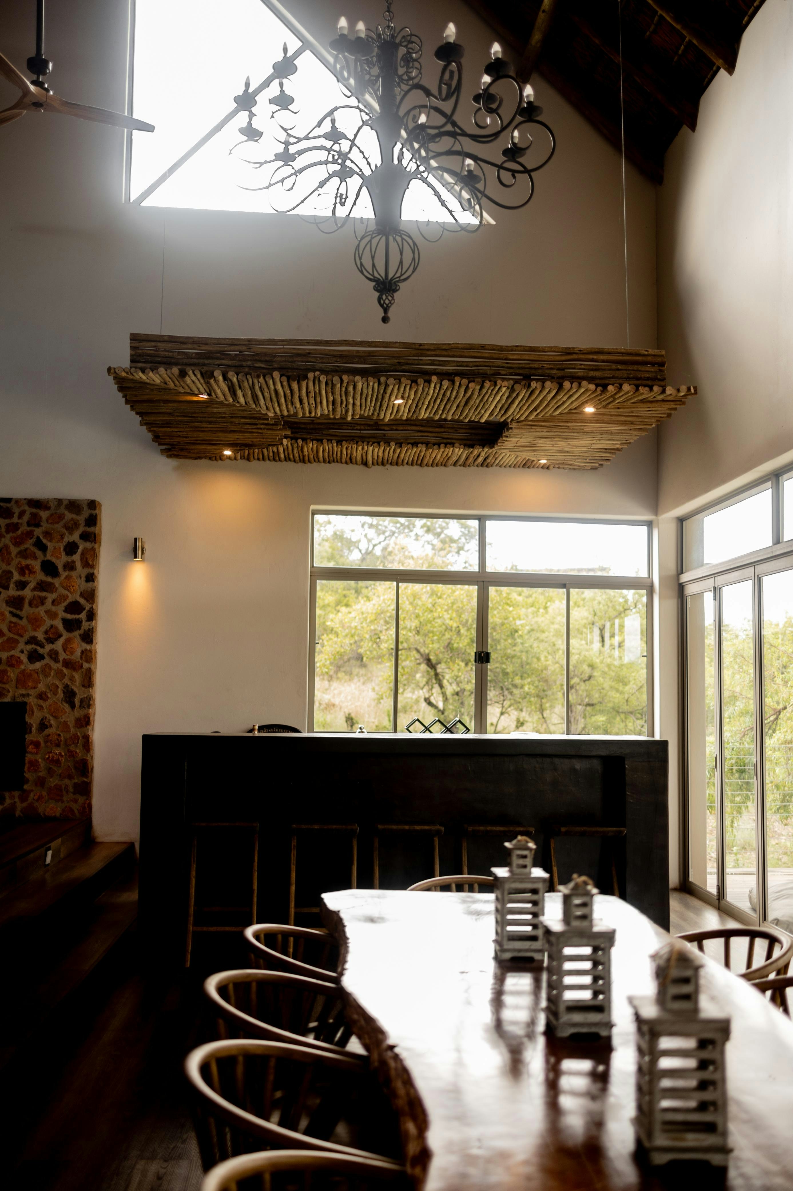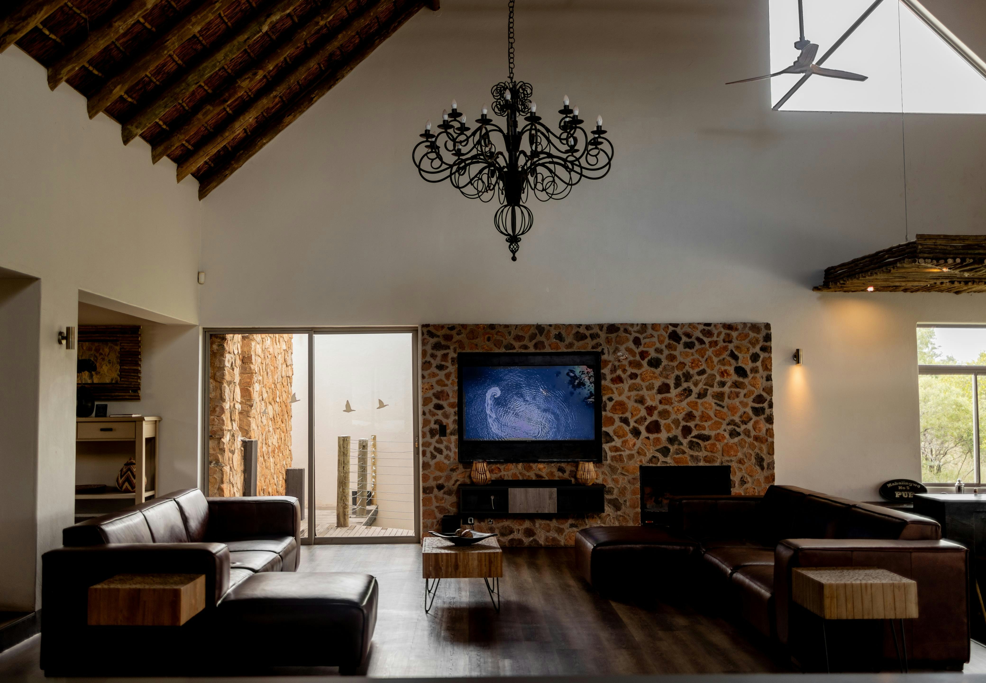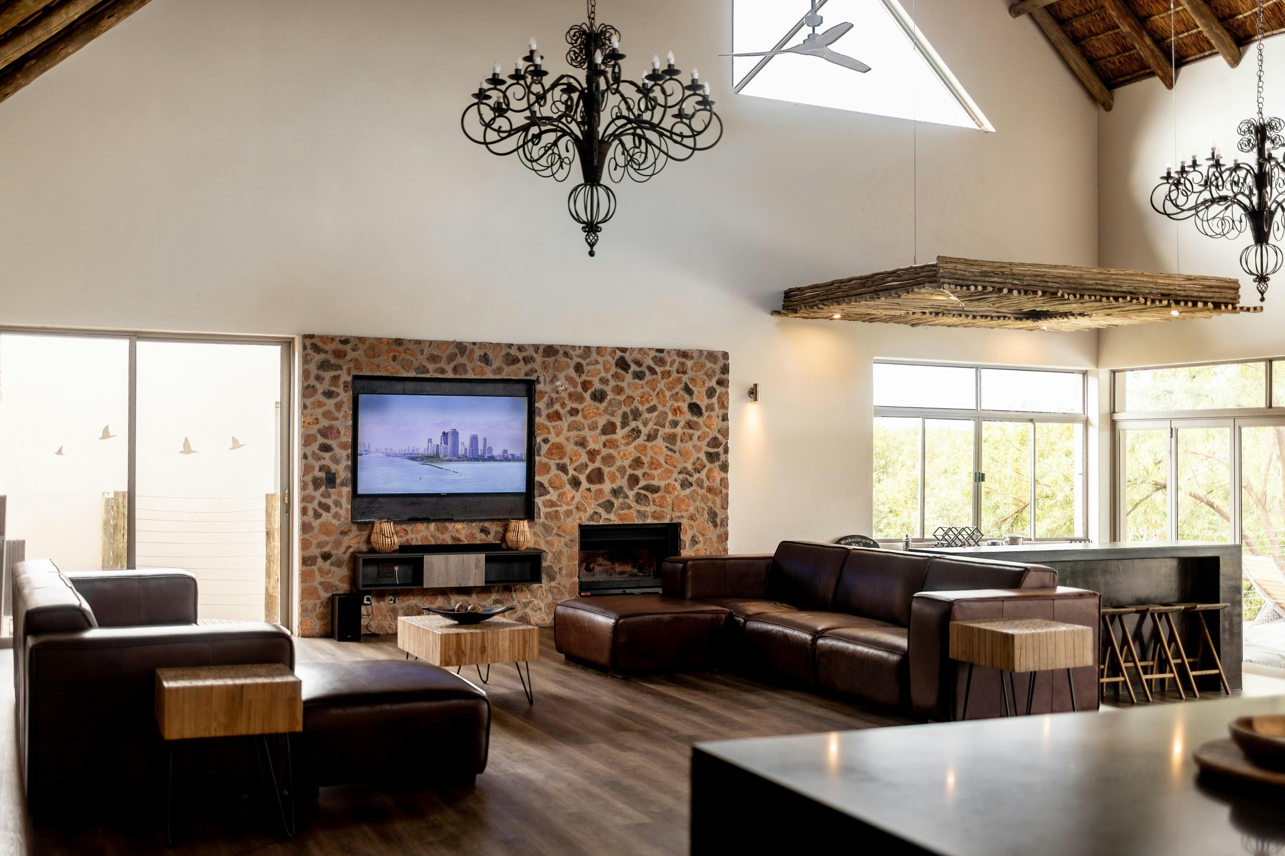 This lodge can accommodate 10 adults and 2 children under the age of 12. It comprises 4 beautifully furnished bedrooms, all located on the ground floor, with the fifth bedroom located upstairs. The bedrooms are all tastefully furnished with queen-size beds and have en-suite bathrooms with baths, showers, basins, and toilets. Each room comes with a mini bar, tea- and coffee-making facilities, and features a private balcony. There is also a guest toilet. Crisp linen and towels are provided.