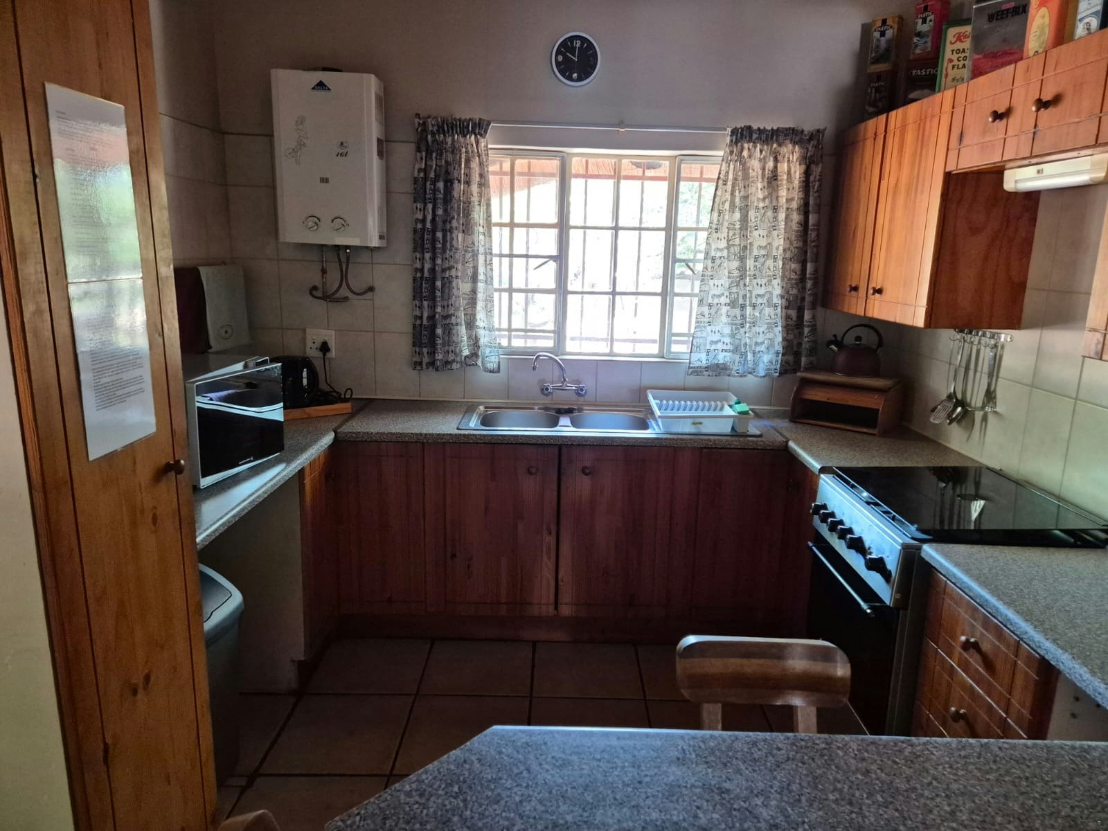 The air-conditioned open-plan living area features a kitchen fully equipped with a gas stove, electric oven, microwave, fridge-freezer, cutlery and crockery as well as a breakfast bar with stools. Leading from this kitchen is a lounge space with comfortable seating and a TV with a DStv connection. Guests are welcome to bring their own decoder and smart card.