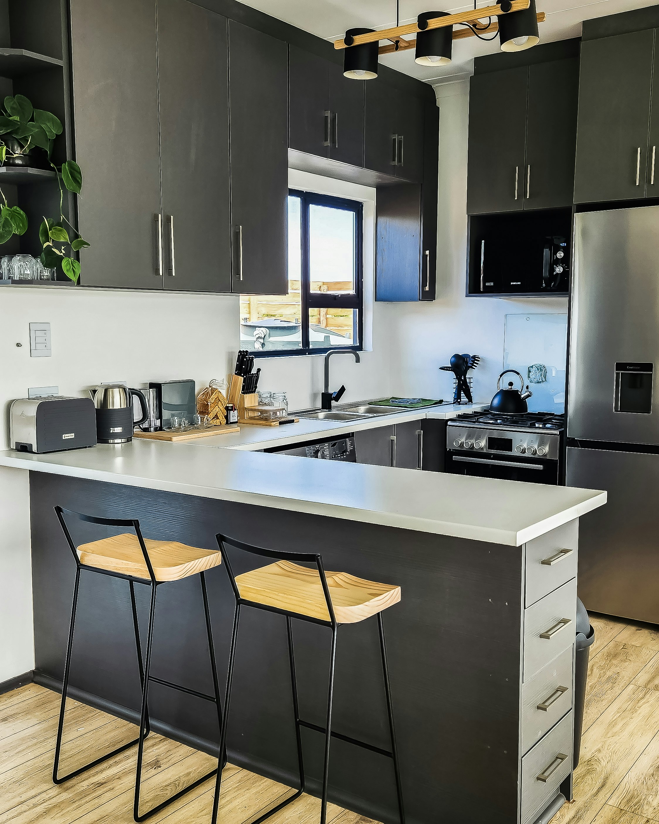 Die oopplan-kombuis is met 'n yskas-vrieskas, elektriese oond, gasstoof, mikrogolfoond, broodrooster, basiese eetgerei en breekware, asook tee- en koffiemaakgeriewe toegerus. Die kombuis-eiland dien ook as 'n etenstafel. Die sitarea het rusbanke en 'n klein, losstaande kaggel. Die sitarea het baie natuurlike lig en 'n pragtige berguitsig.