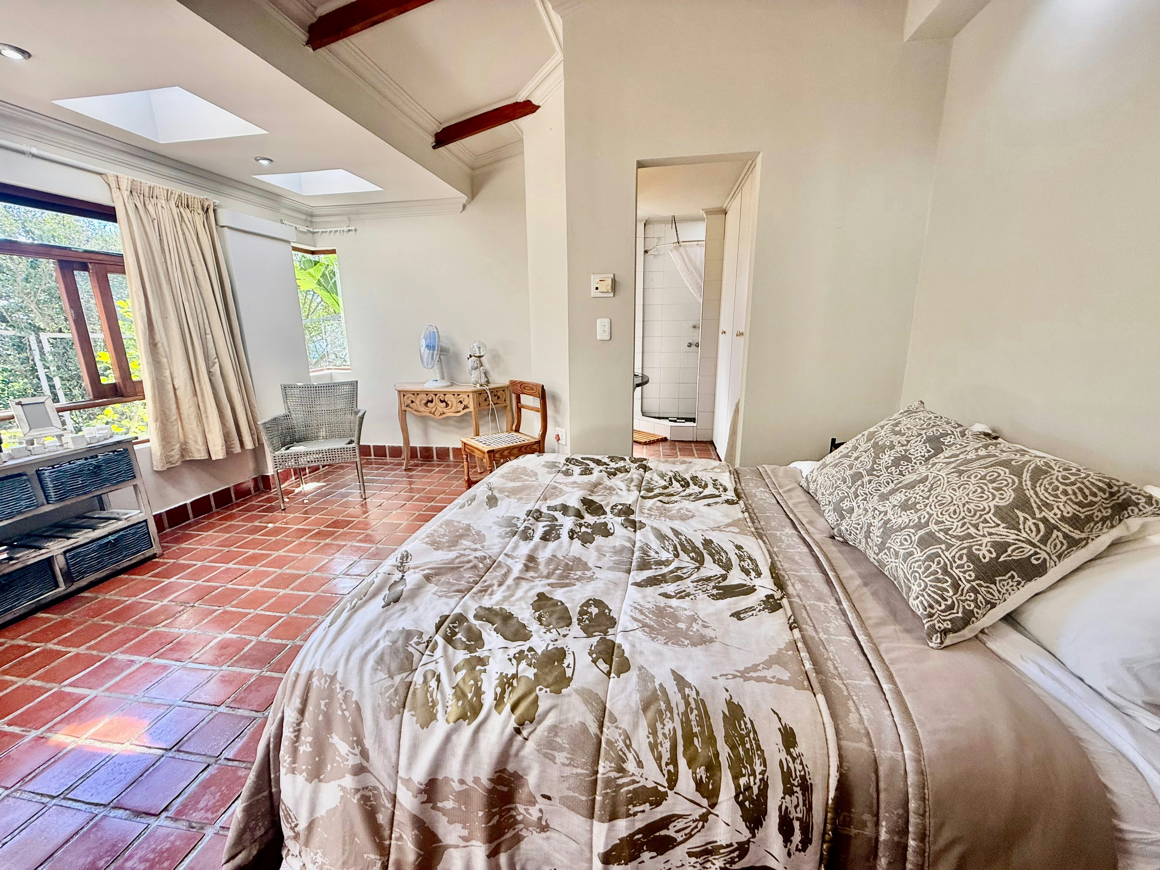 The spacious home comprises 4 bedrooms; the main bedroom is furnished with a king-size bed, a double sleeper couch for 2 children, and an en-suite bathroom fitted with a shower, bath, toilet, and basin. The second en-suite bedroom is furnished with a queen-size bed and an en-suite bathroom fitted with a shower, toilet, and basin. The third and fourth bedrooms are each furnished with a double bed and a shared bathroom with a shower and basin.