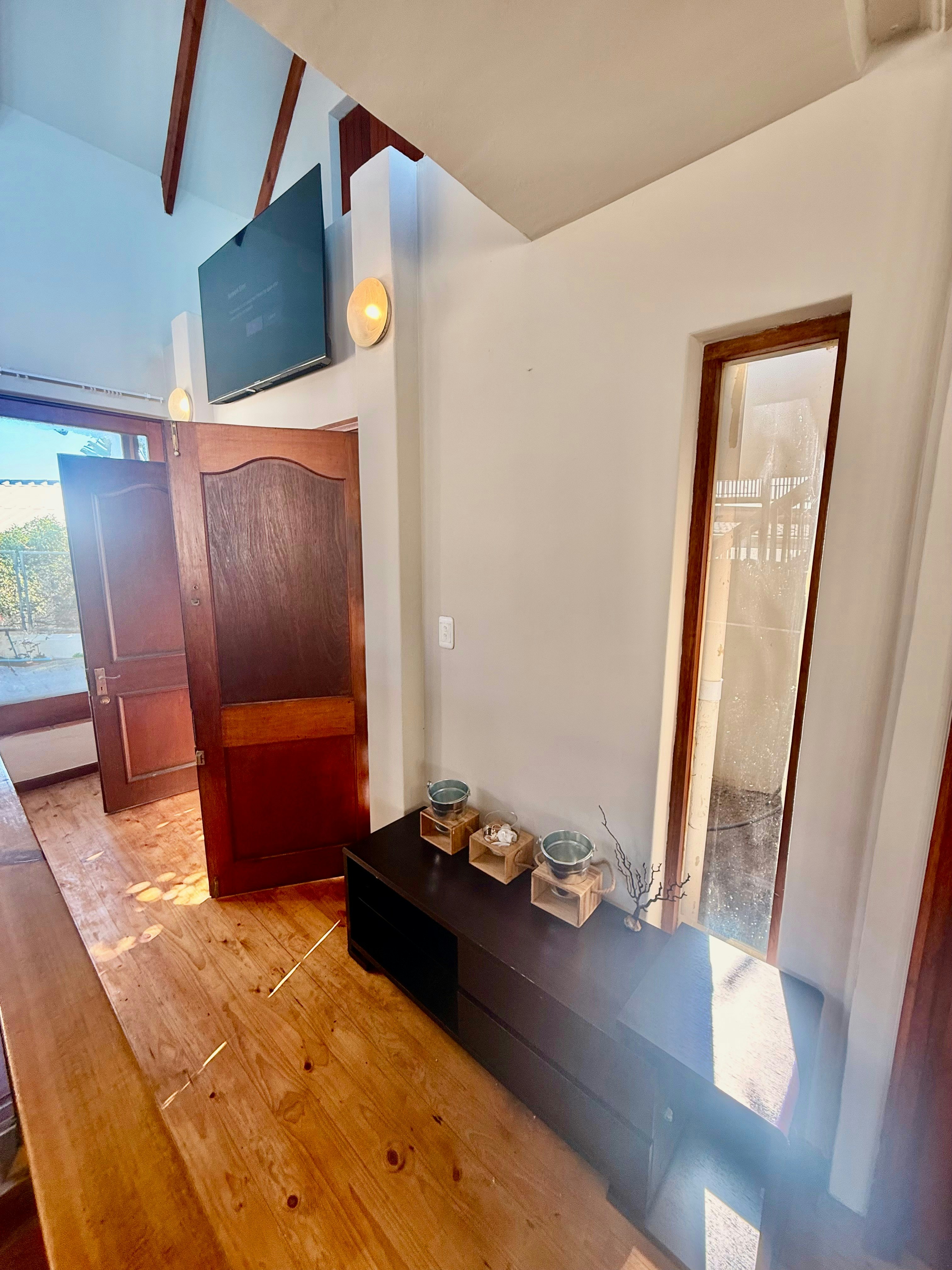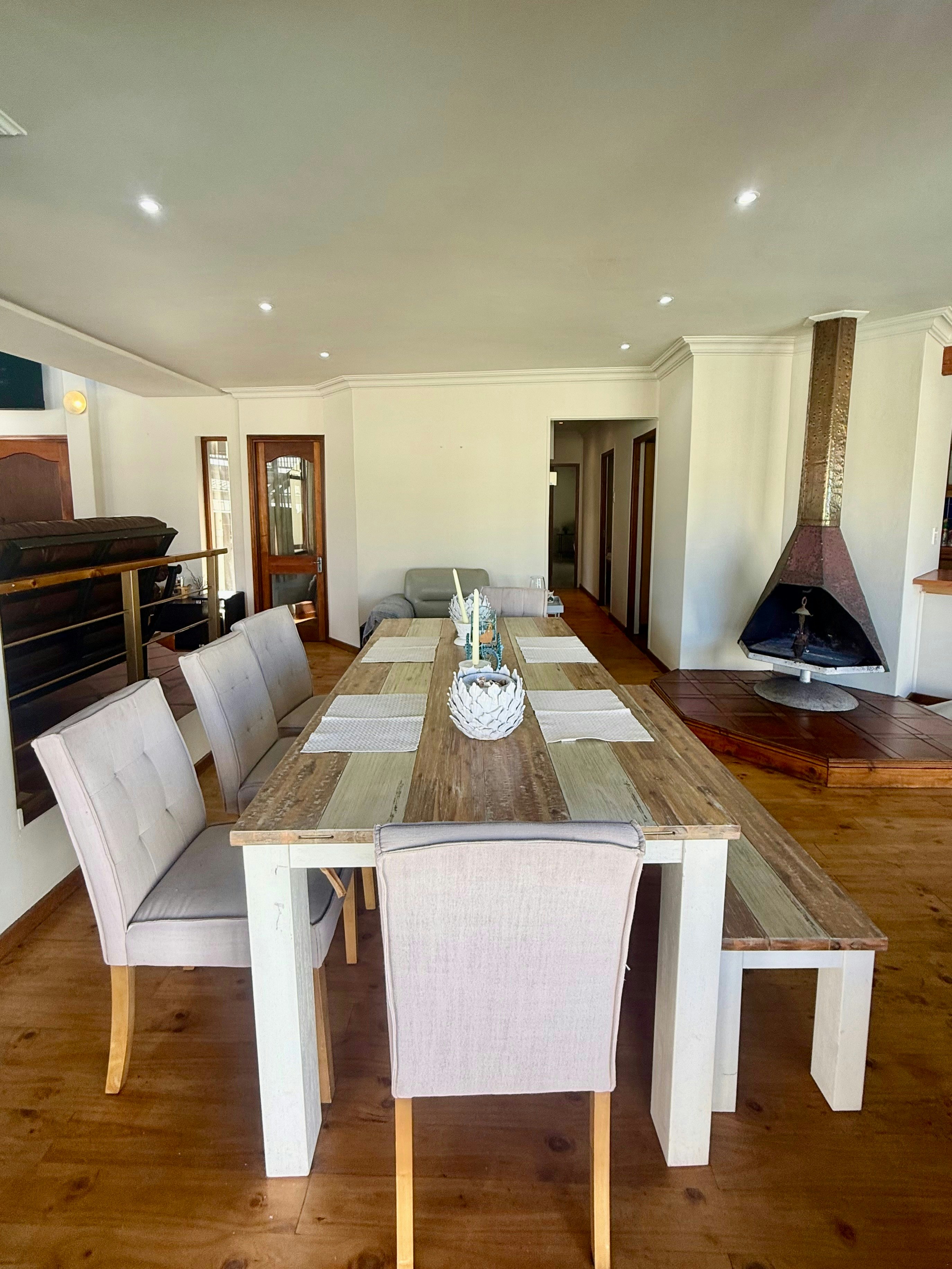 The fully equipped kitchen offers a stove, oven, cutlery, crockery, utensils, microwave, kettle, toaster, washing machine, dishwasher, and a fridge-freezer. The kitchen walks into the open-plan living area that offers a 6-seater dining table, an indoor fireplace, and a braai that walks out onto a deck with outdoor furniture. The lounge offers comfortable seating with a TV.