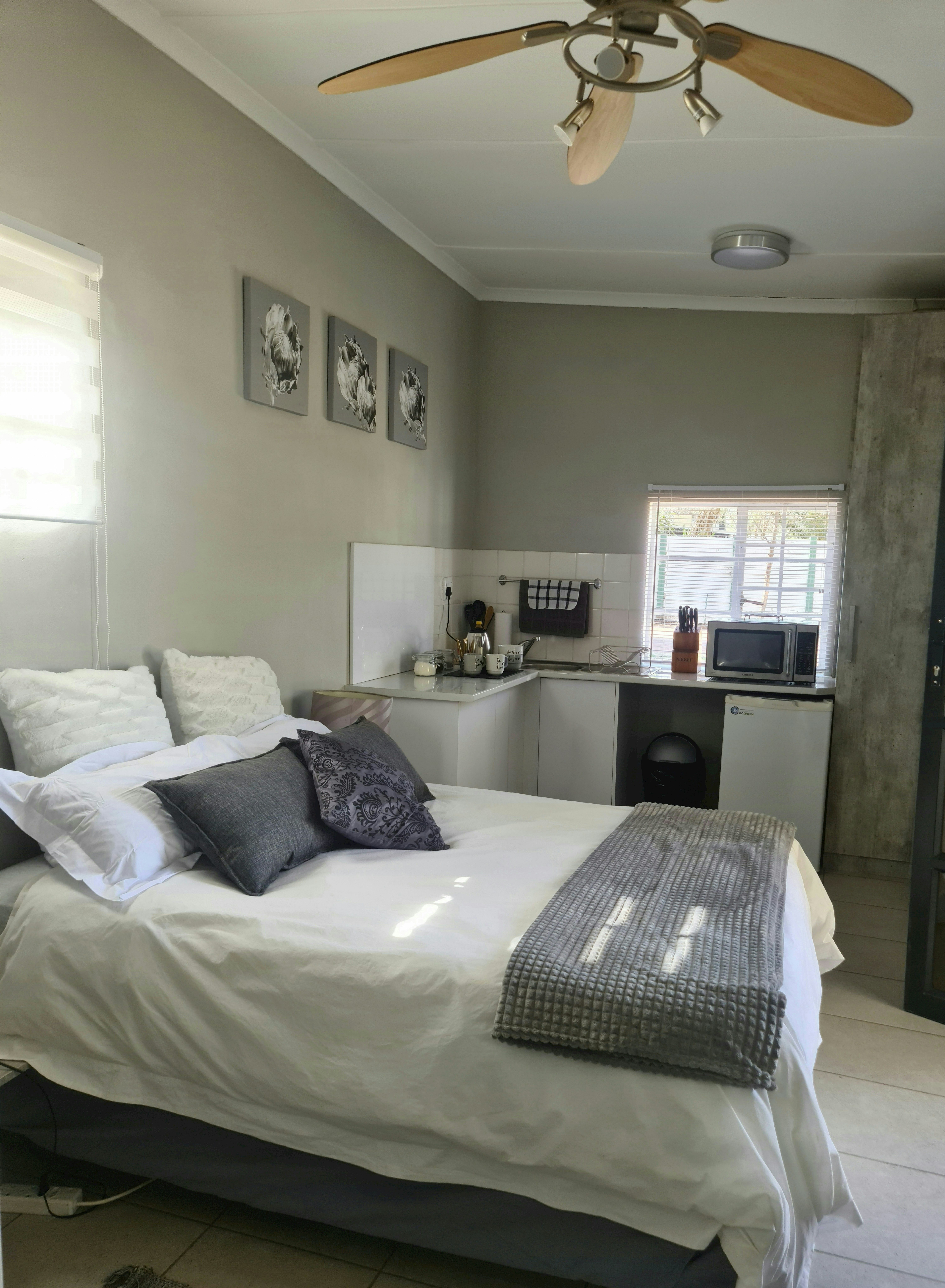 This open-plan cottage has a private entrance. It is furnished with a double bed and offers an en-suite bathroom fitted with a toilet, basin and shower. An electric blanket is available to the guests and a cot for a child under the age of 2 can be provided on request. The kitchenette is equipped with a bar fridge, microwave, toaster, 2-plate stove, cutlery, crockery, and tea- and coffee-making facilities. Wash and iron facilities are also available on the premises. Free Wi-Fi and a TV with Netflix, Showmax, Disney+ and YouTube are available. The unit also features air-conditioning. Guests have their own private patio area with outdoor furniture and a braai. There is a communal swimming pool on the premises that guests have access to.