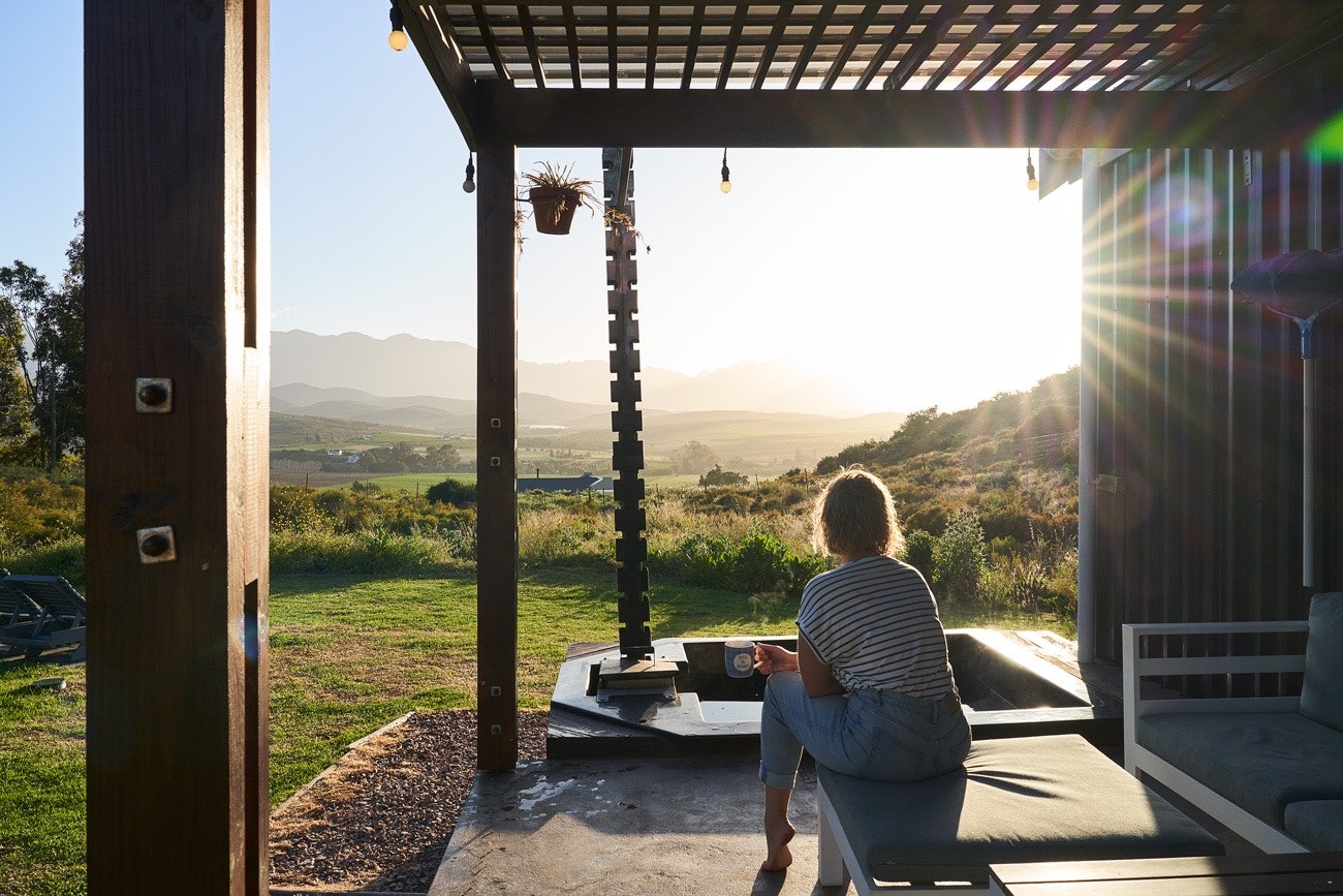 There is a lovely covered patio with outdoor seating, a built-in braai and a wood-burning hot tub.