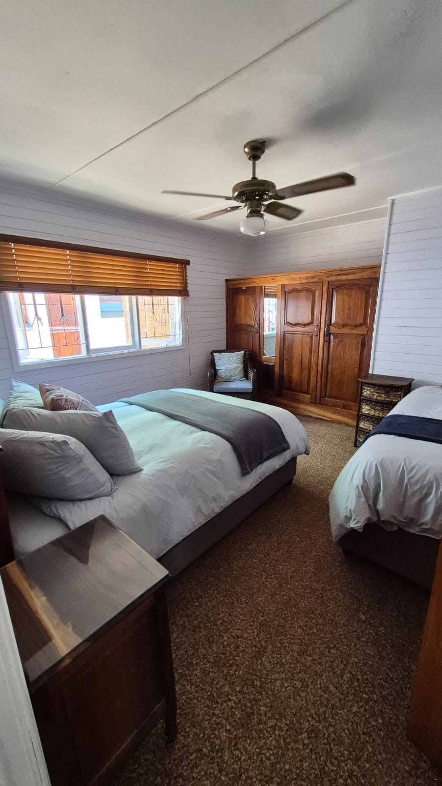 The house features 4 bedrooms. The main bedroom has a single bed and a double bed. The second bedroom has a single bed, while the third bedroom has a single bed and a bunk bed. The 4th bedroom offers outside access and has a bunk bed, and has an en-suite toilet and a basin. Bed linen is provided for all rooms. One bathroom has a toilet, basin and a shower-over-bath. There is also a guest toilet.