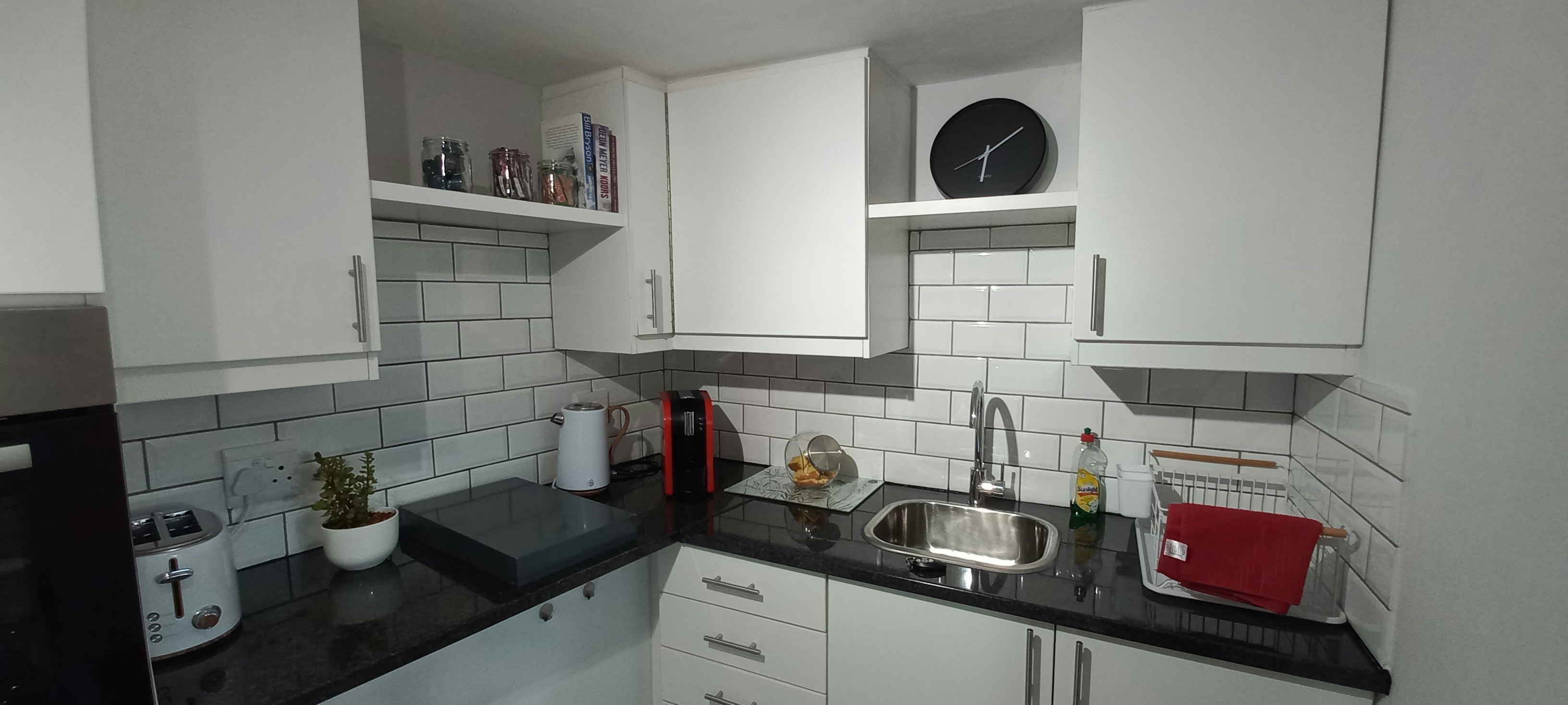 Die kombuisie is met 'n ketel, koffiemasjien, broodrooster, yskas-vrieskas, tweeplaat-gasstoof en 'n oond toegerus.